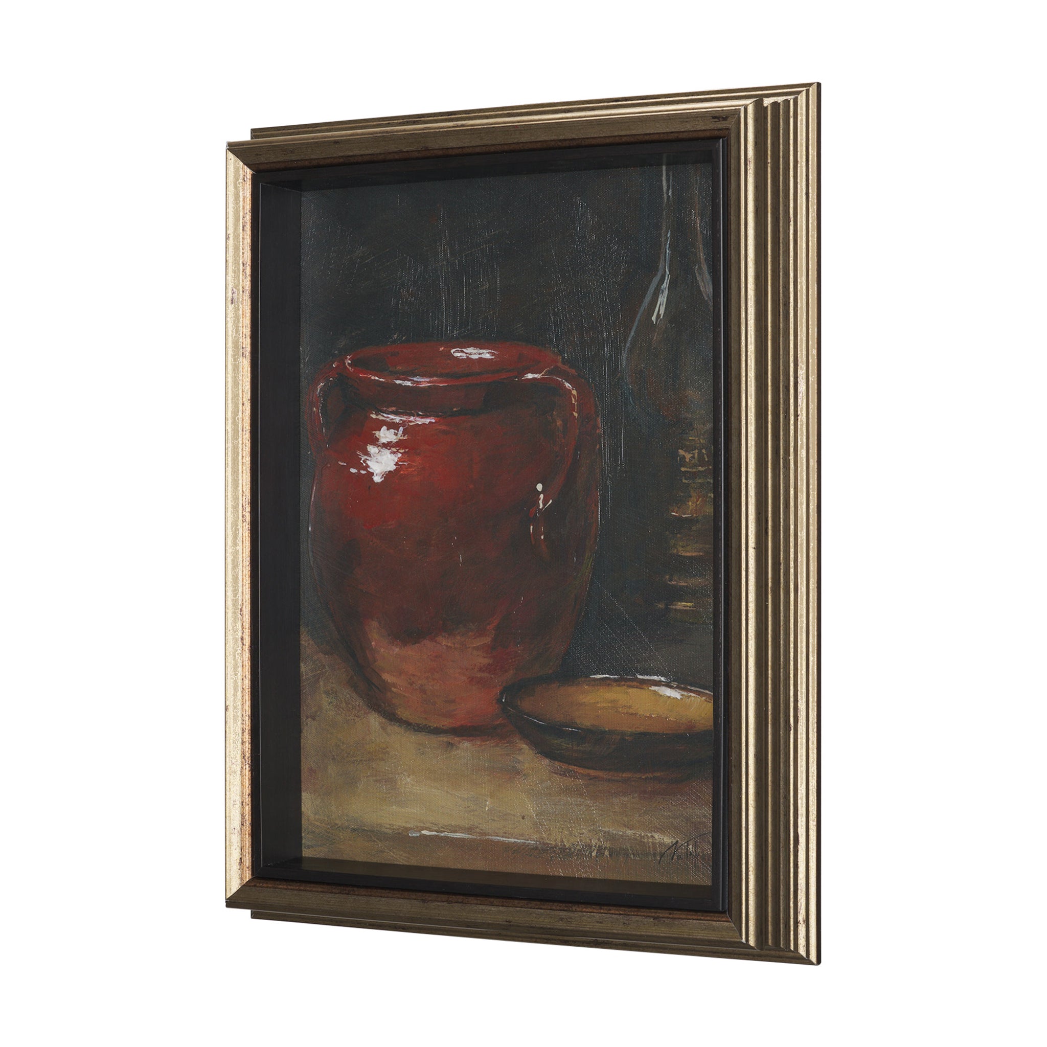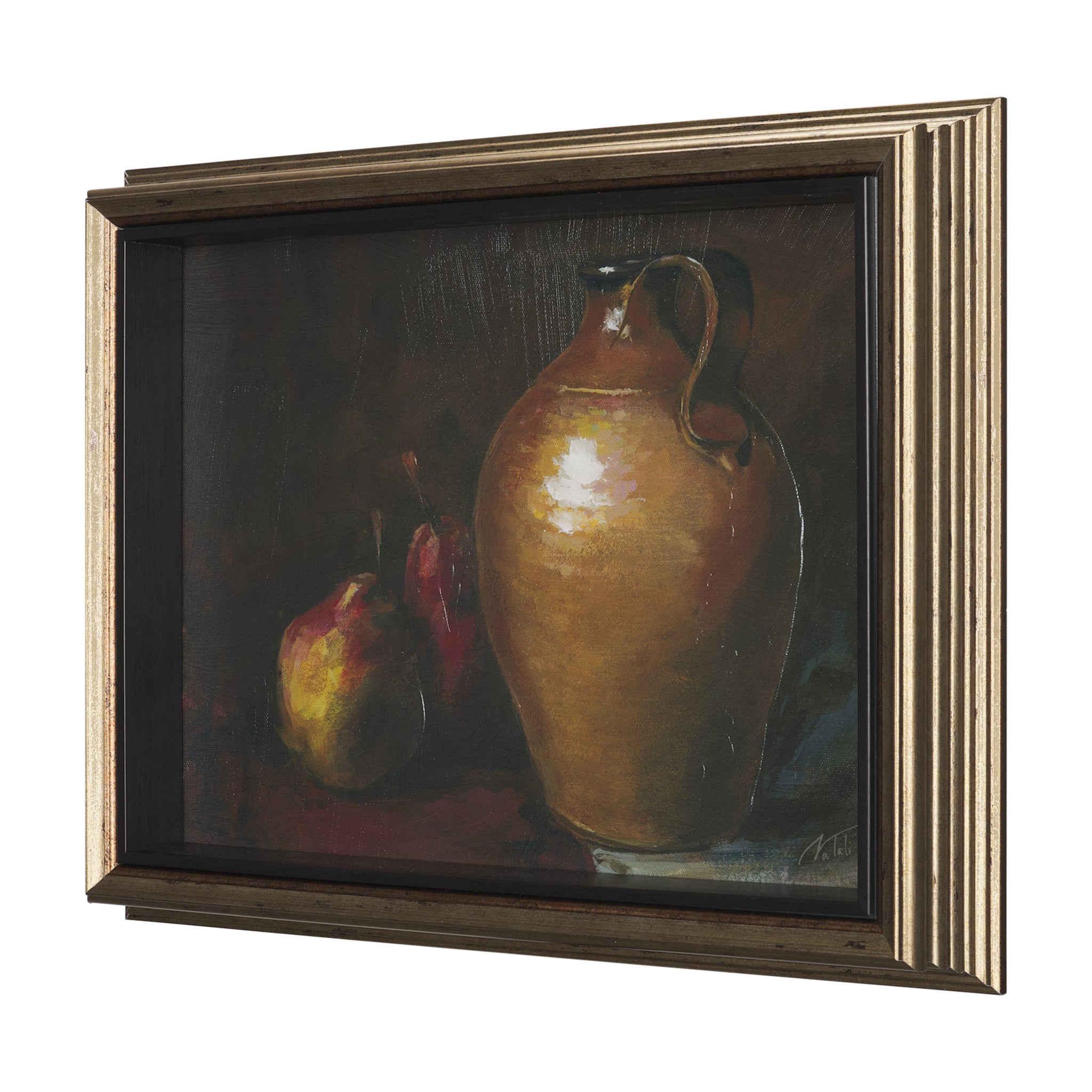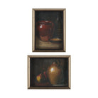 Enrich your home with the timeless elegance of this two-piece framed still life collection. Each piece showcases classic rustic objects—from a robust earthenware jug and fruit to an ancient pot and lamp—rendered with dramatic chiaroscuro lighting against rich, dark backgrounds. Encased in ornate gold frames, this set evokes a warm, traditional ambiance, perfect for adding depth and character to your kitchen, dining room, or study.