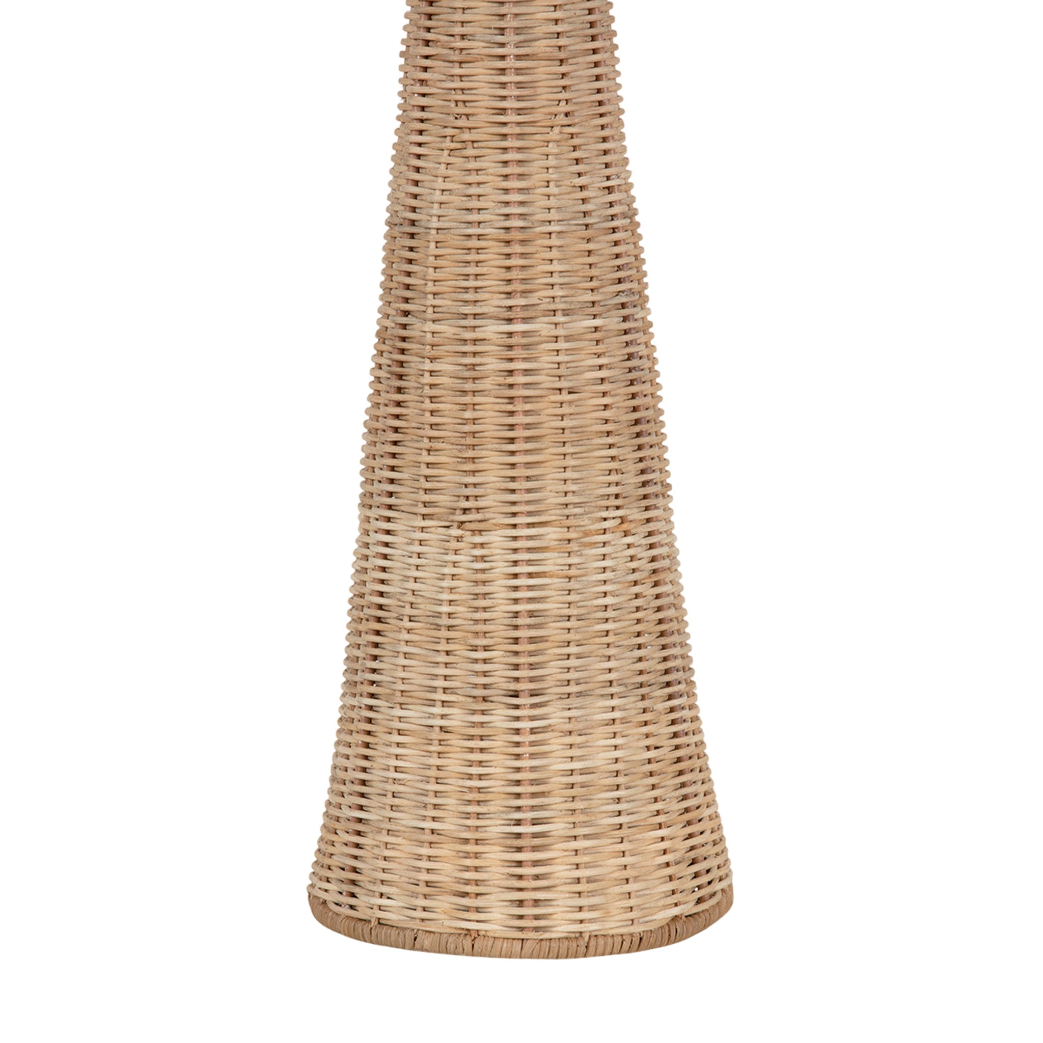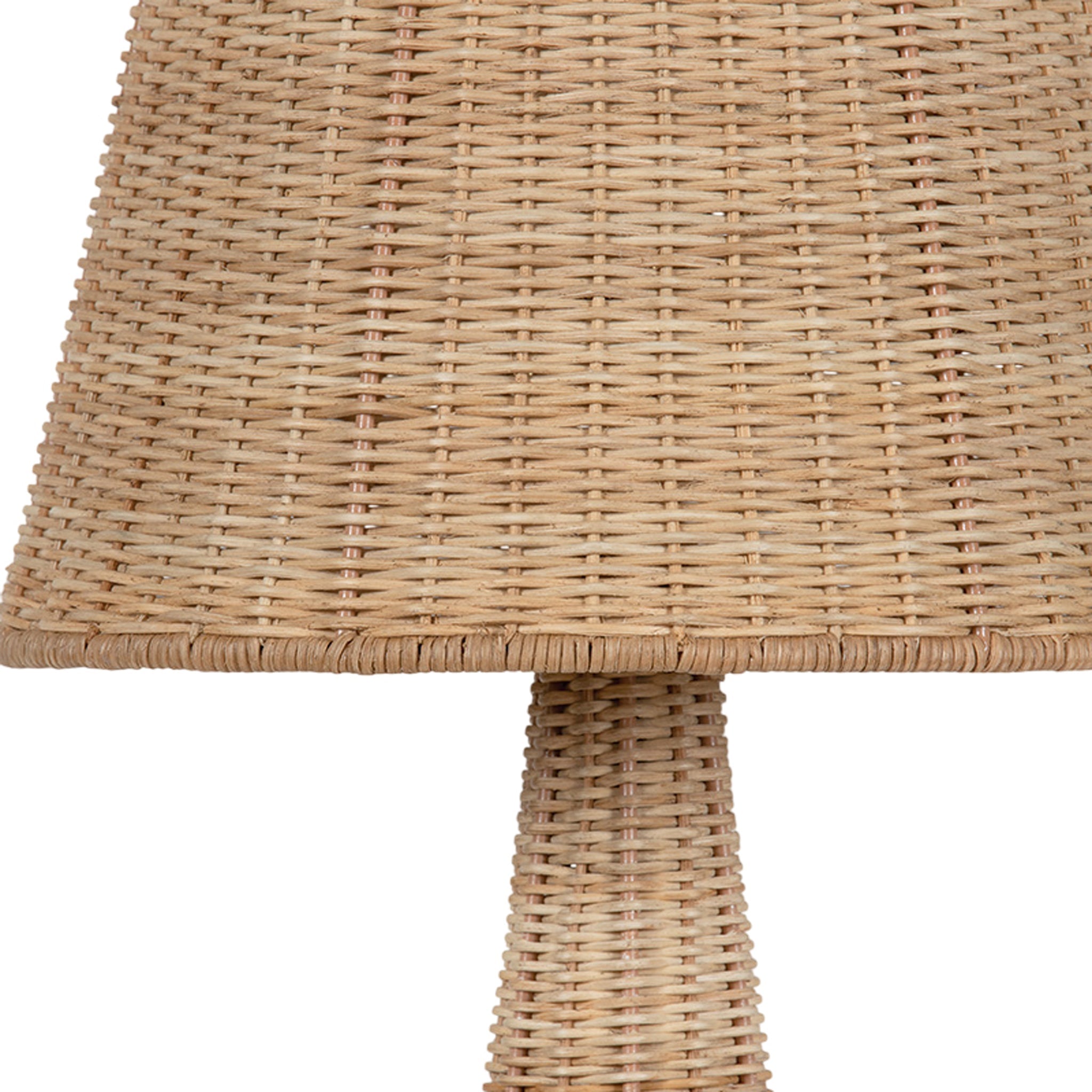 Merging the organic materiality of rattan wicker with a fashion-forward frame, Fair Haven masters the grand millennial aesthetic. Resembling the elegant flow of a skirt, the wicker base tapers in at the top, allowing light to shine over the intricate weave. The Aged Brass hardware complements the approachable warmth of the rattan. A light and voluminous addition to bedside tables and living room consoles, Fair Haven is a joy to behold.