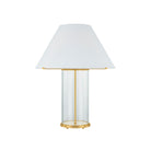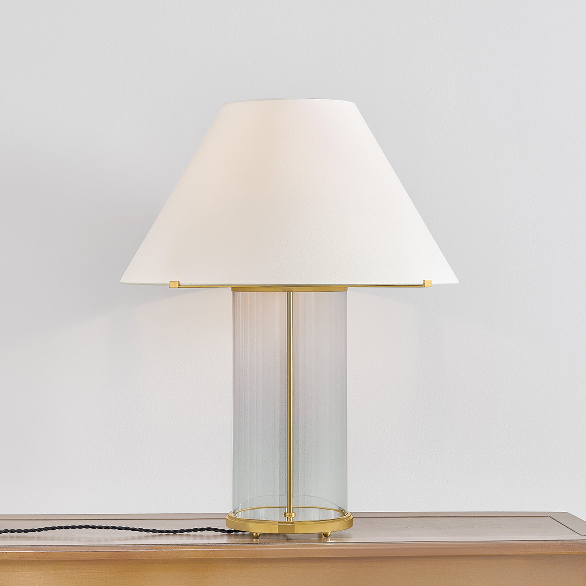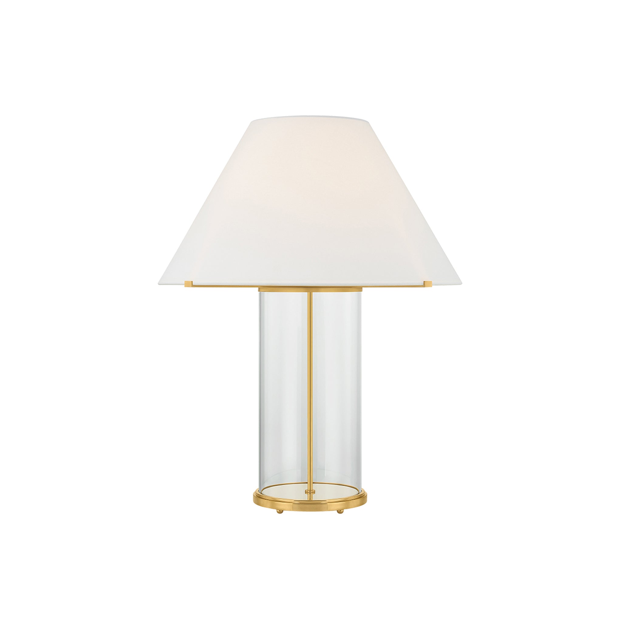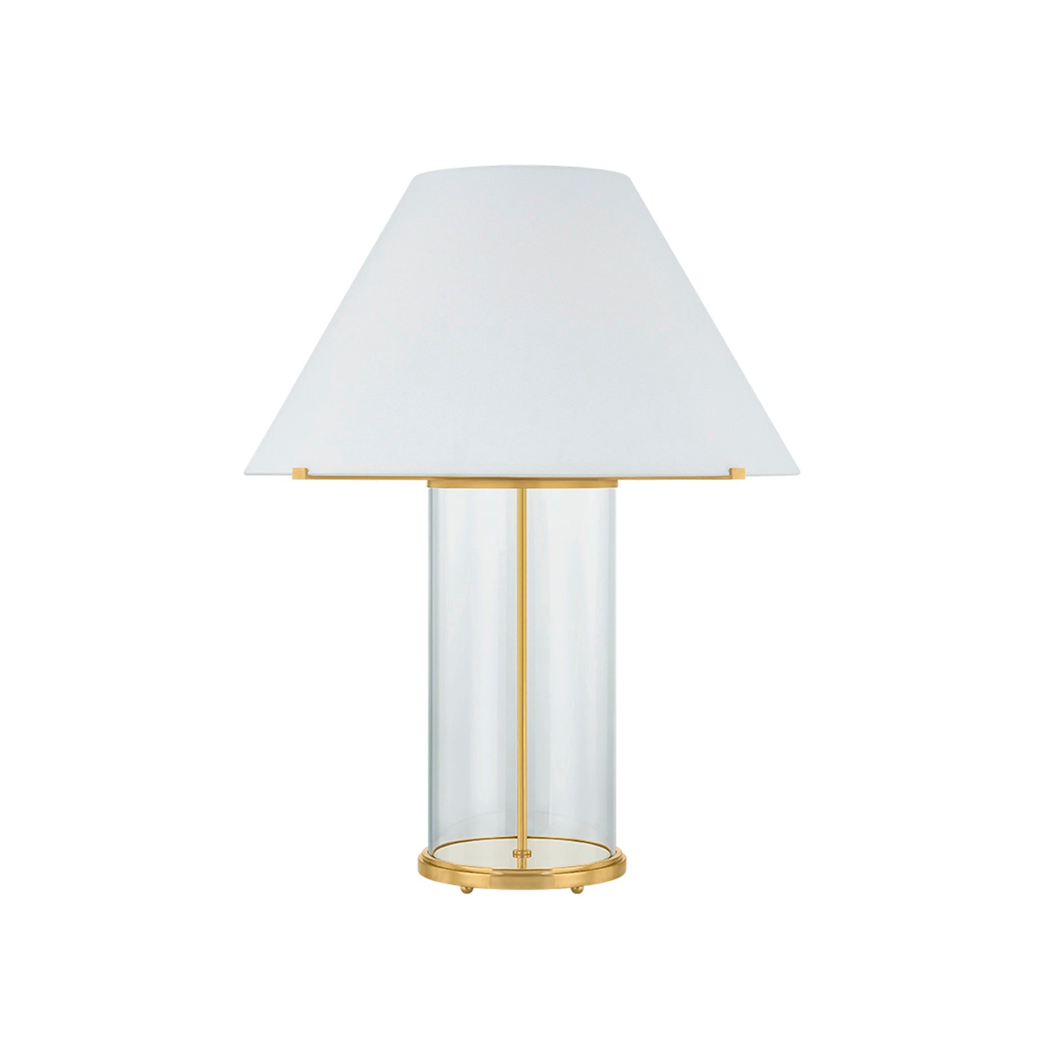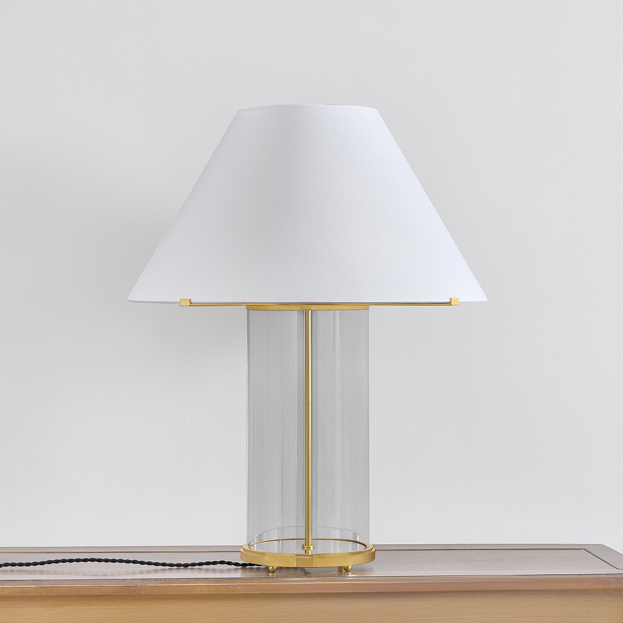 A continuation of the crowd-pleasing Leeds family, the handsome Inglewood lamp features a modern clear glass base and Mark D. Sikes' signature resting shade. The base beautifully catches the light, as do the timeless Aged Glass accents. Topped with a white linen shade, the design is clean and minimal - capable of being used in a variety of interior spaces. Mark D. Sikes for Hudson Valley Lighting.