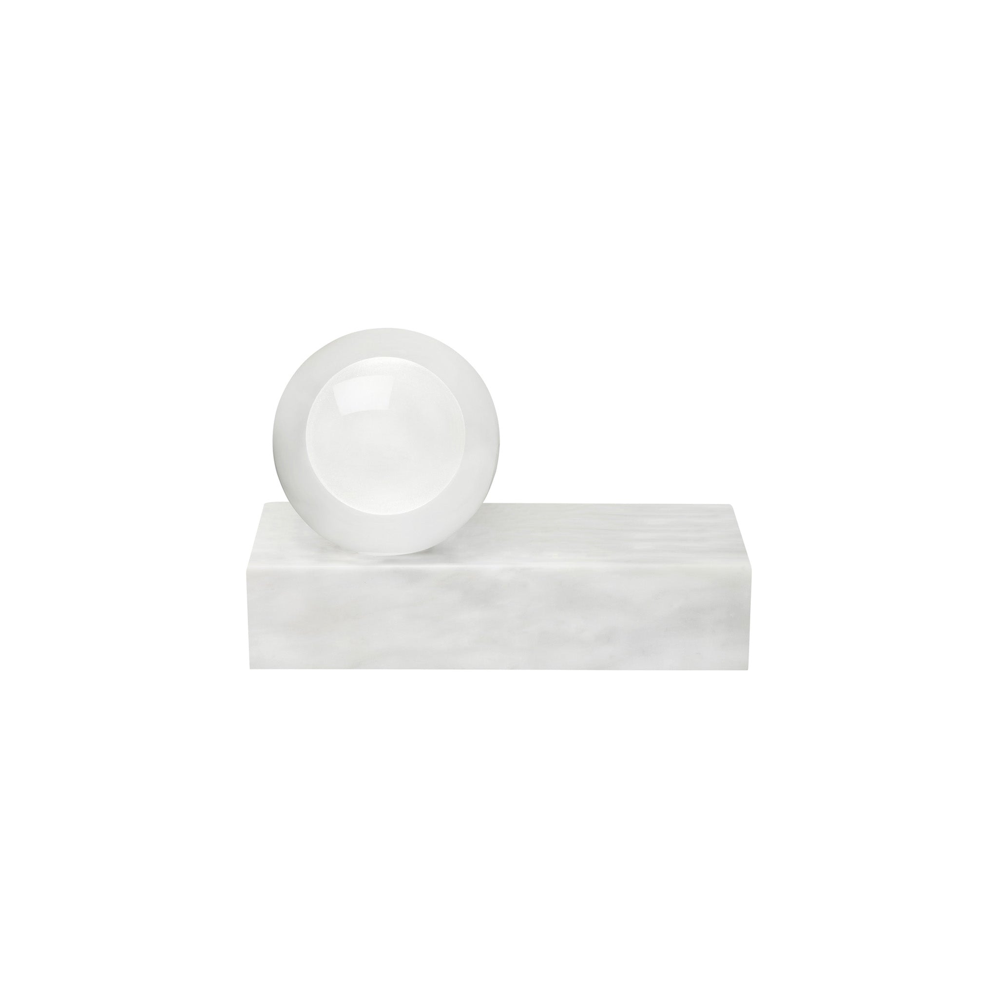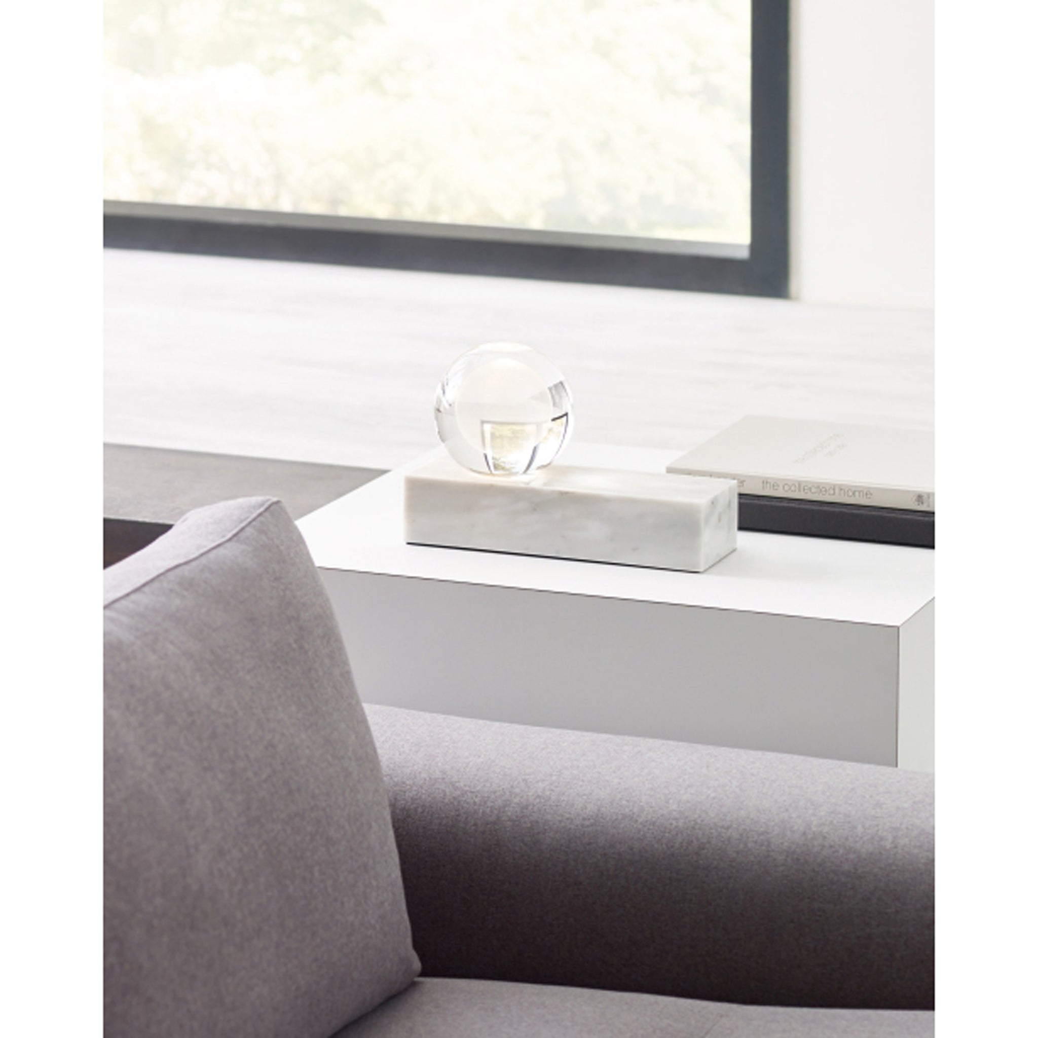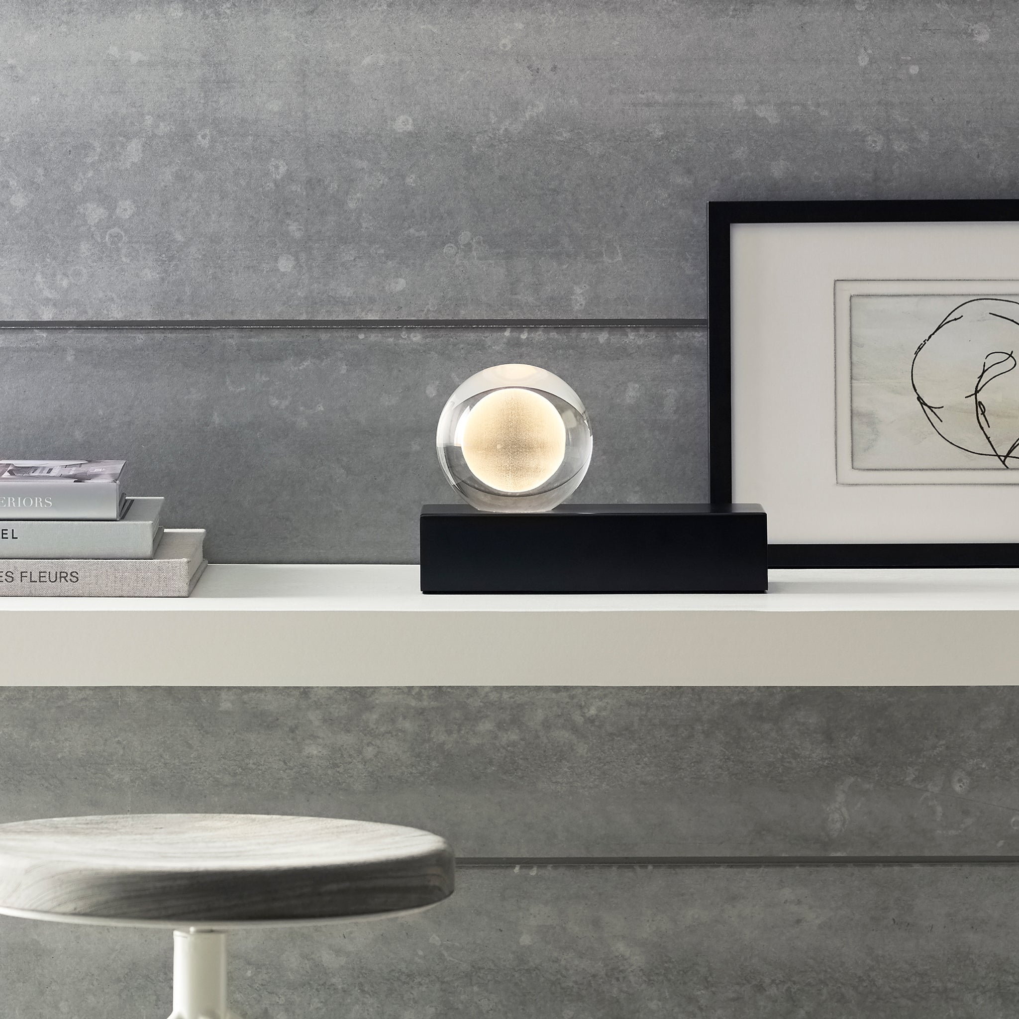 The Mina Table Lamp by Sean Lavin for Visual Comfort Modern features an elegant sphere of pure optic crystal elegantly resting on a metal or marble base. This beautiful orb is laser-etched and further illuminated by a powerful firing hidden LED making this a glowing work of art when illuminated and modern décor when unilluminated. Available in modern finishes. Designed with an integrated 3-step touch dimmer conveniently designed to achieve your desired ambiance. Complete the look with coordinating Mina Wall Sconce and Line-Voltage Pendants.
