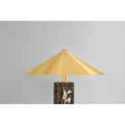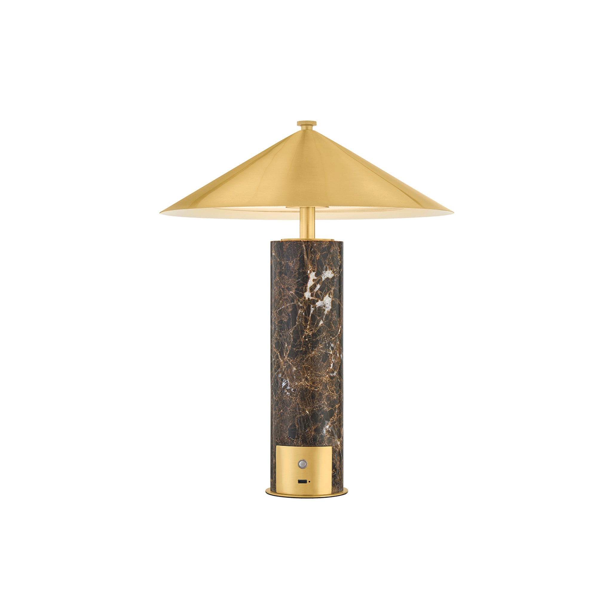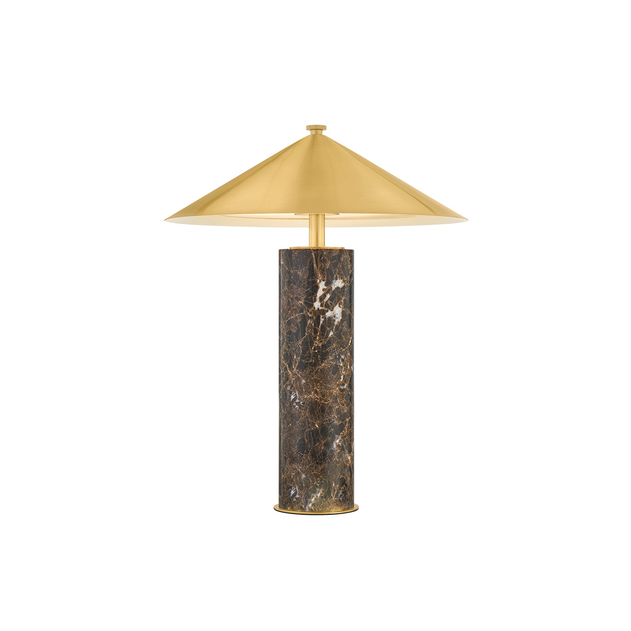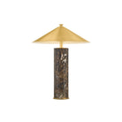 While compact in scale, the Permont table lamp makes a design-forward statement. This LED lamp's sharply tapered metal shade is finished in Aged Brass with a luxurious honed Emperador marble base. The natural veining of the stone comes to life when illuminated, giving this piece its one-of-a-kind beauty.
