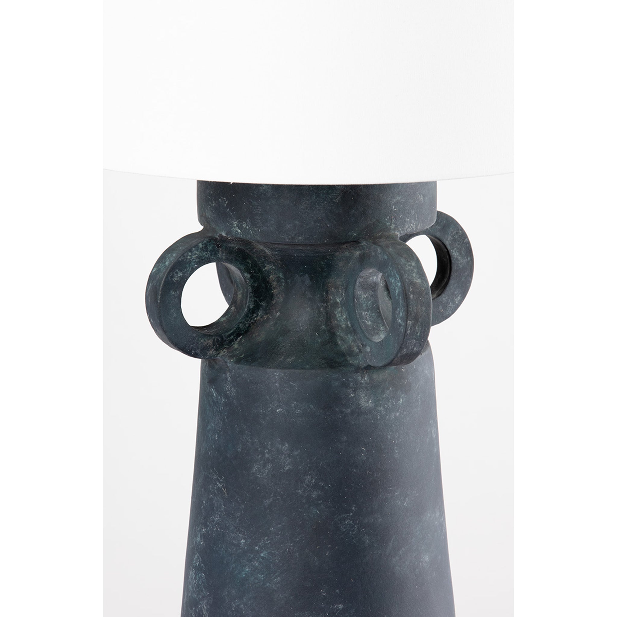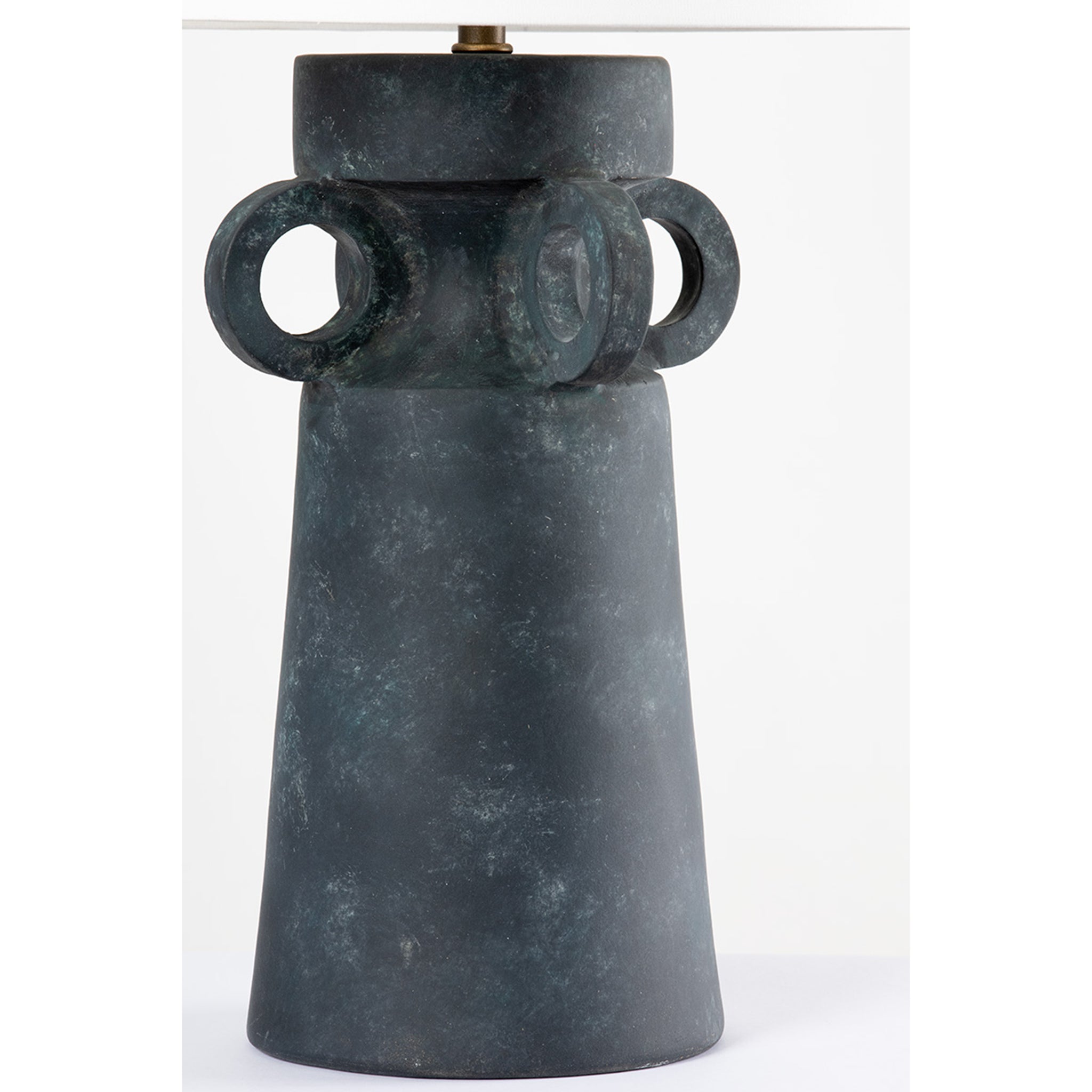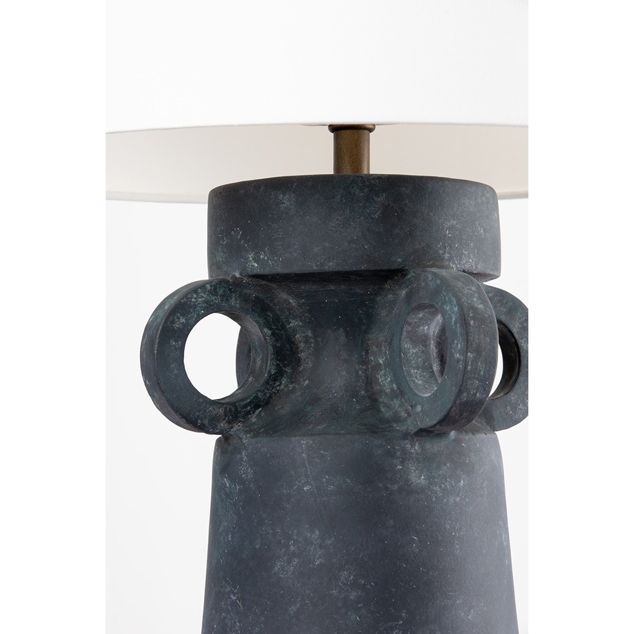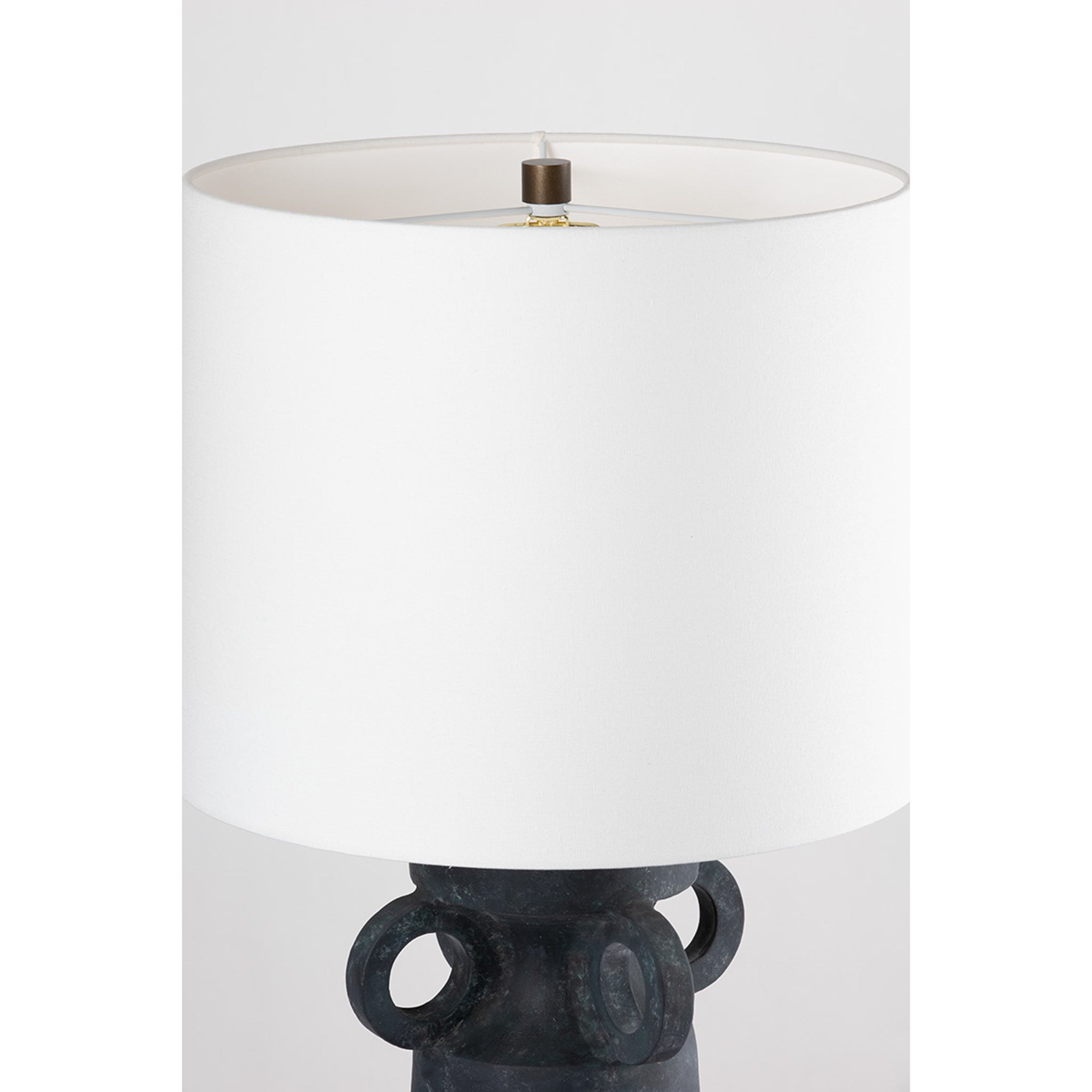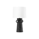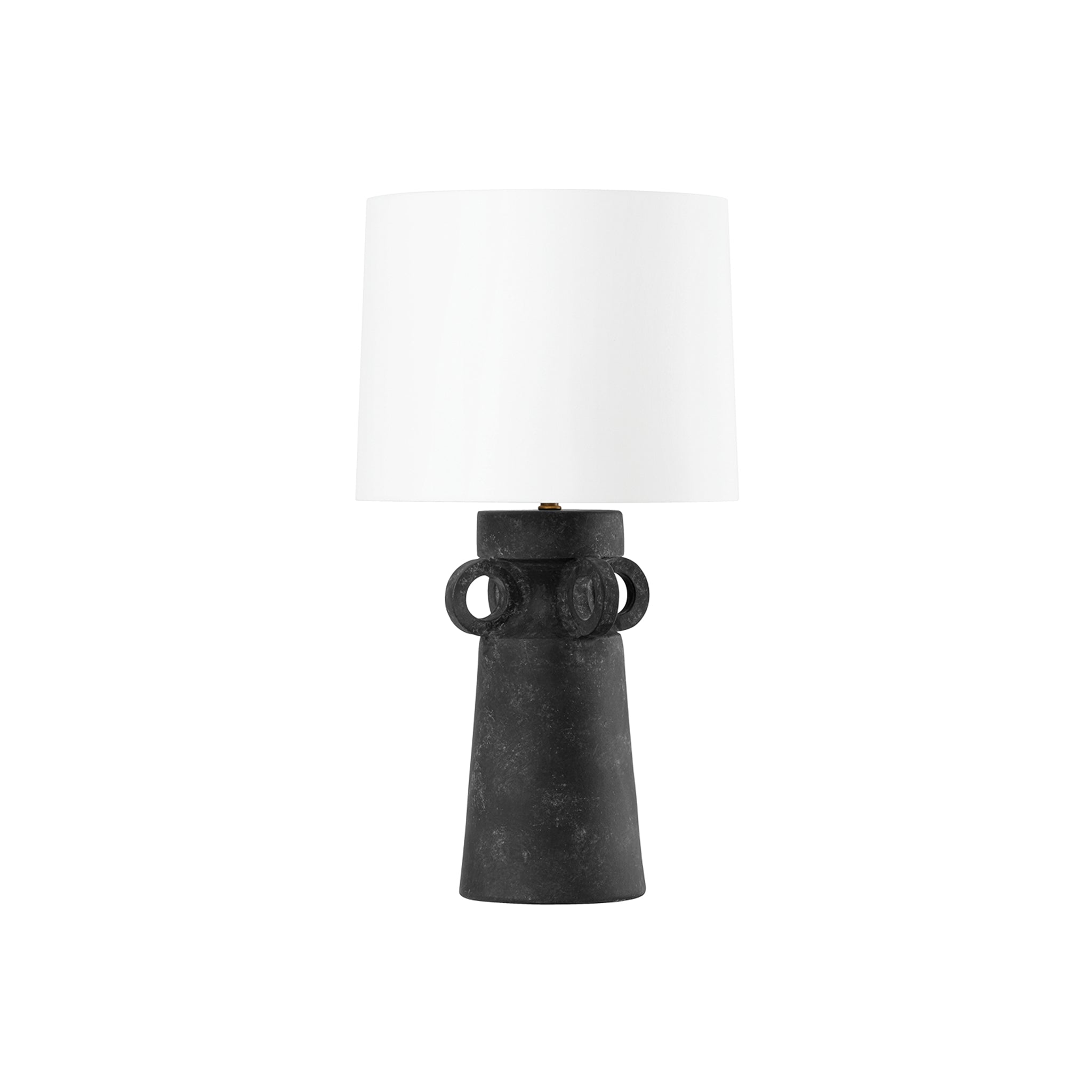 The artifact black ceramic sculptural base gives this modern table lamp an earthy, weathered look that makes it feel like an ancient hand-crafted treasure. The white linen drum shade adds contrast and warmth. Santa Cruz makes a stunning statement on any tabletop.