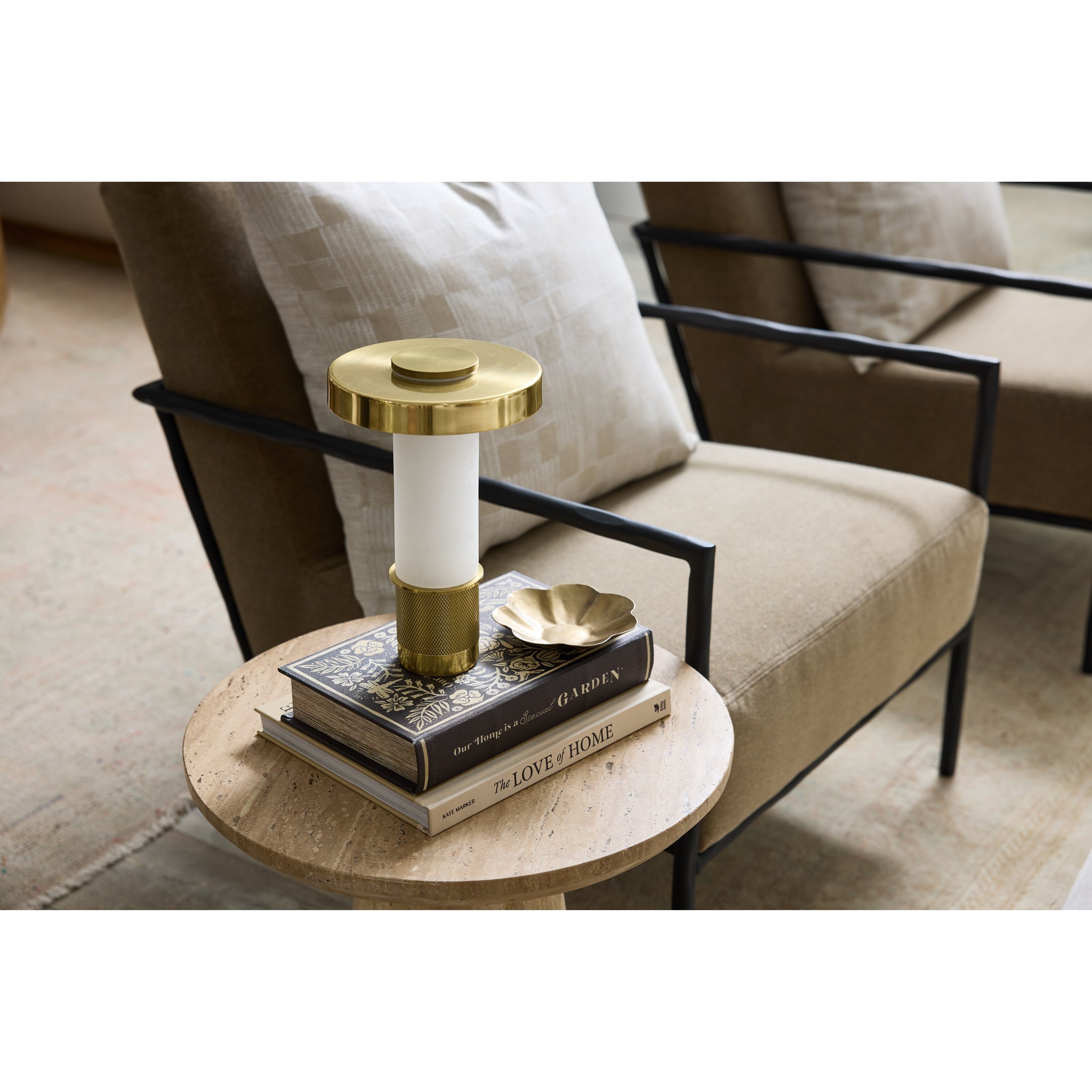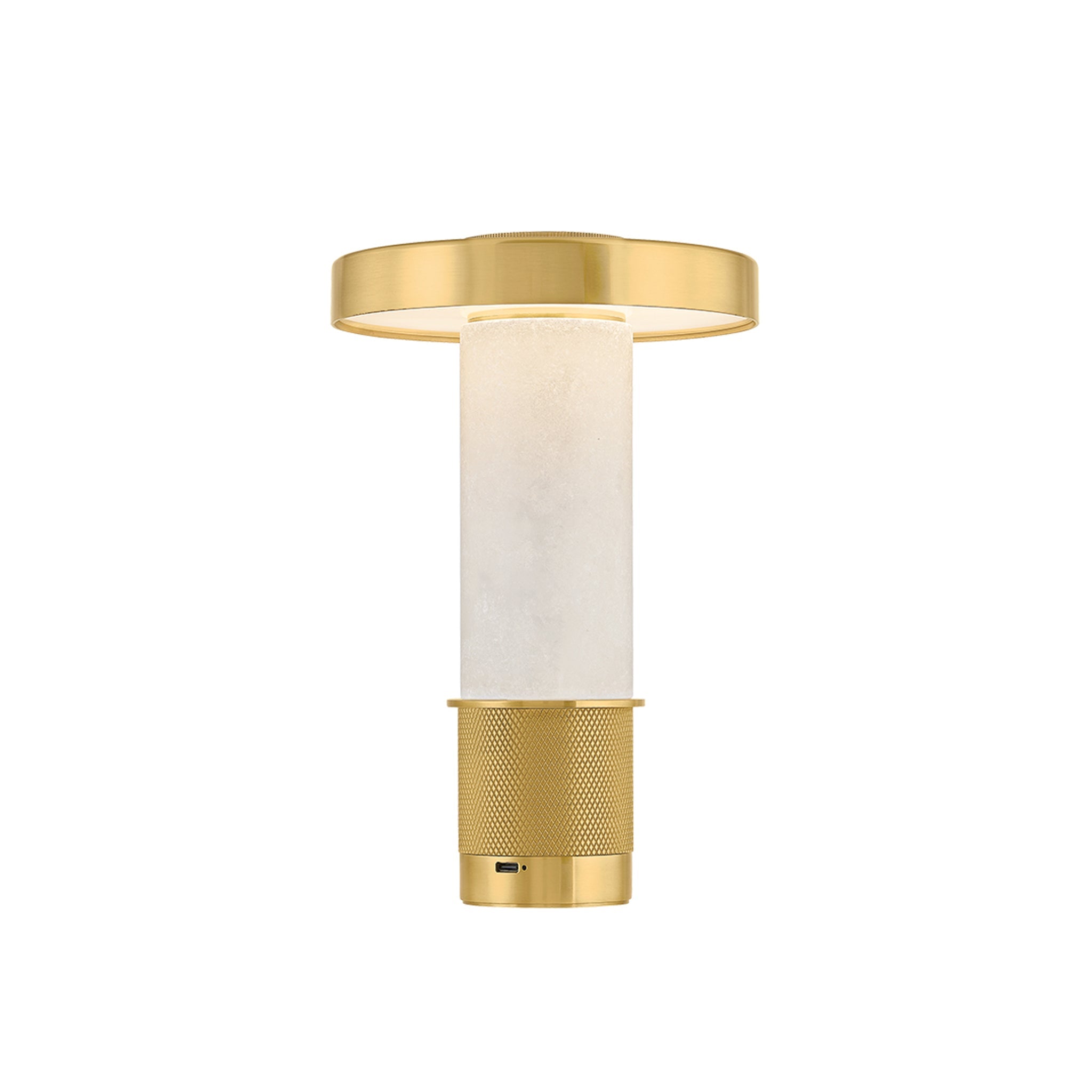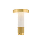 Petite and portable, the Sefton table lamp exudes architectural finesse. This dimmable accent lamp combines an exquisite alabaster tube with a machined metalwork base for a high style statement. The perfectly cylindrical shade, finished in reflective Aged Brass, completes the dynamic design. The battery life of Sefton is dependent on the brightness level set by the user, and it recharges in 3. 5 hours. This mini lamp can also be used while charging.