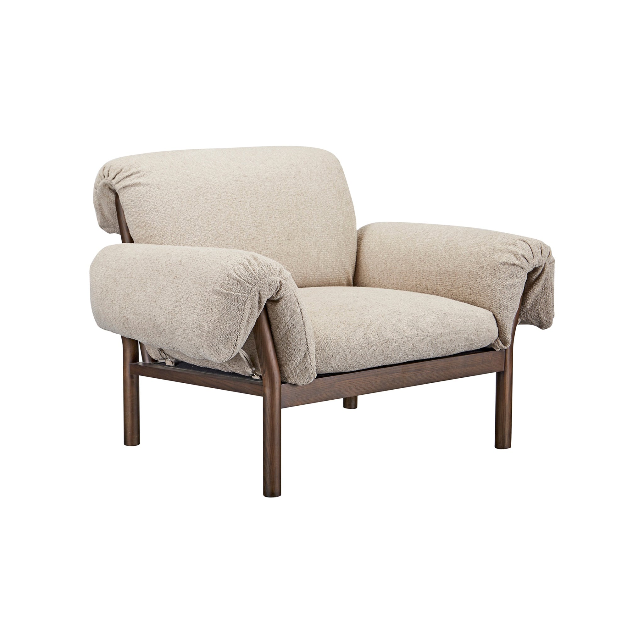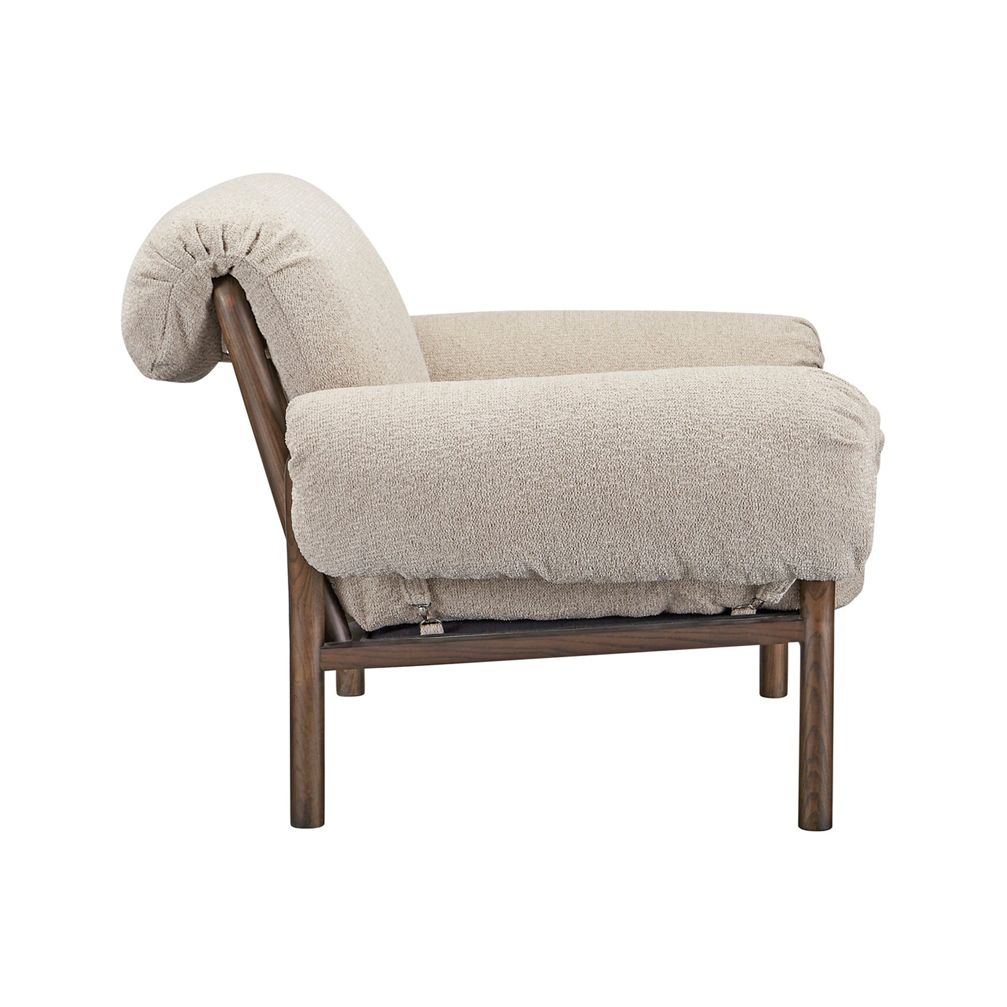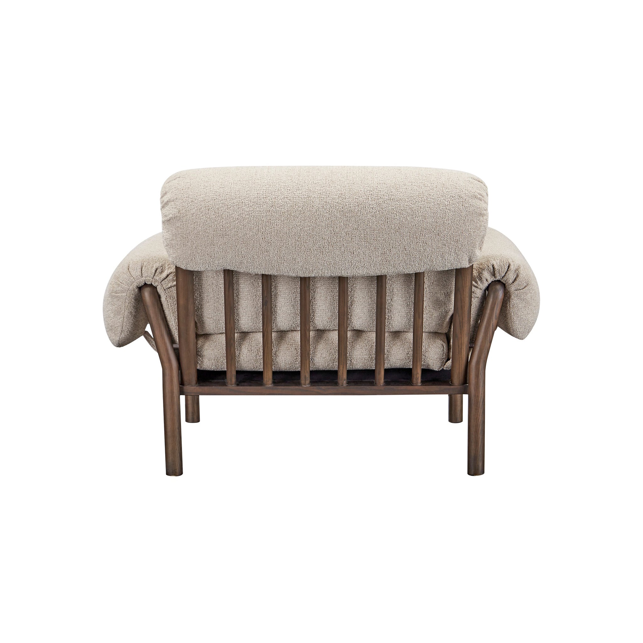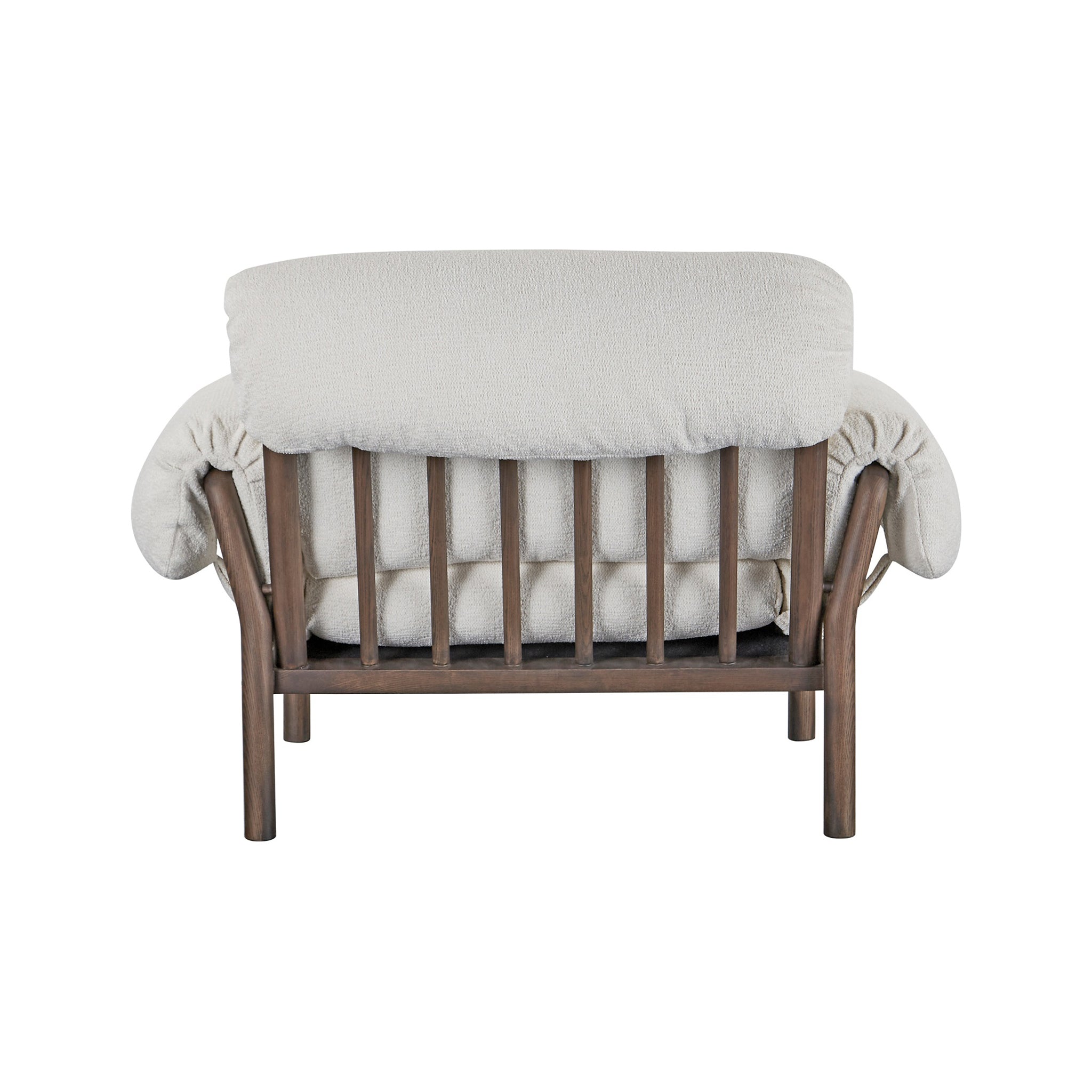 The Celio lounge chair's solid ash frame, stained to a rich dark finish, showcases nature's artistry through intricate grain patterns. Timeless spindle back and flared wooden arms complement the generously proportioned seat and feather and fiber fill, inviting serene relaxation. Fold-over details with ruche texturing and tie detail add a touch of casual sophistication.