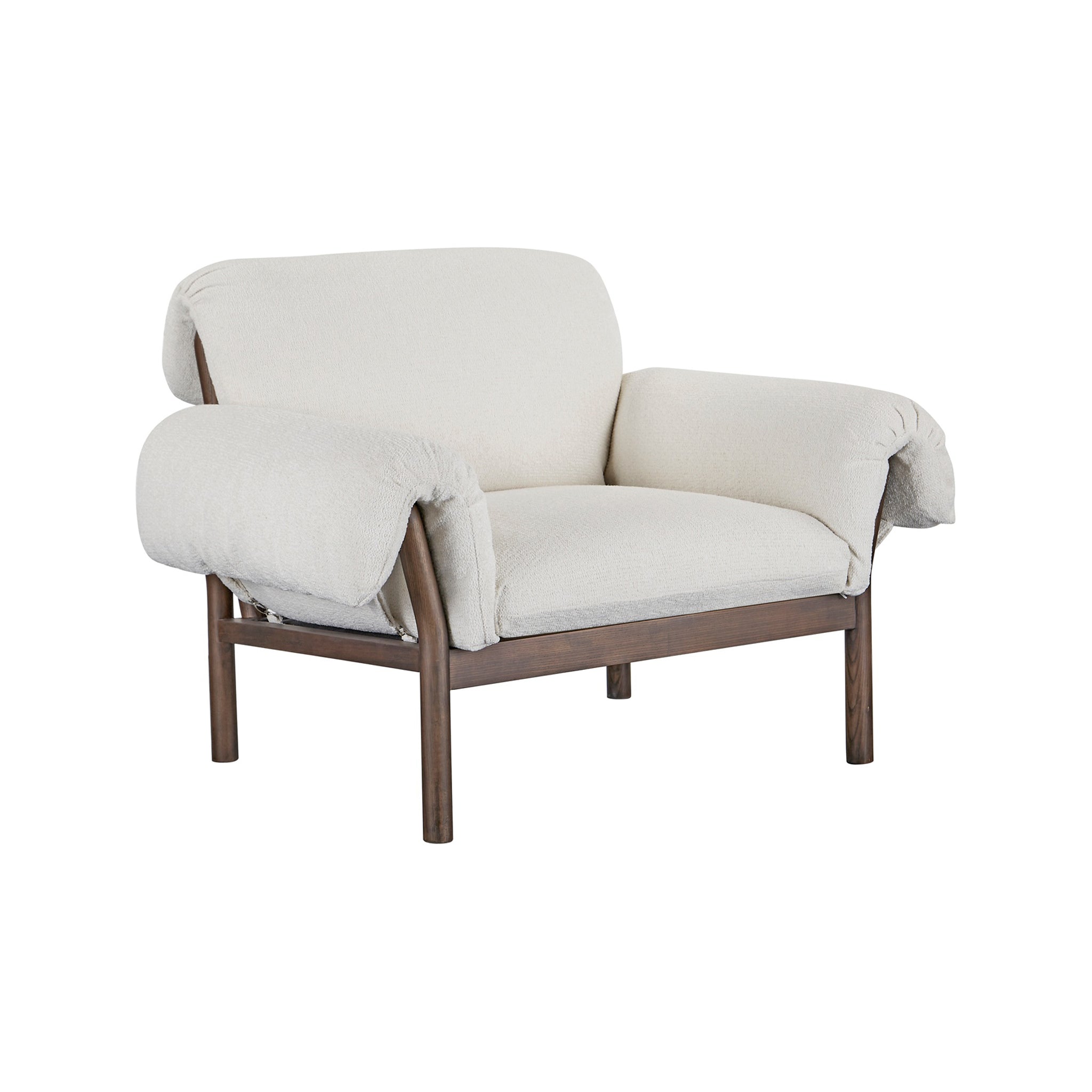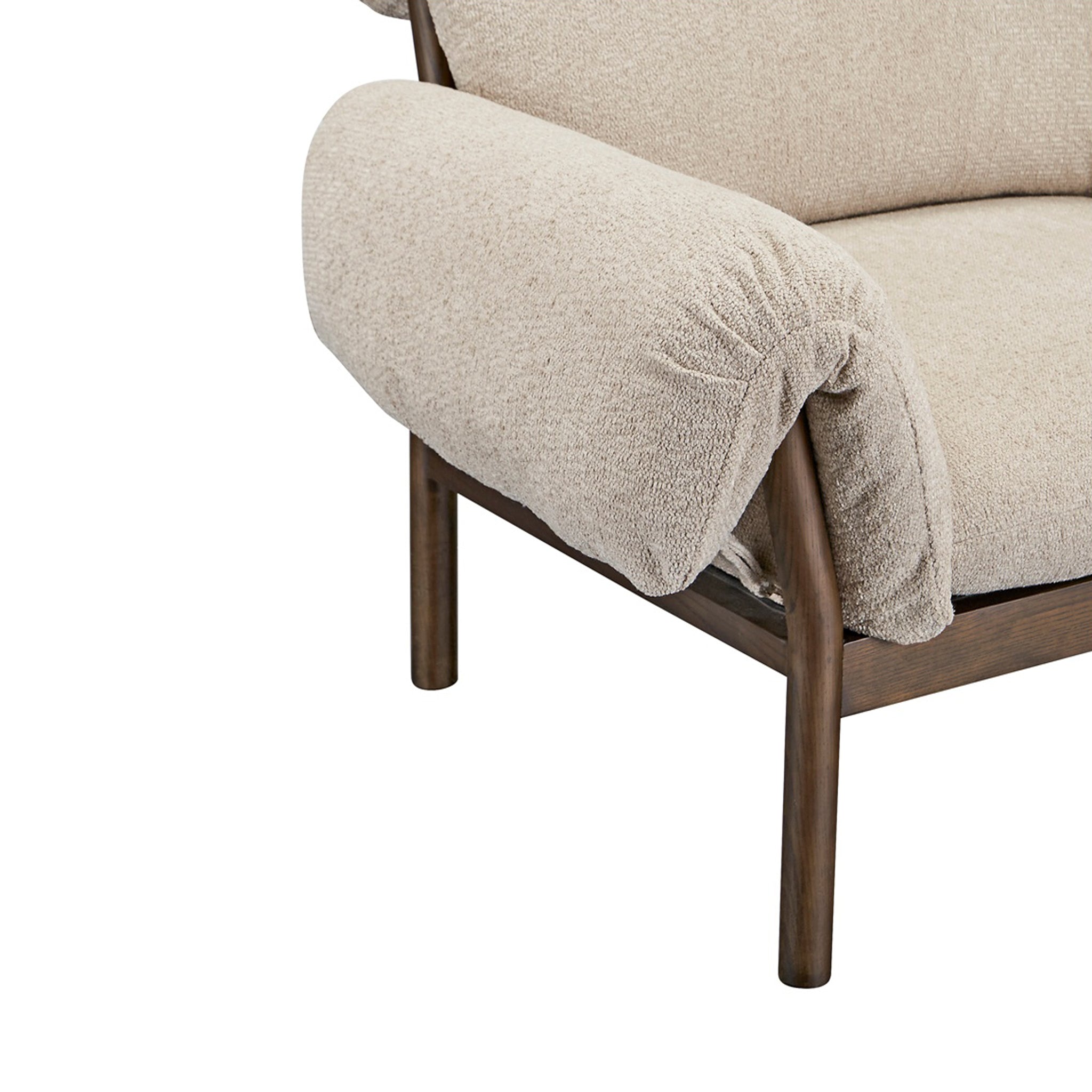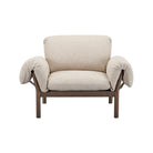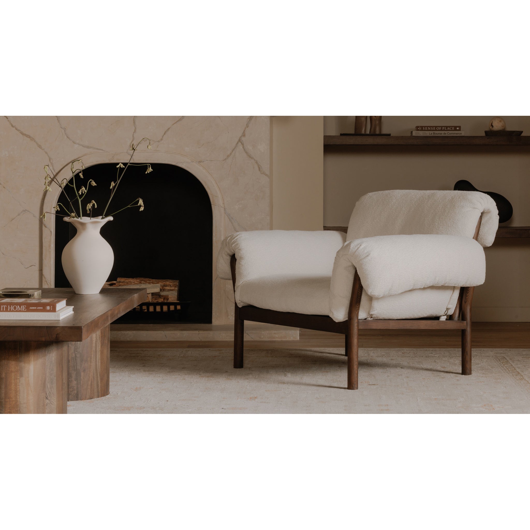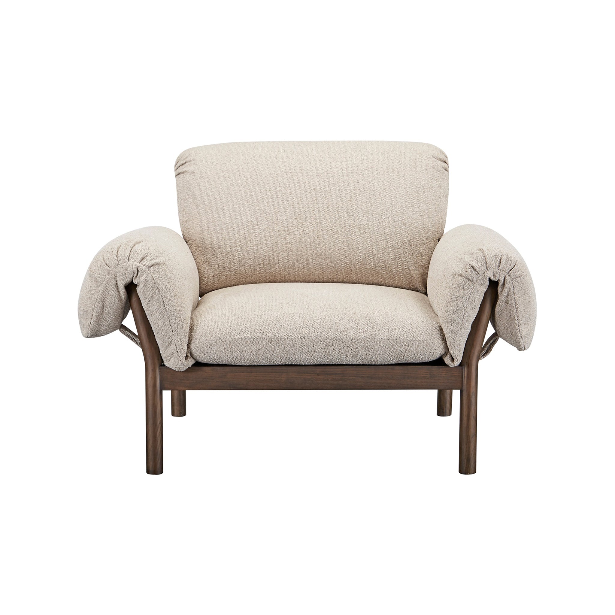 The Celio lounge chair's solid ash frame, stained to a rich dark finish, showcases nature's artistry through intricate grain patterns. Timeless spindle back and flared wooden arms complement the generously proportioned seat and feather and fiber fill, inviting serene relaxation. Fold-over details with ruche texturing and tie detail add a touch of casual sophistication.