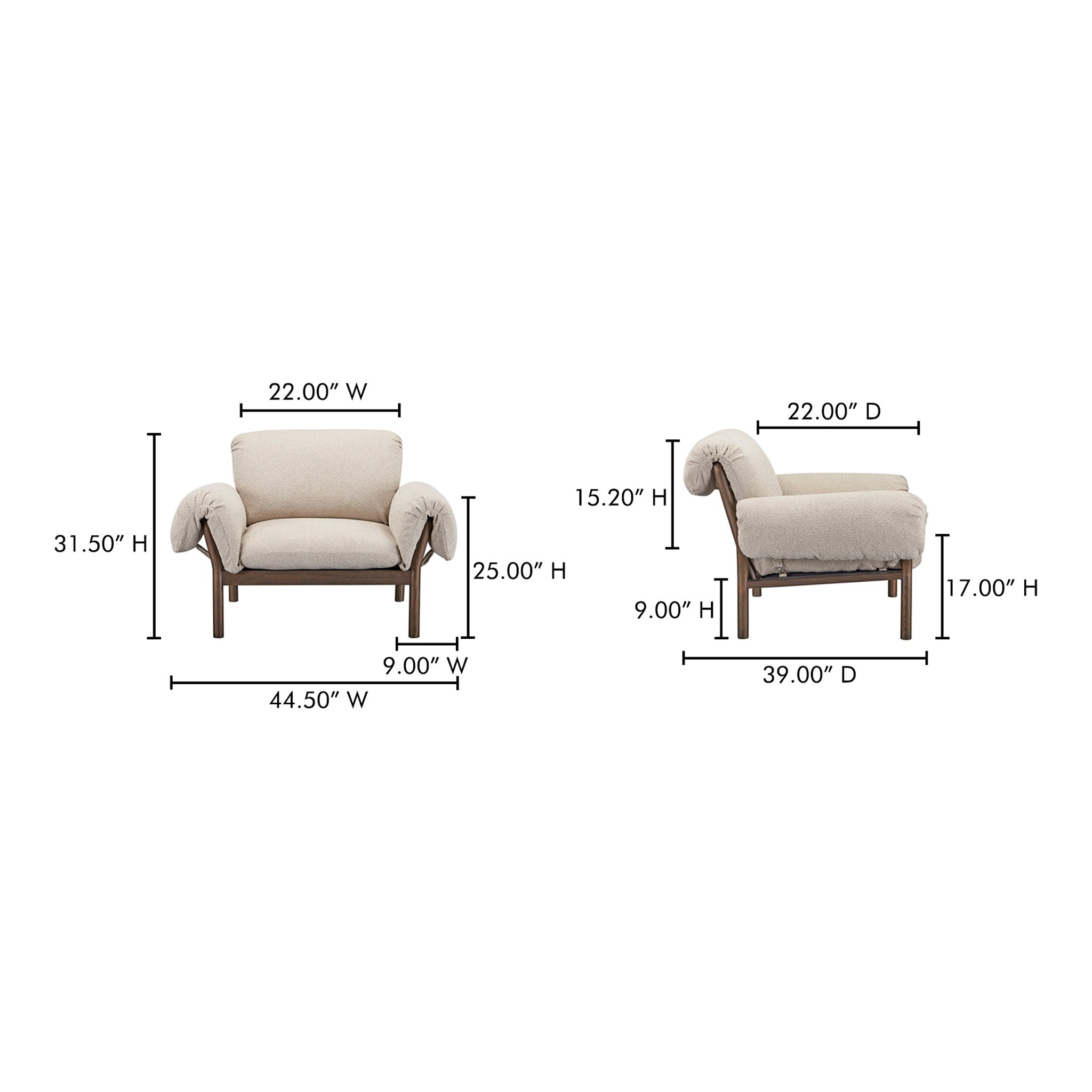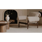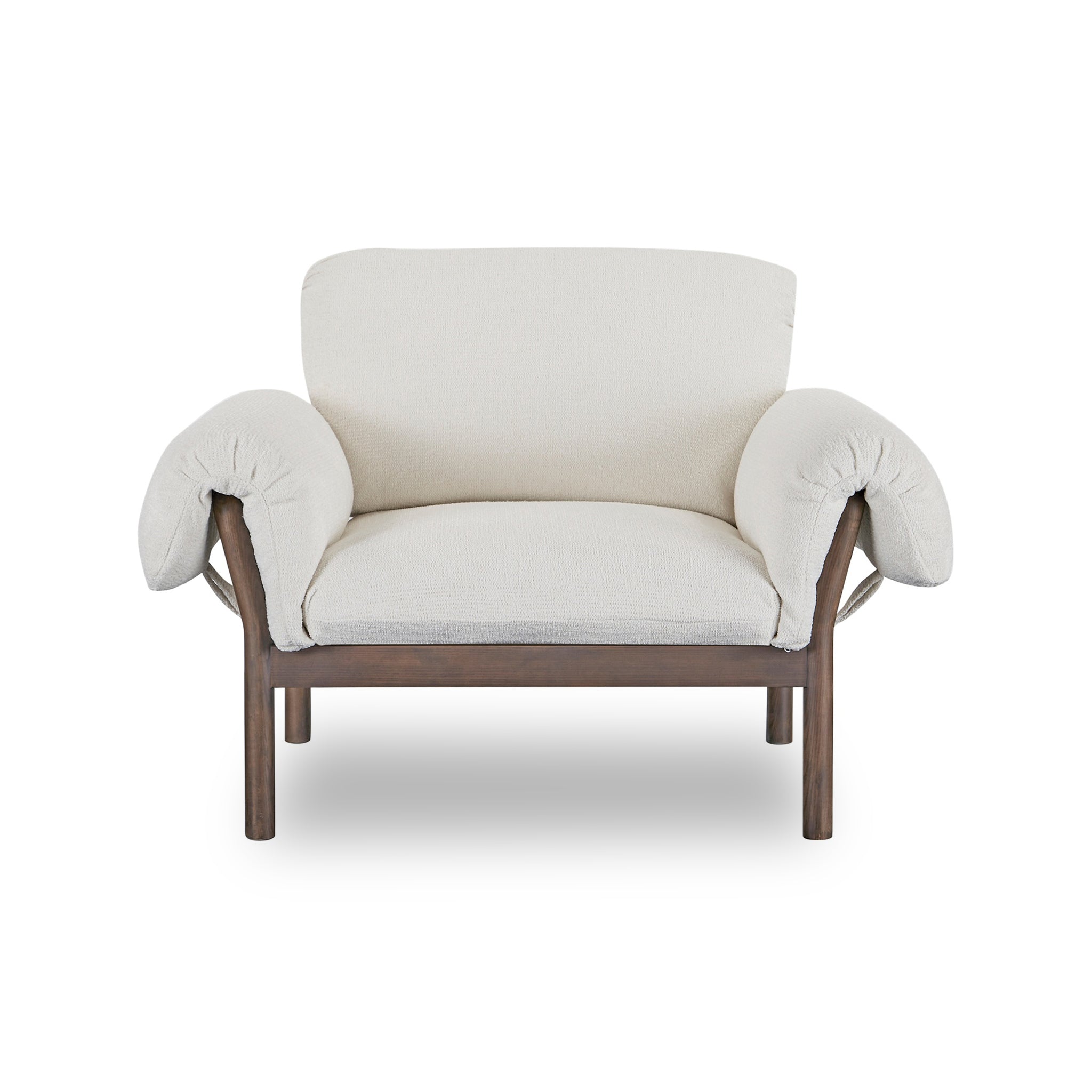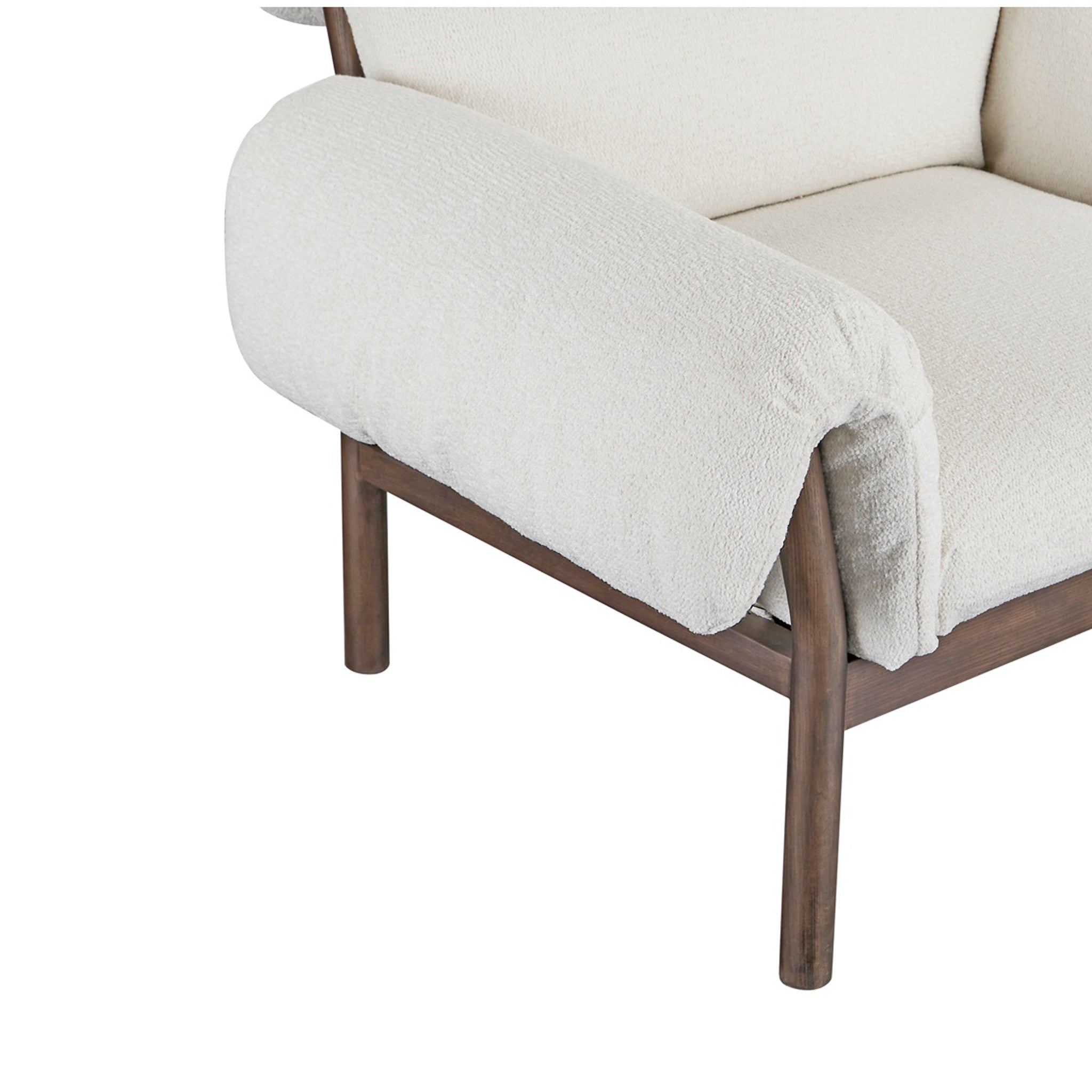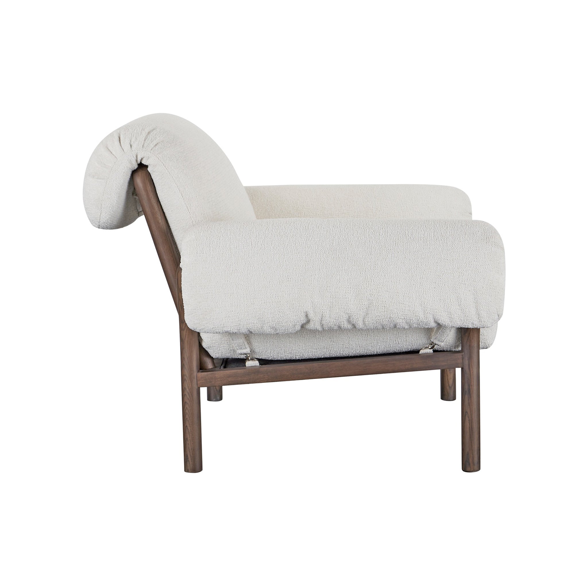The Celio lounge chair's solid ash frame, stained to a rich dark finish, showcases nature's artistry through intricate grain patterns. Timeless spindle back and flared wooden arms complement the generously proportioned seat and feather and fiber fill, inviting serene relaxation. Fold-over details with ruche texturing and tie detail add a touch of casual sophistication.