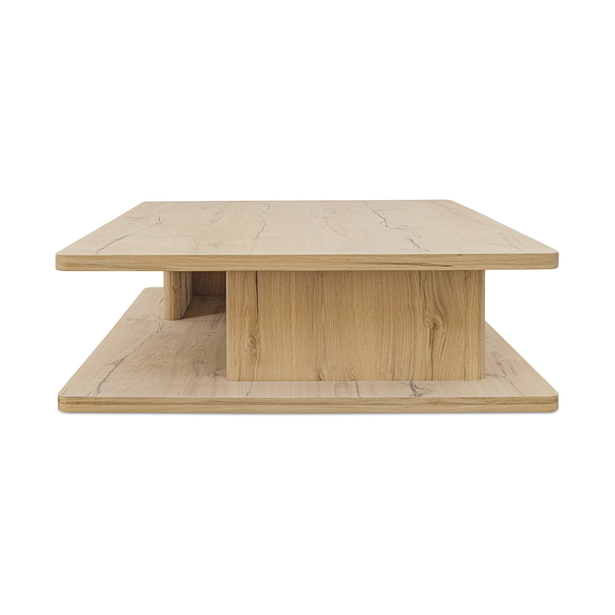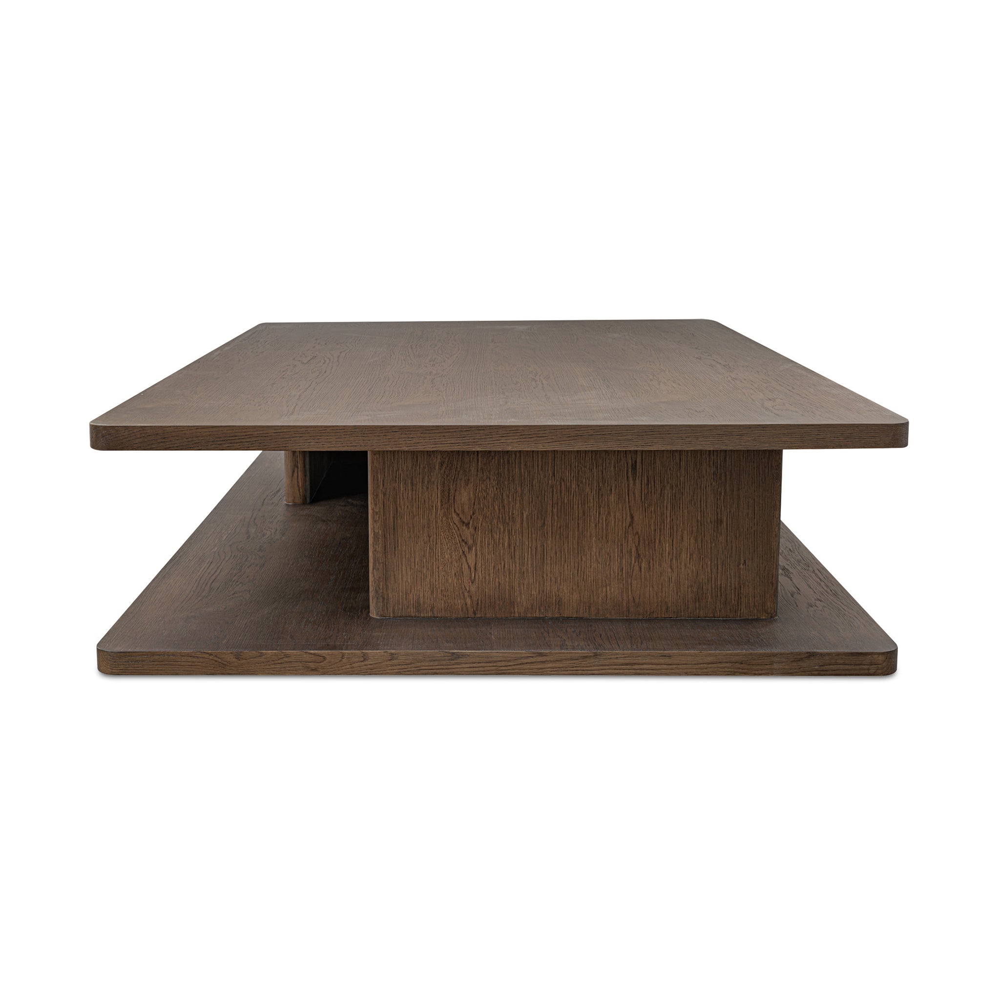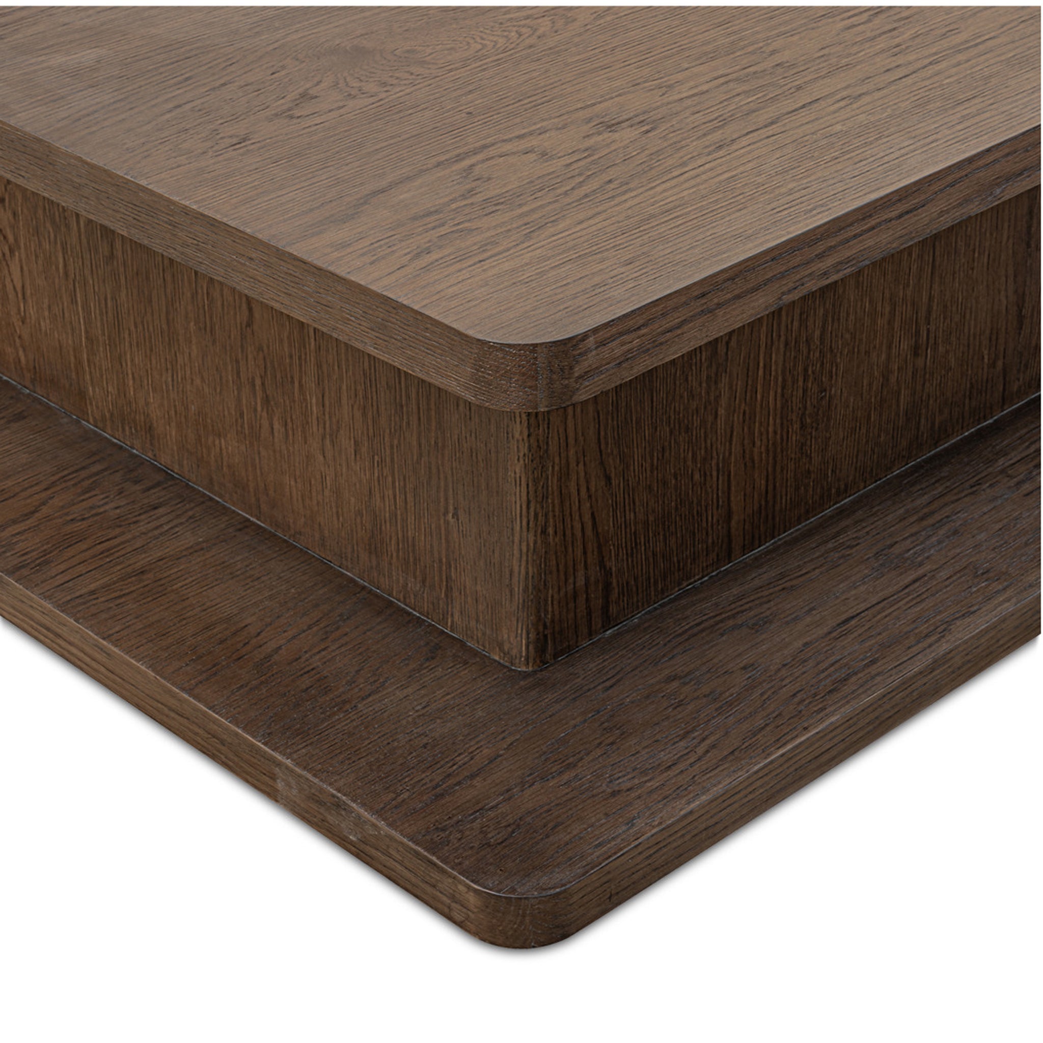 The Cipriano coffee table harmoniously blends rustic charm with contemporary aesthetics. A distinctive vertical support adorned with a refined bullnose edge adds sculptural grace to its minimalist design. Ample open storage beneath the tabletop offers practical display or storage solutions.