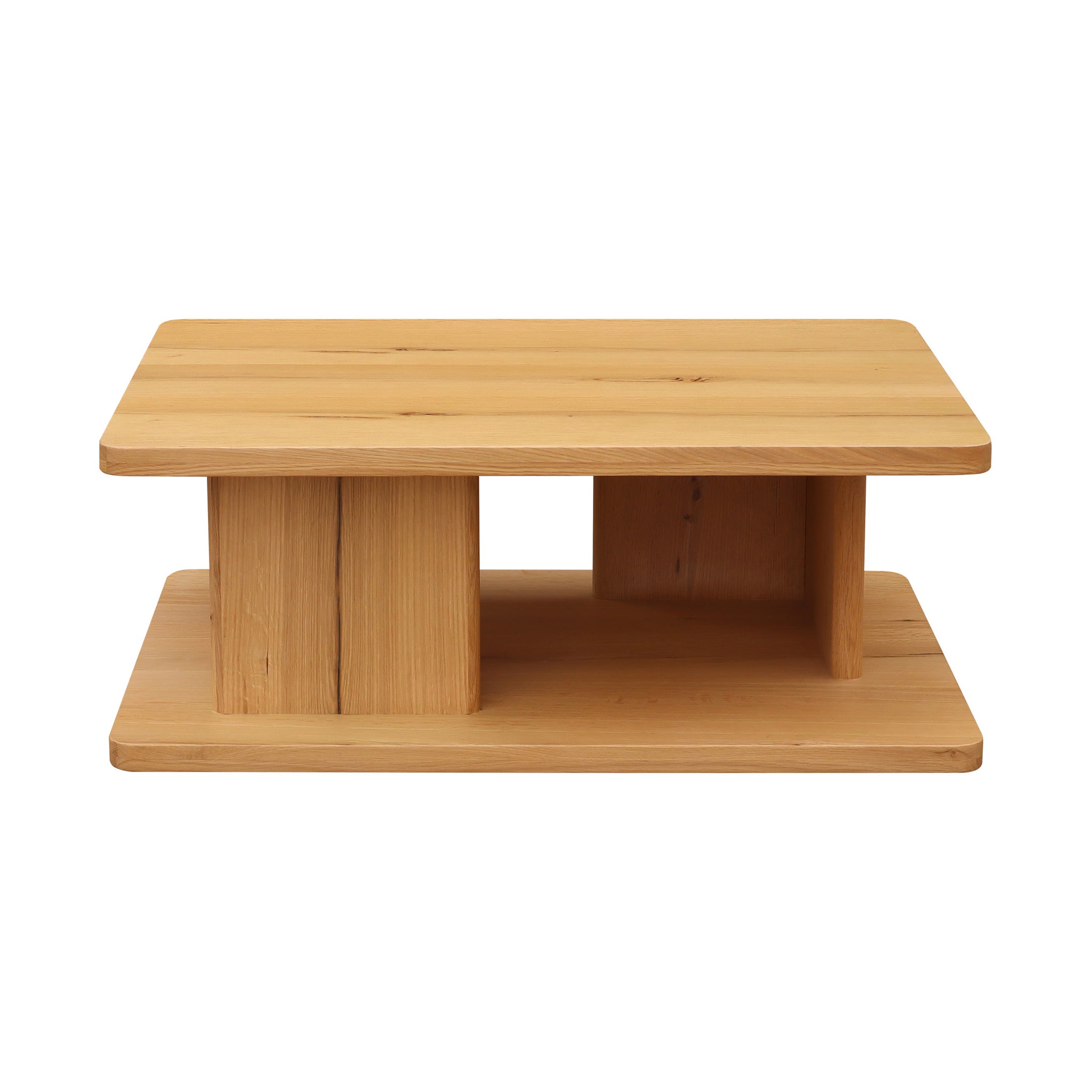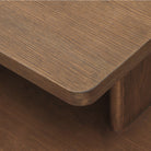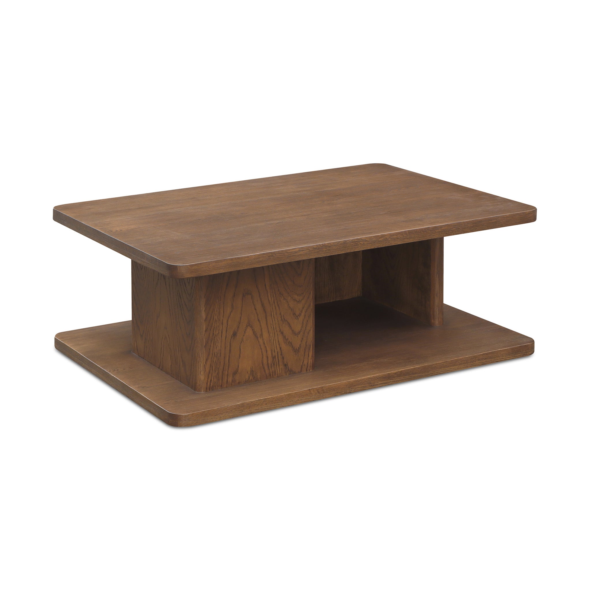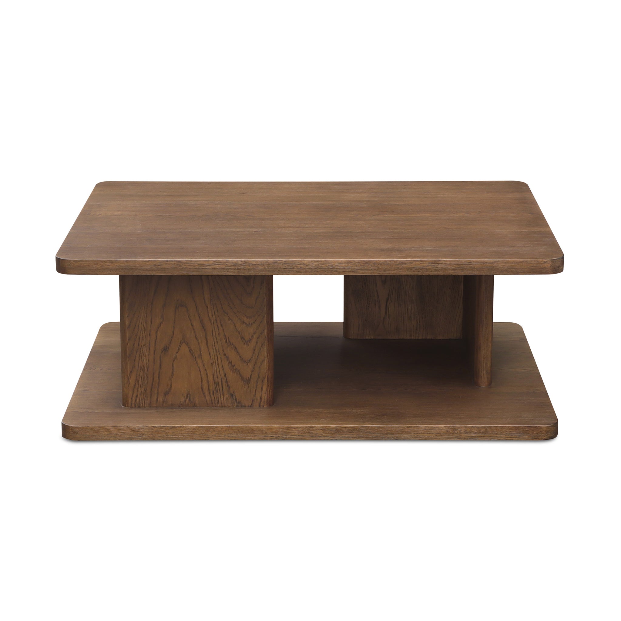 The Cipriano coffee table harmoniously blends rustic charm with contemporary aesthetics. A distinctive vertical support adorned with a refined bullnose edge adds sculptural grace to its minimalist design. Ample open storage beneath the tabletop offers practical display or storage solutions.