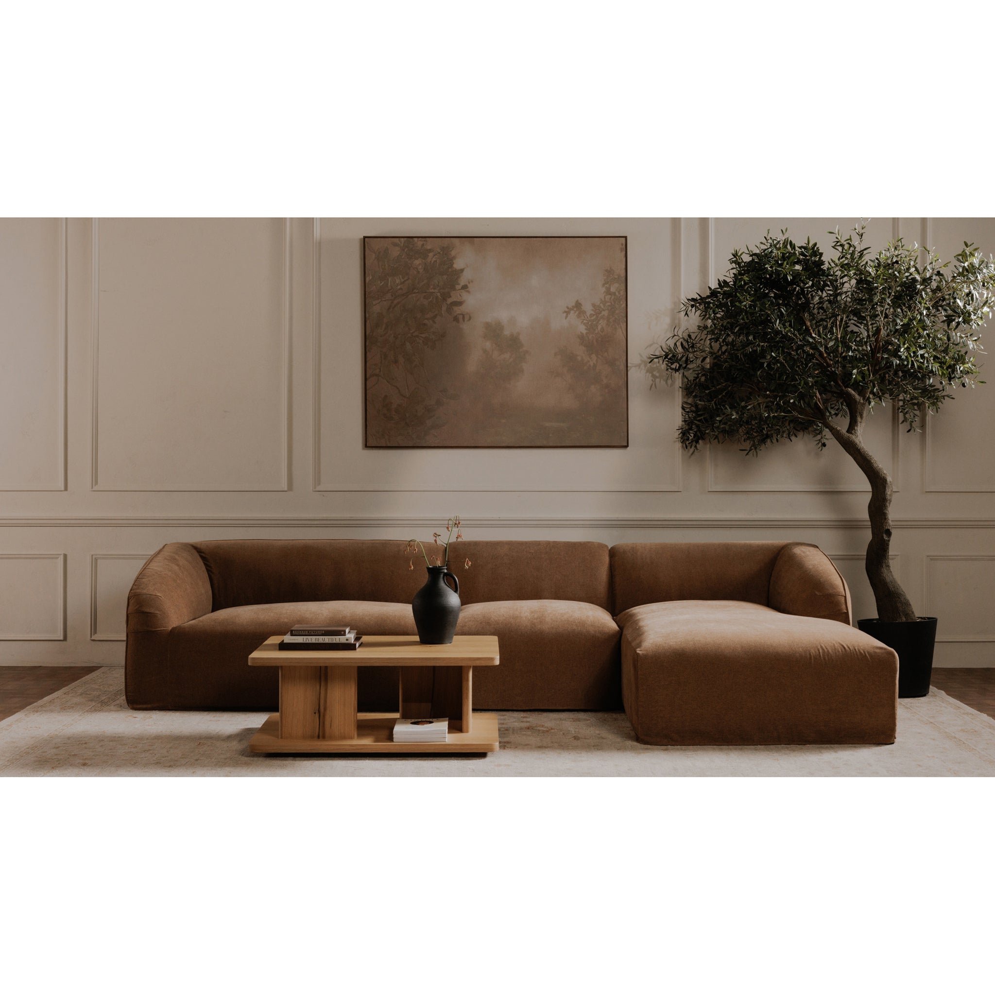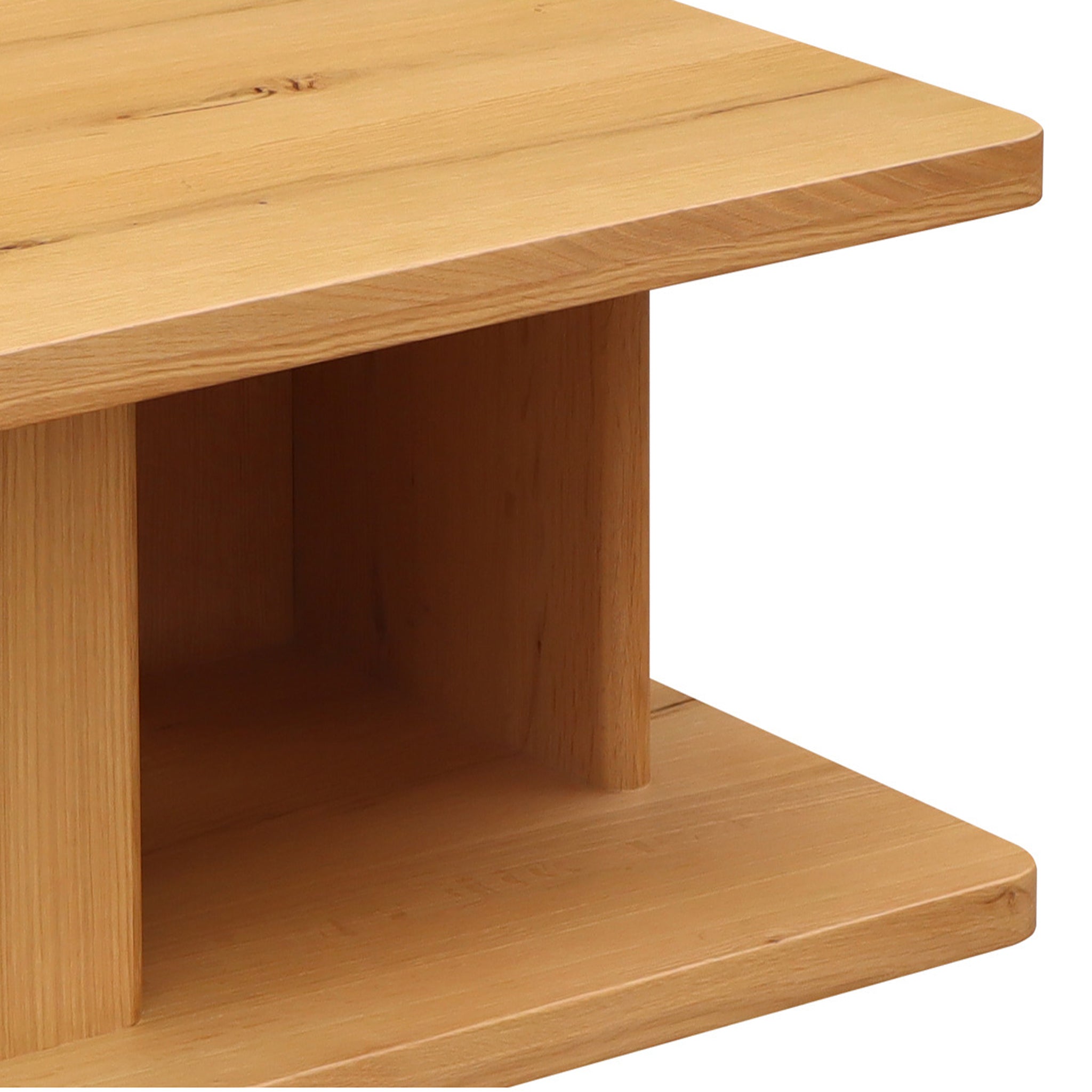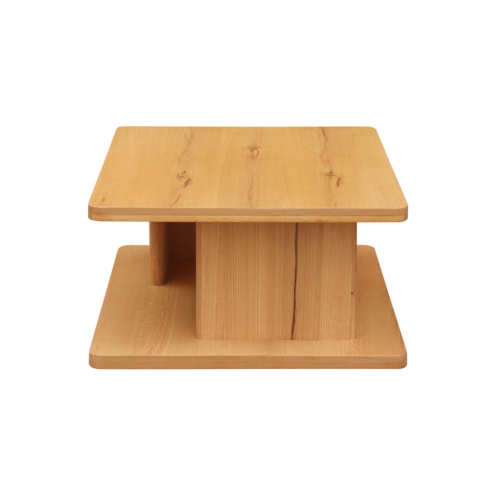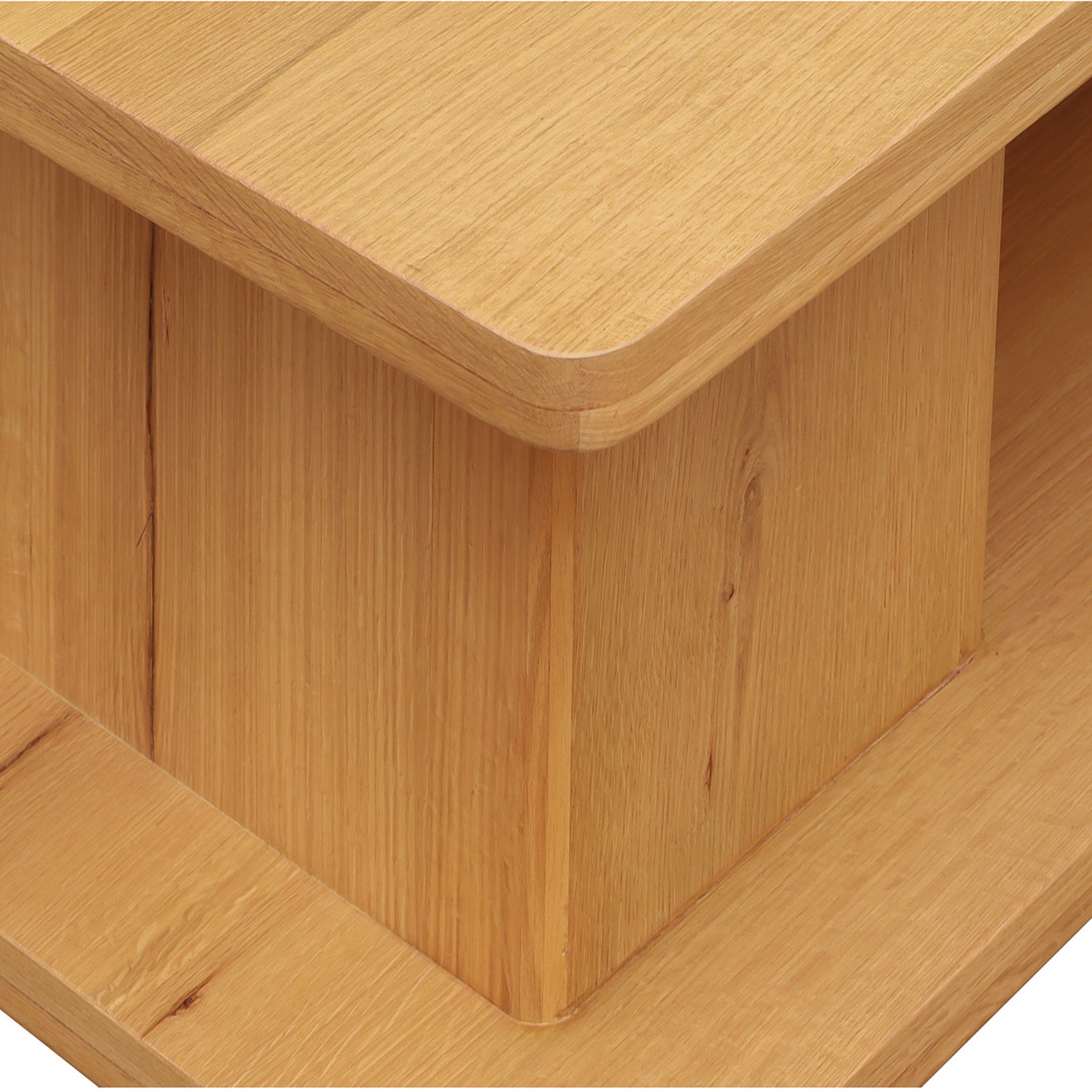 The Cipriano coffee table harmoniously blends rustic charm with contemporary aesthetics. A distinctive vertical support adorned with a refined bullnose edge adds sculptural grace to its minimalist design. Ample open storage beneath the tabletop offers practical display or storage solutions.