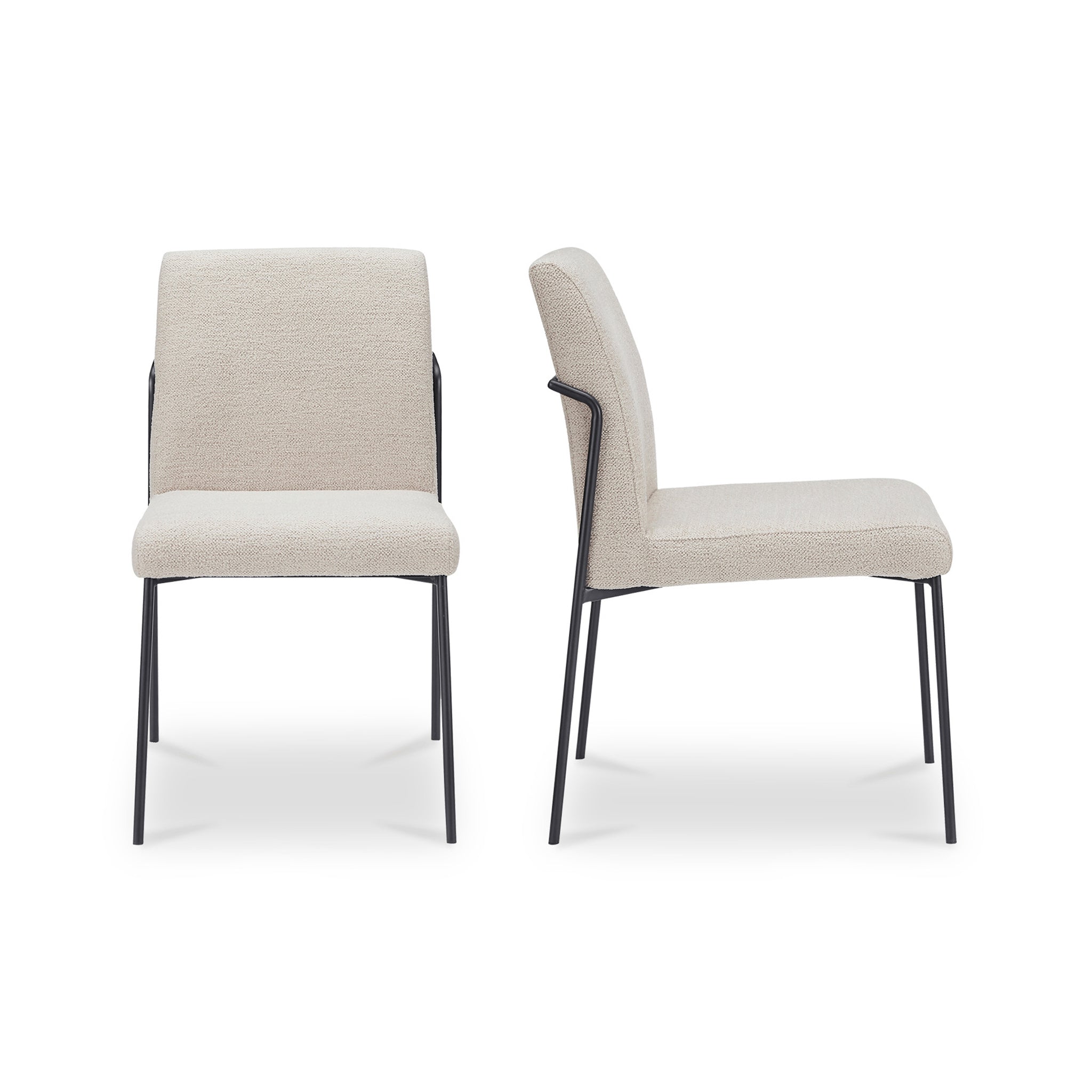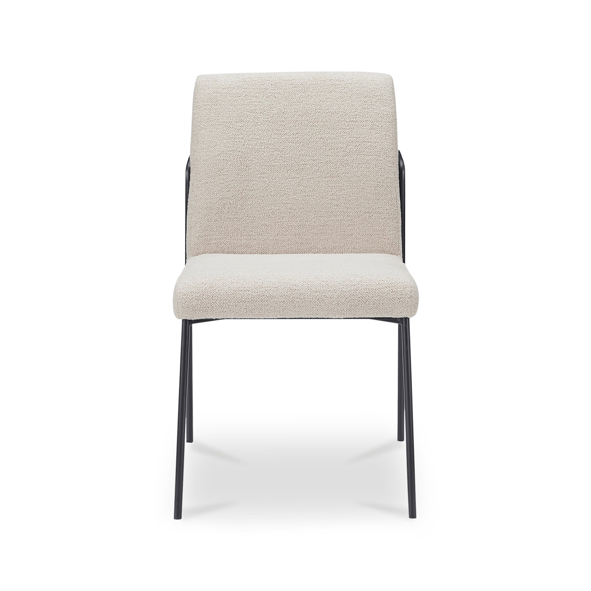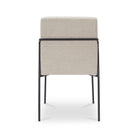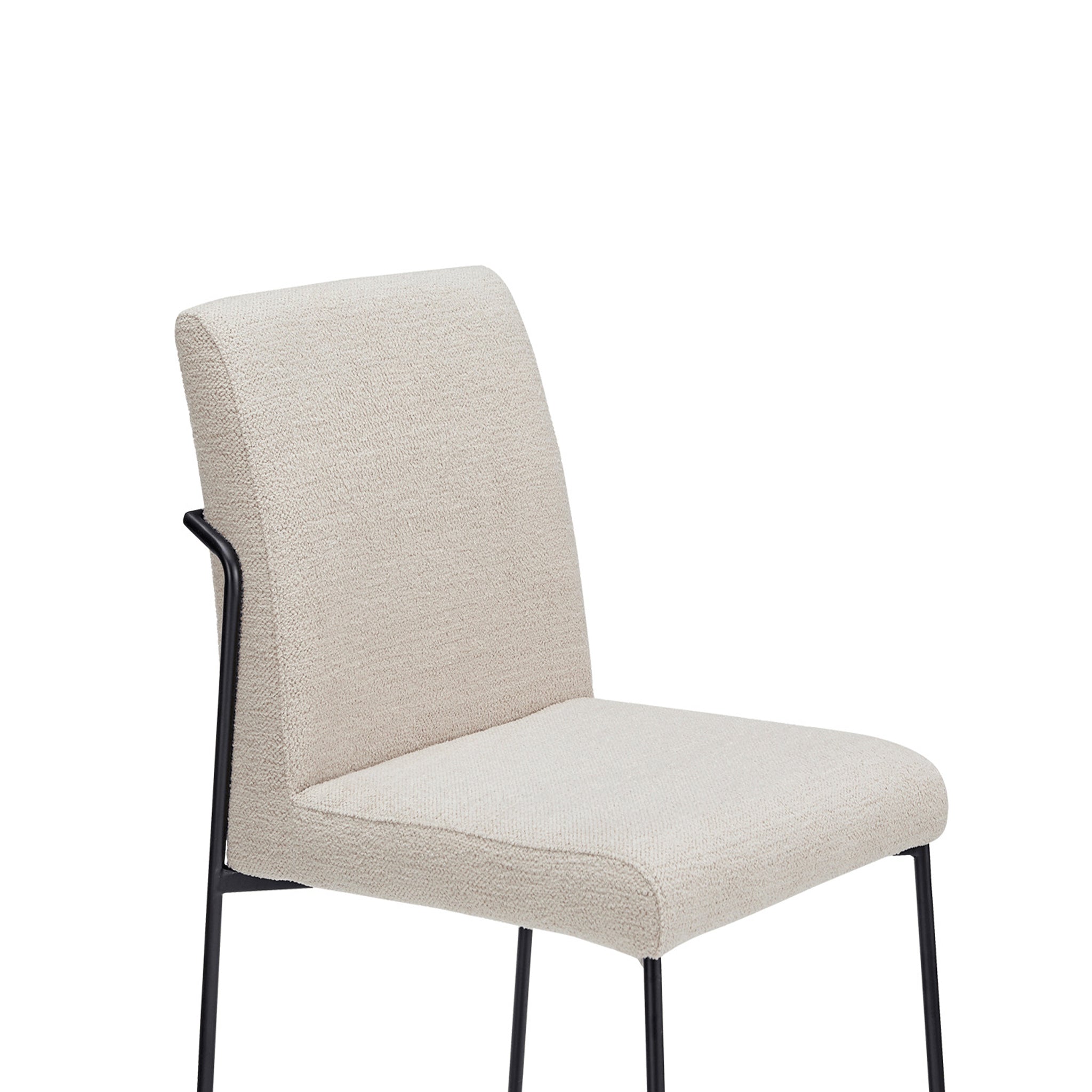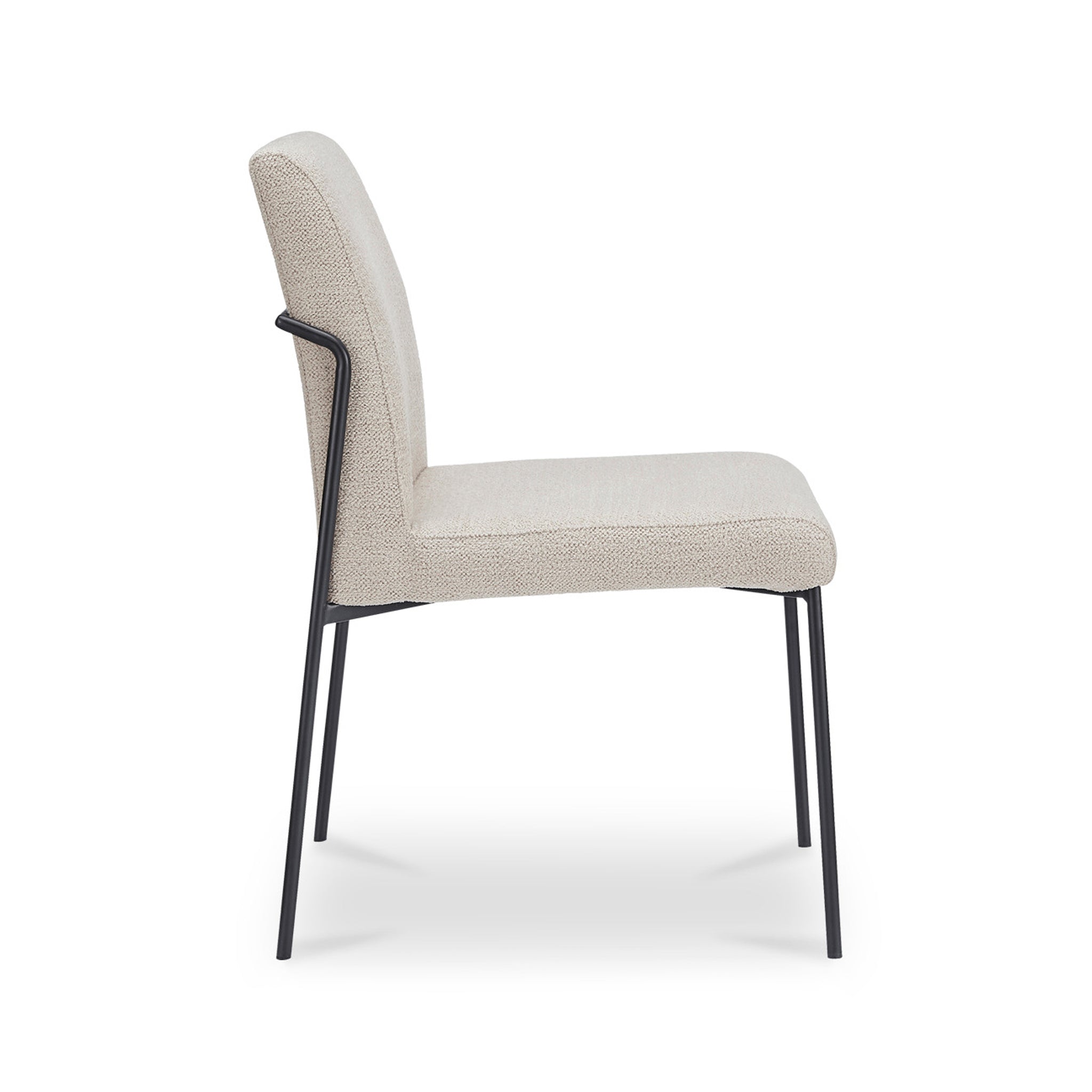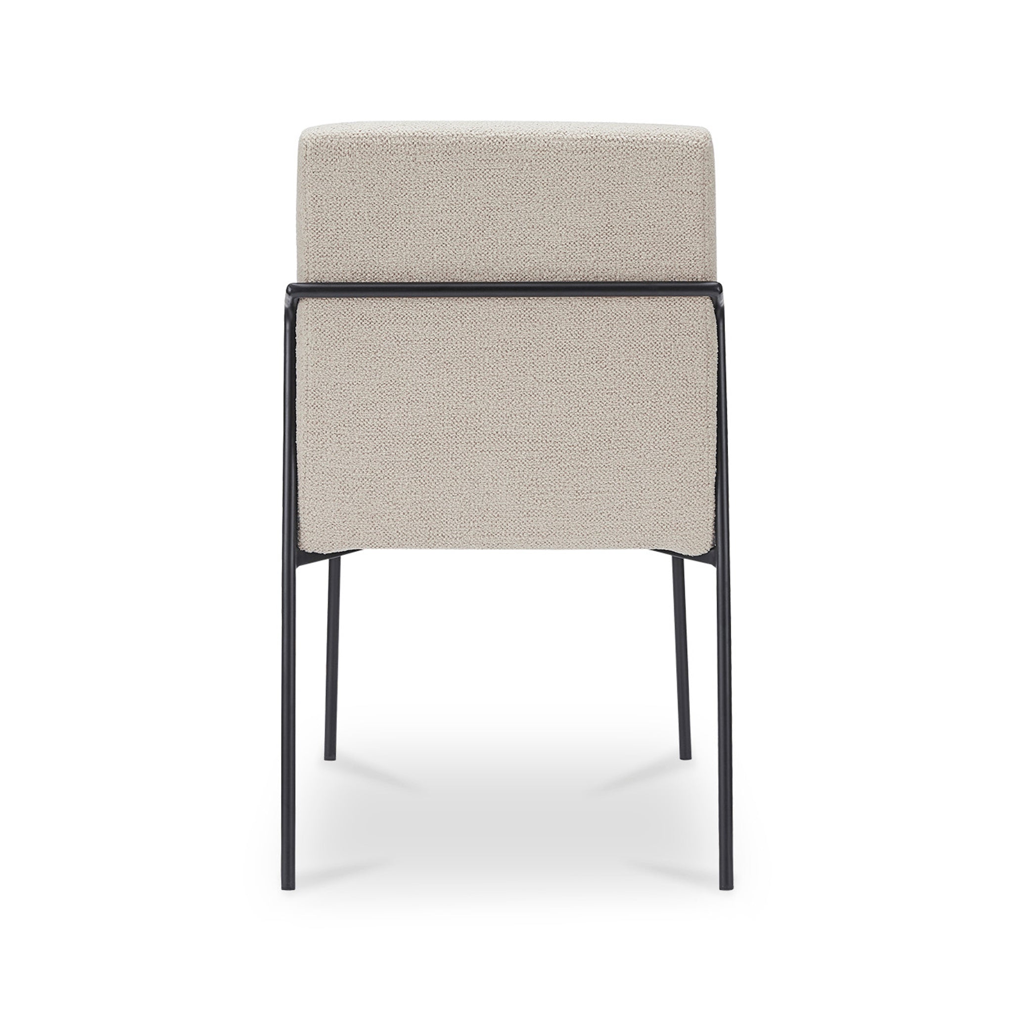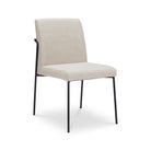 The Demetrio dining chair marries visual lightness with sumptuous comfort. A slim metal frame curves gracefully, supporting plush ivory upholstery. The minimalist base imparts an ethereal quality, contrasting beautifully with the padded seat and back.