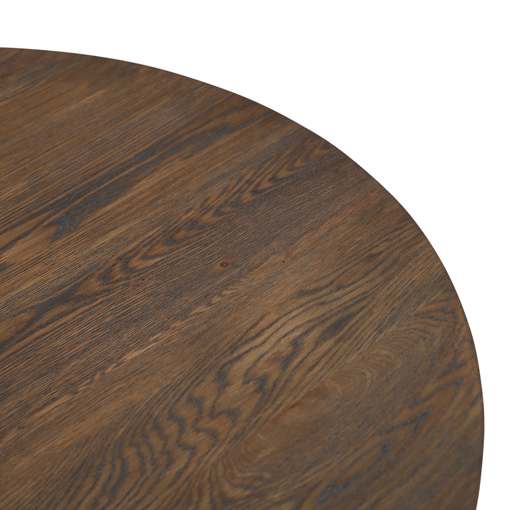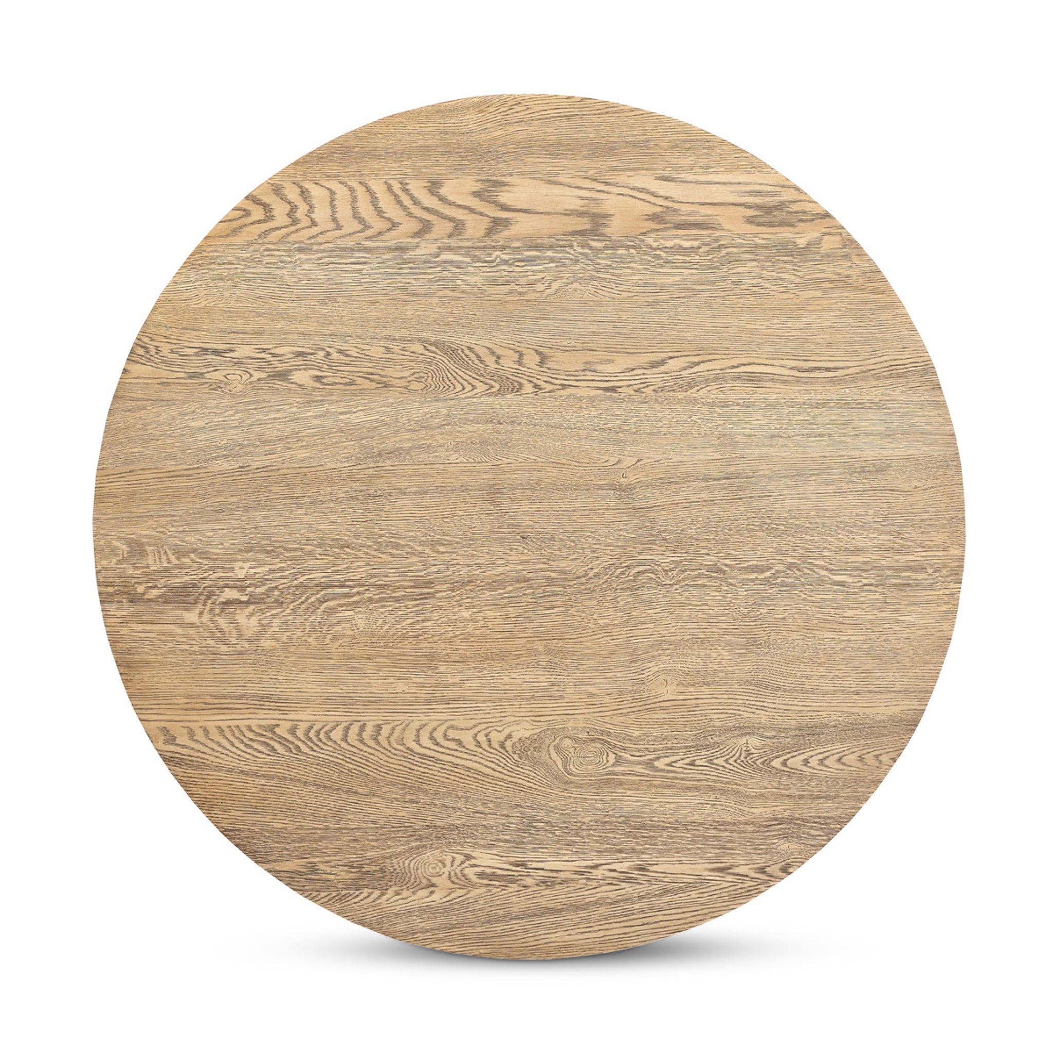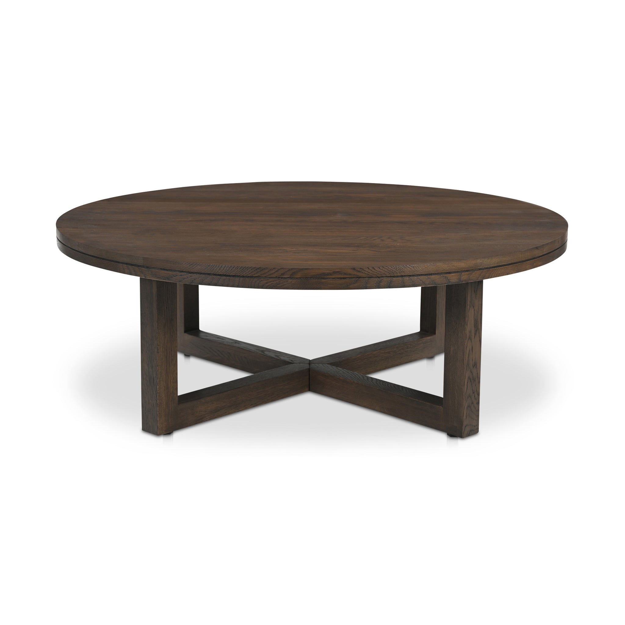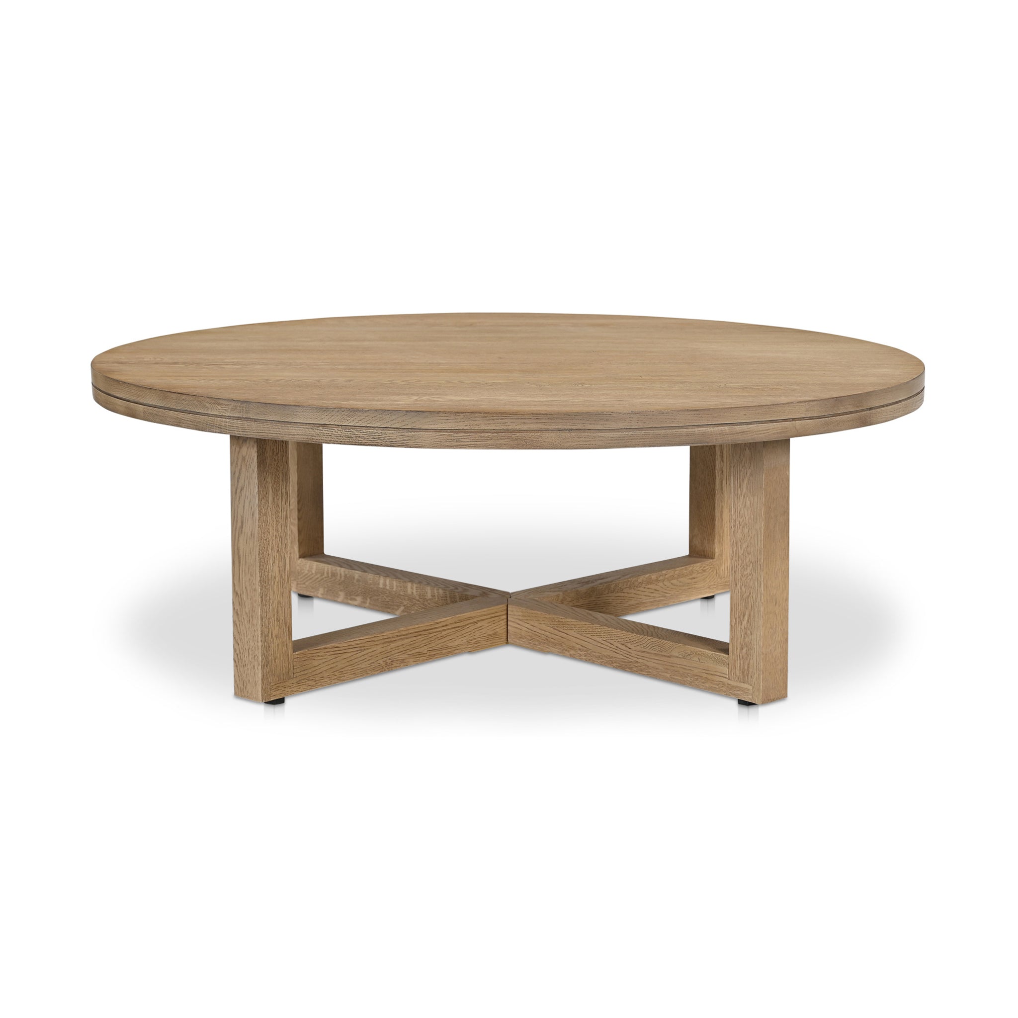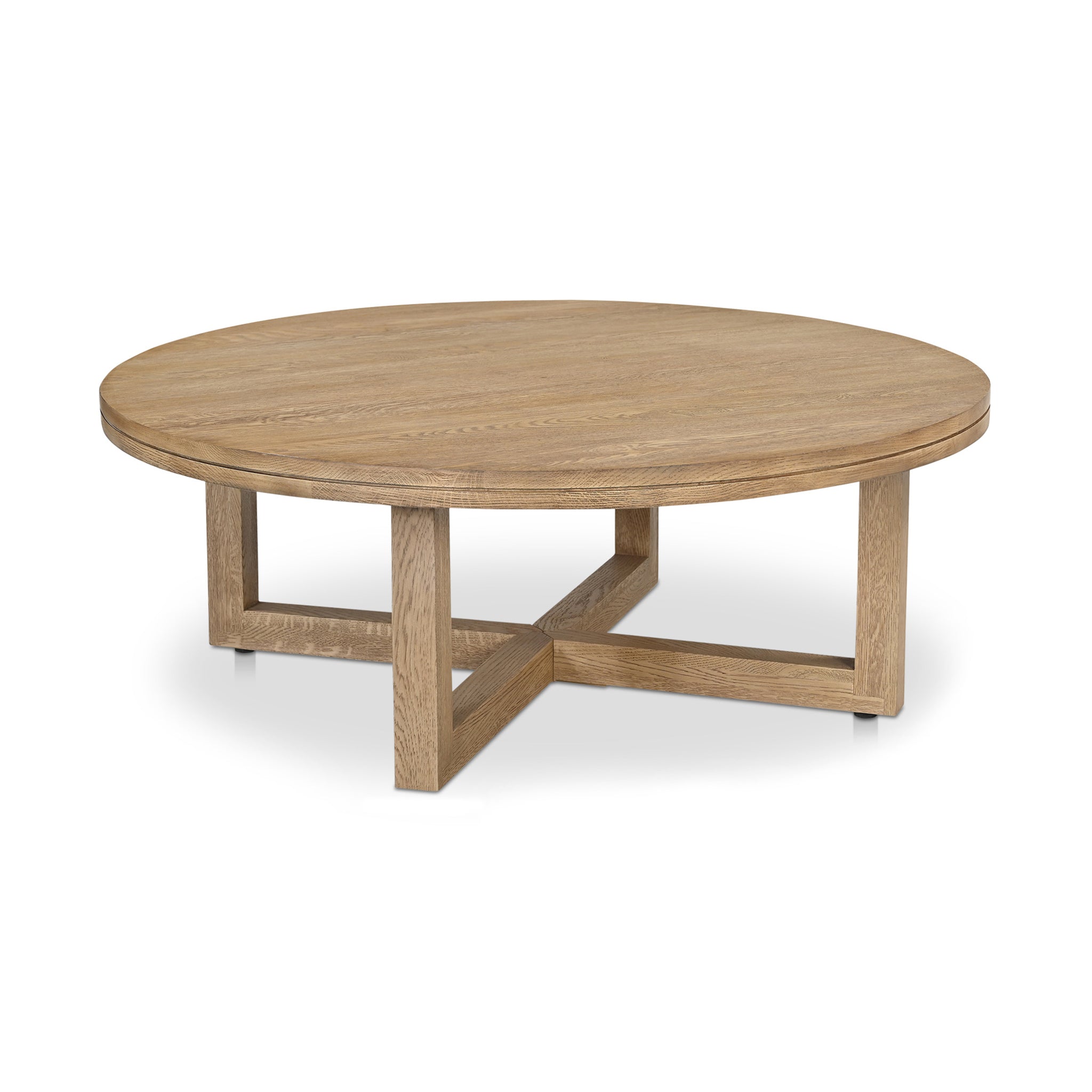 Crafted from solid oak, the Luciano coffee table's thick round top features a thoughtfully crafted V-groove, adding a visual lightness to the substantial surface. The geometric base, with crisscrossing stretchers, grounds the piece with quiet confidence. A wire-brushed finish enhances the oak's organic beauty, creating a focal point of understated elegance.