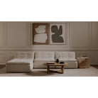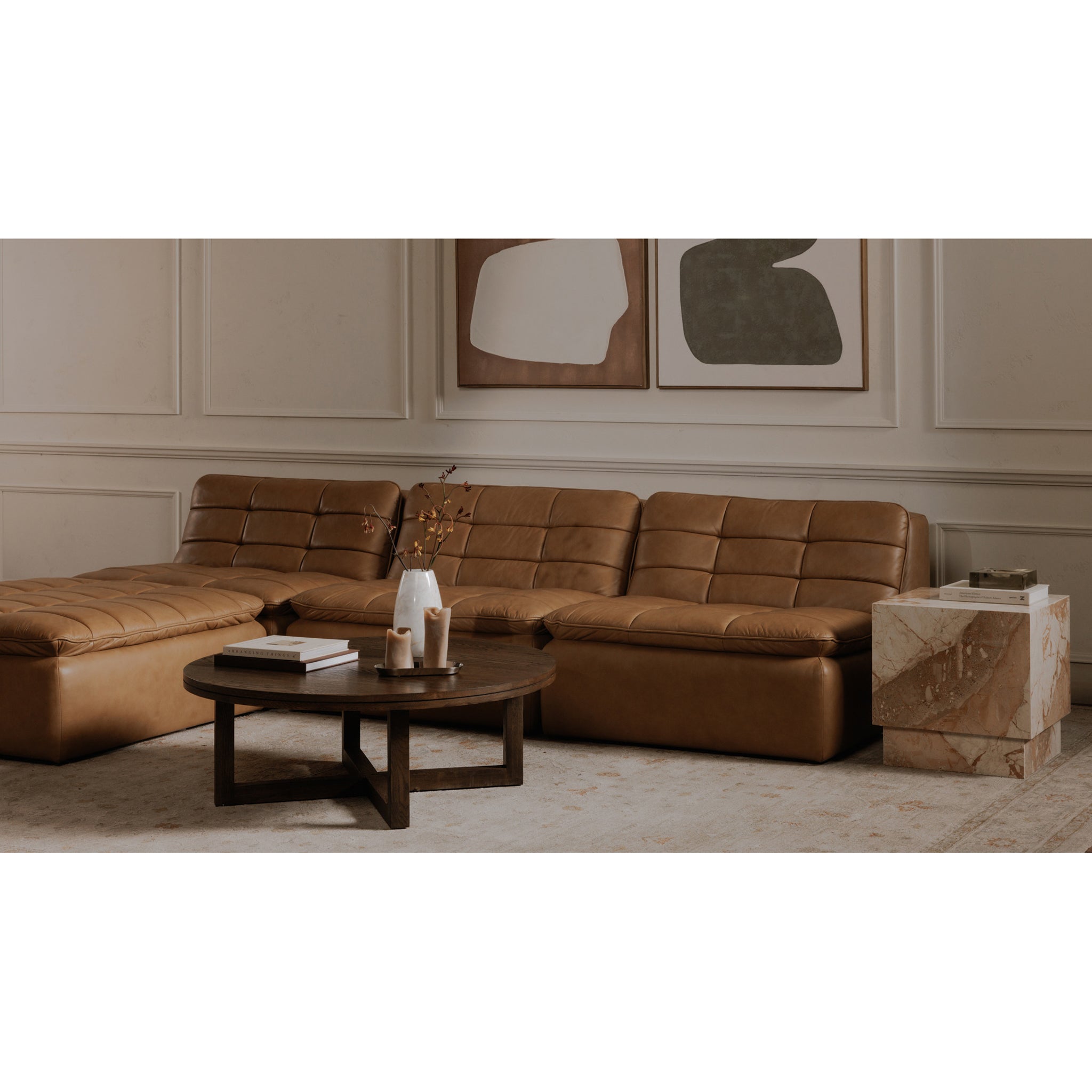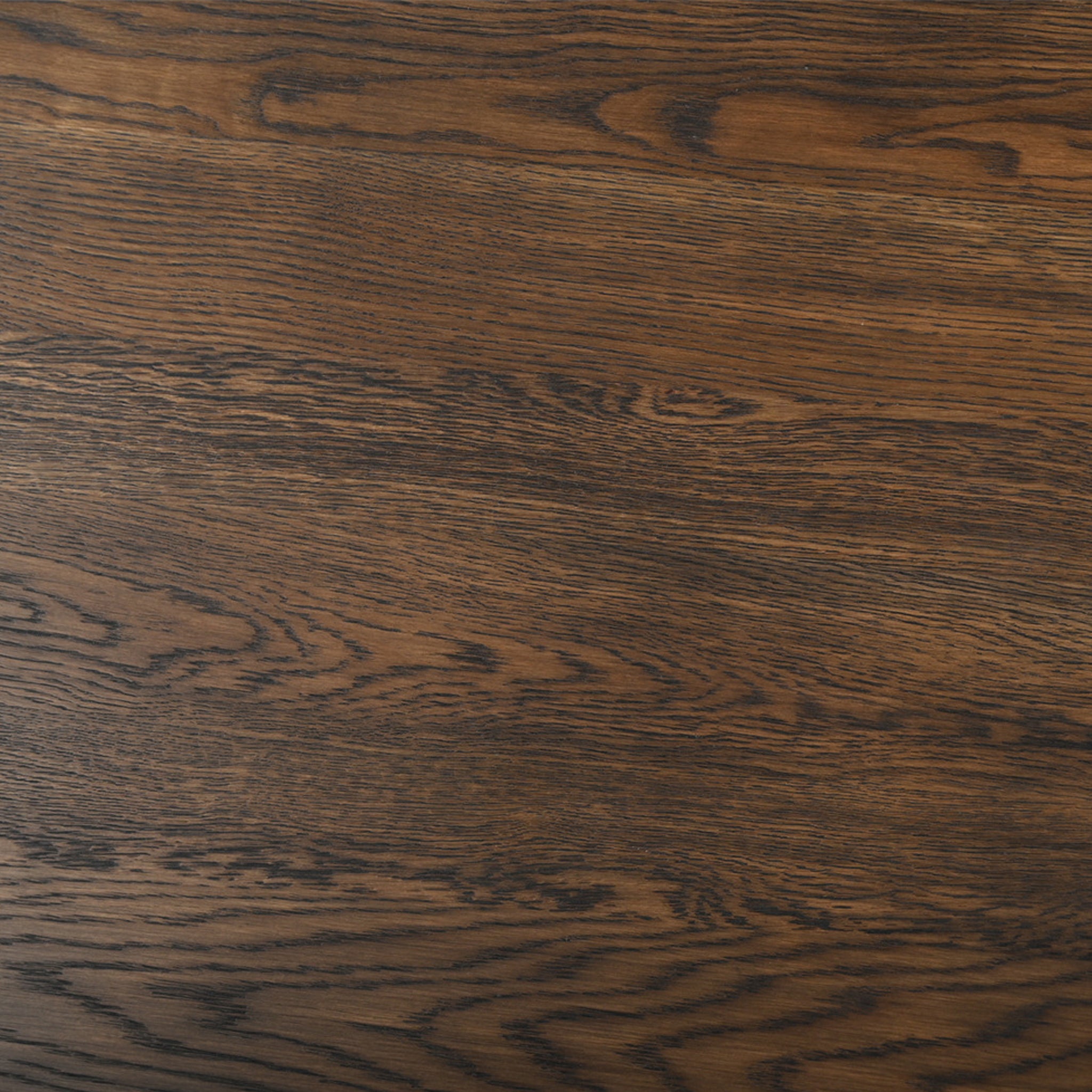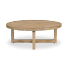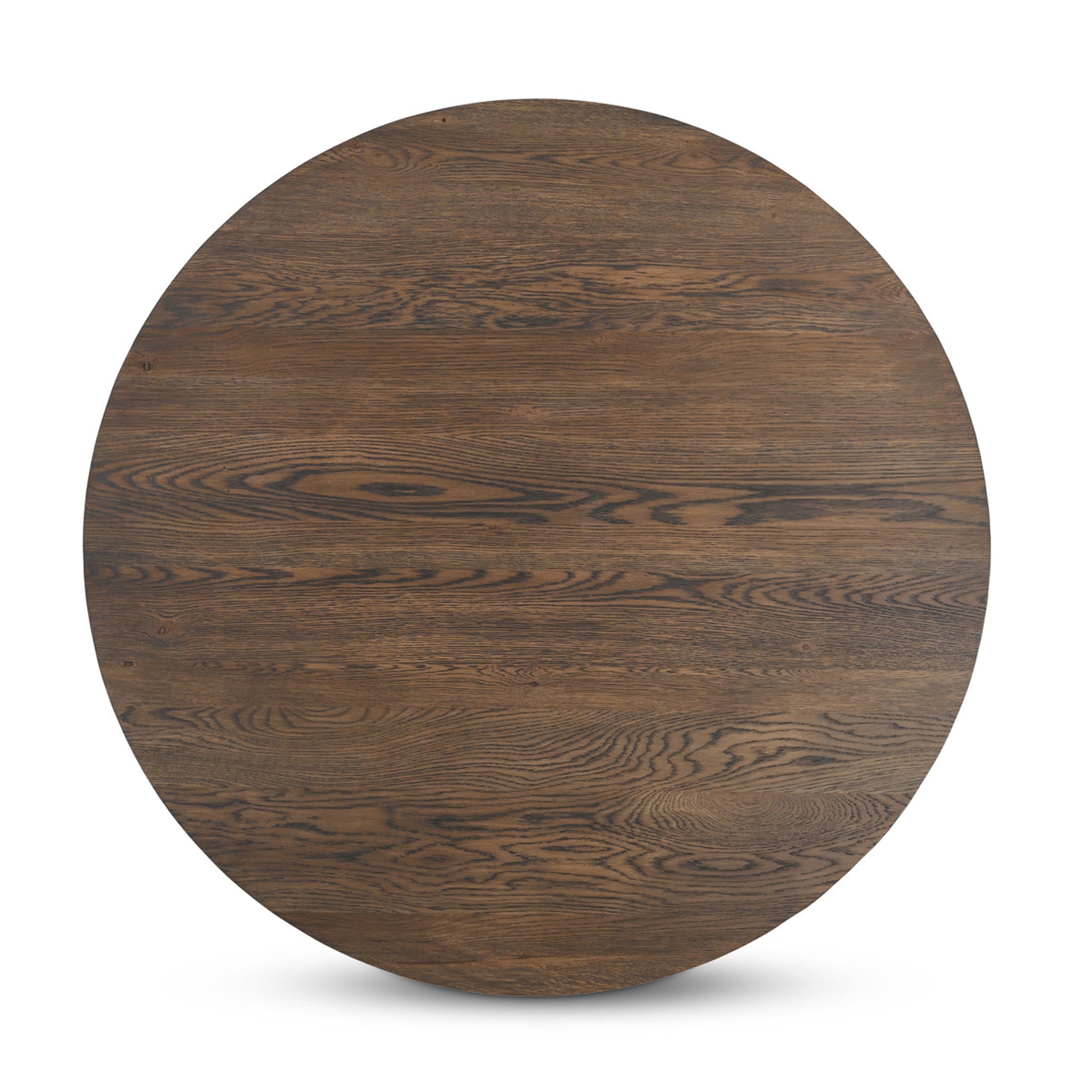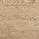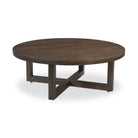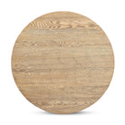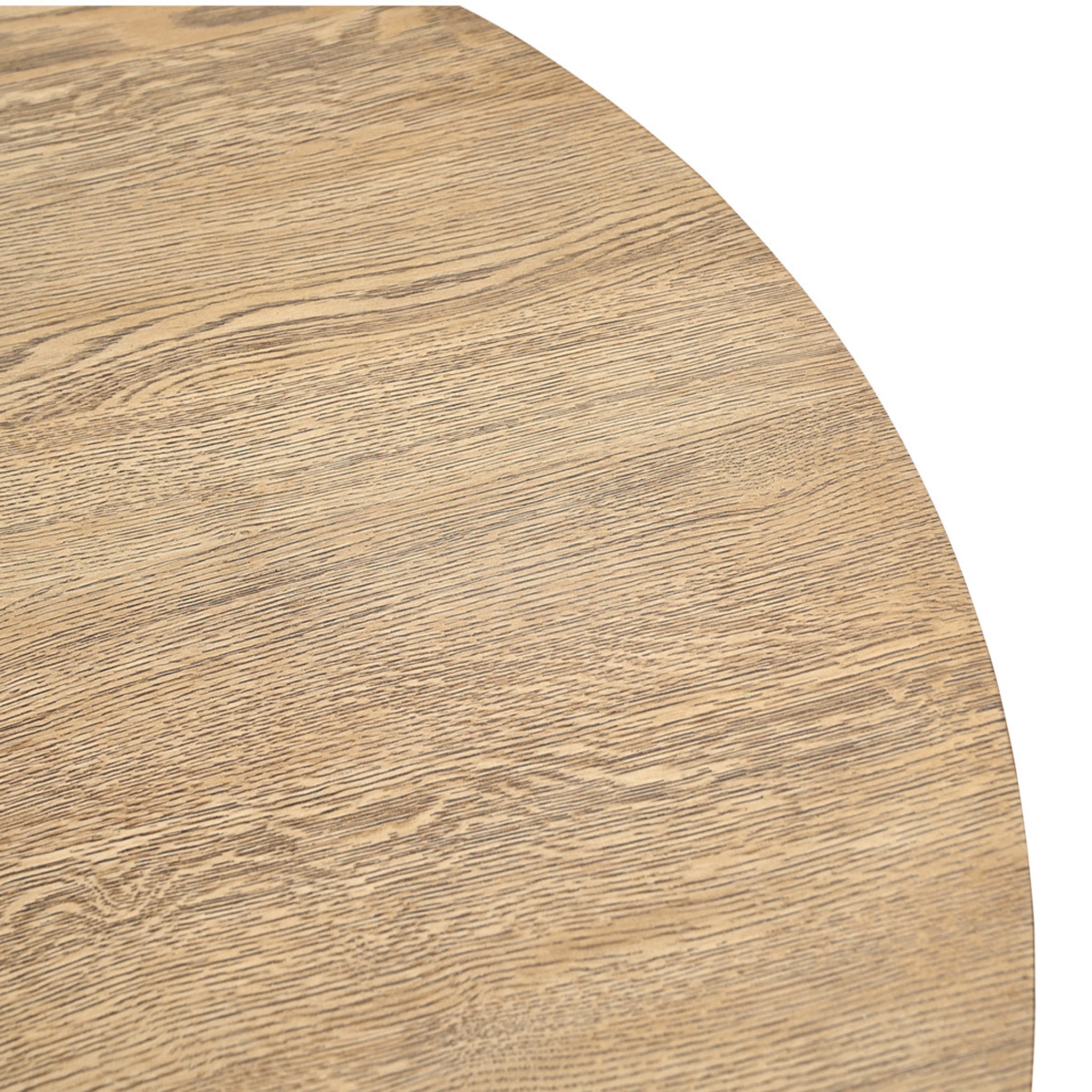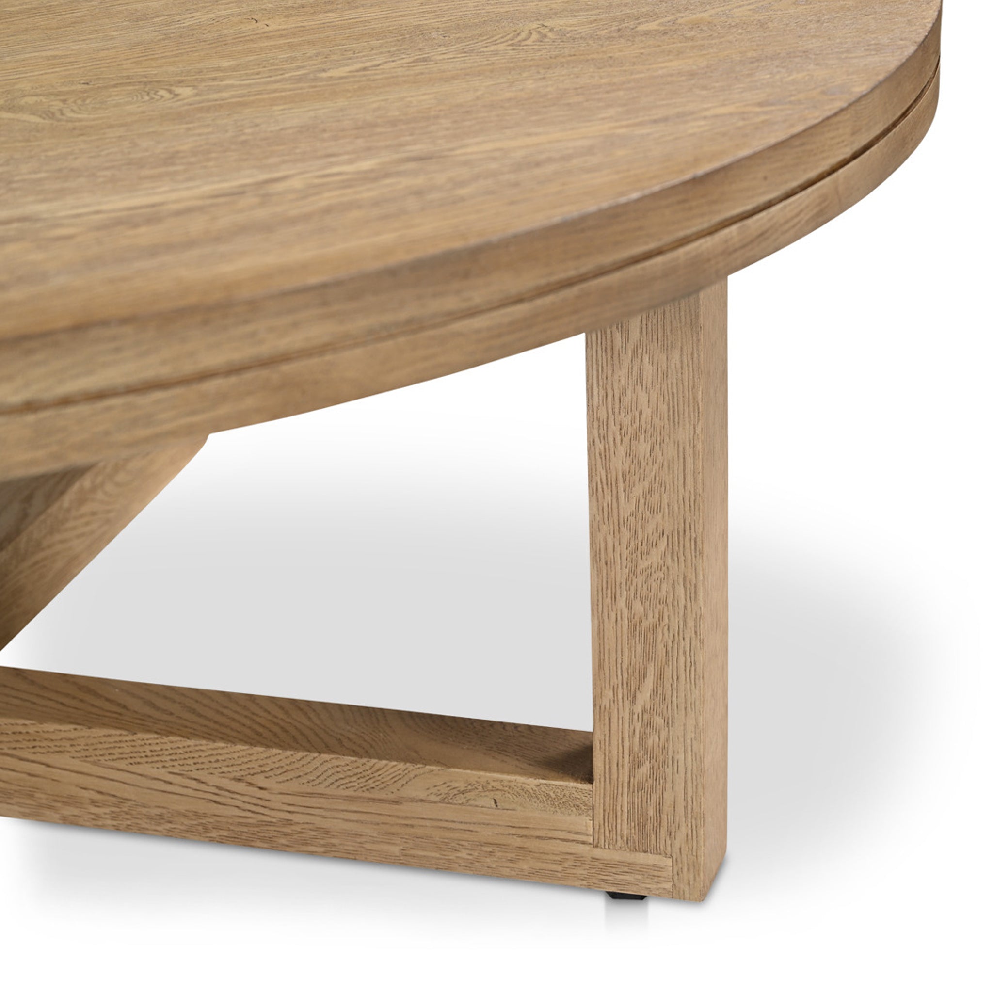 Crafted from solid oak, the Luciano coffee table's thick round top features a thoughtfully crafted V-groove, adding a visual lightness to the substantial surface. The geometric base, with crisscrossing stretchers, grounds the piece with quiet confidence. A wire-brushed finish enhances the oak's organic beauty, creating a focal point of understated elegance.