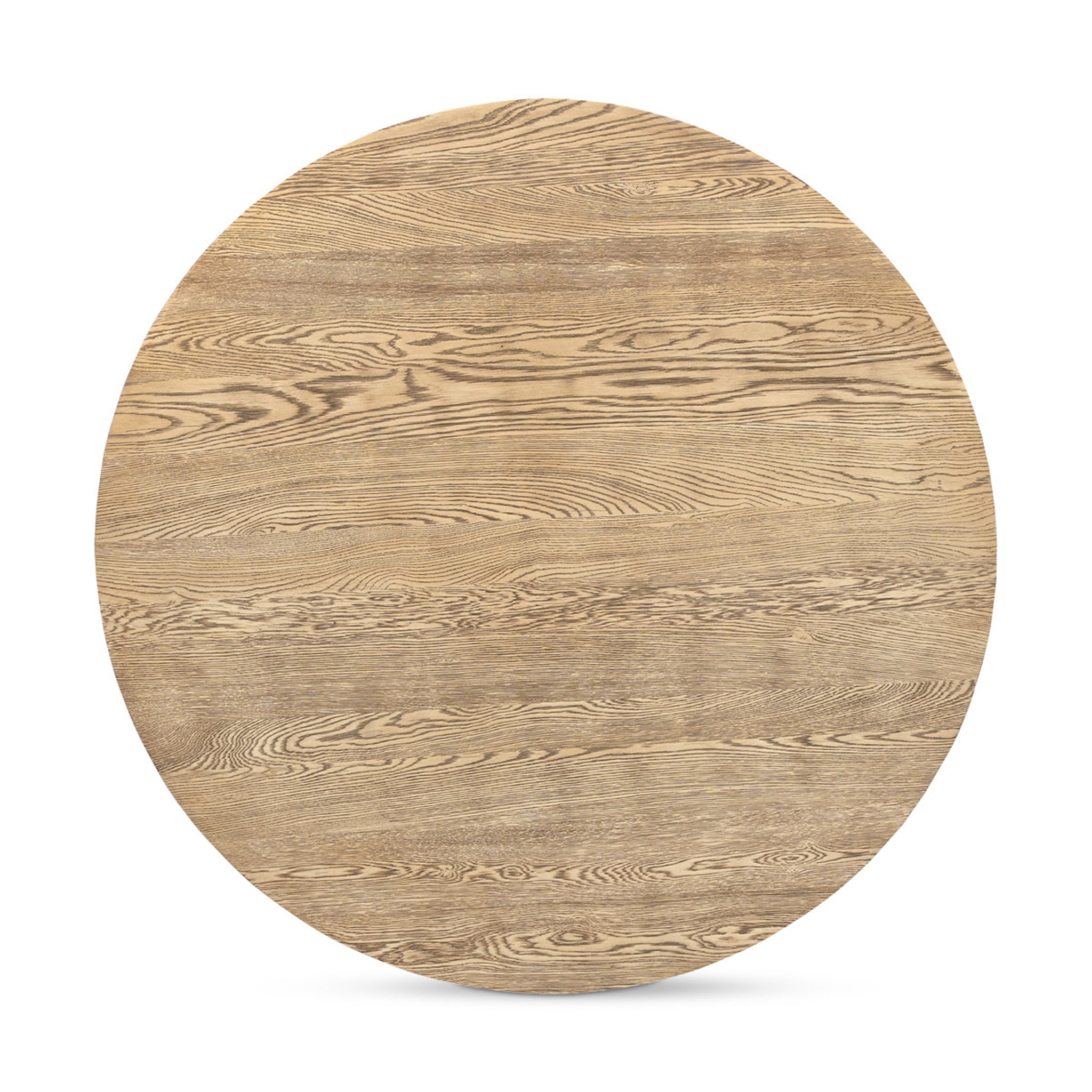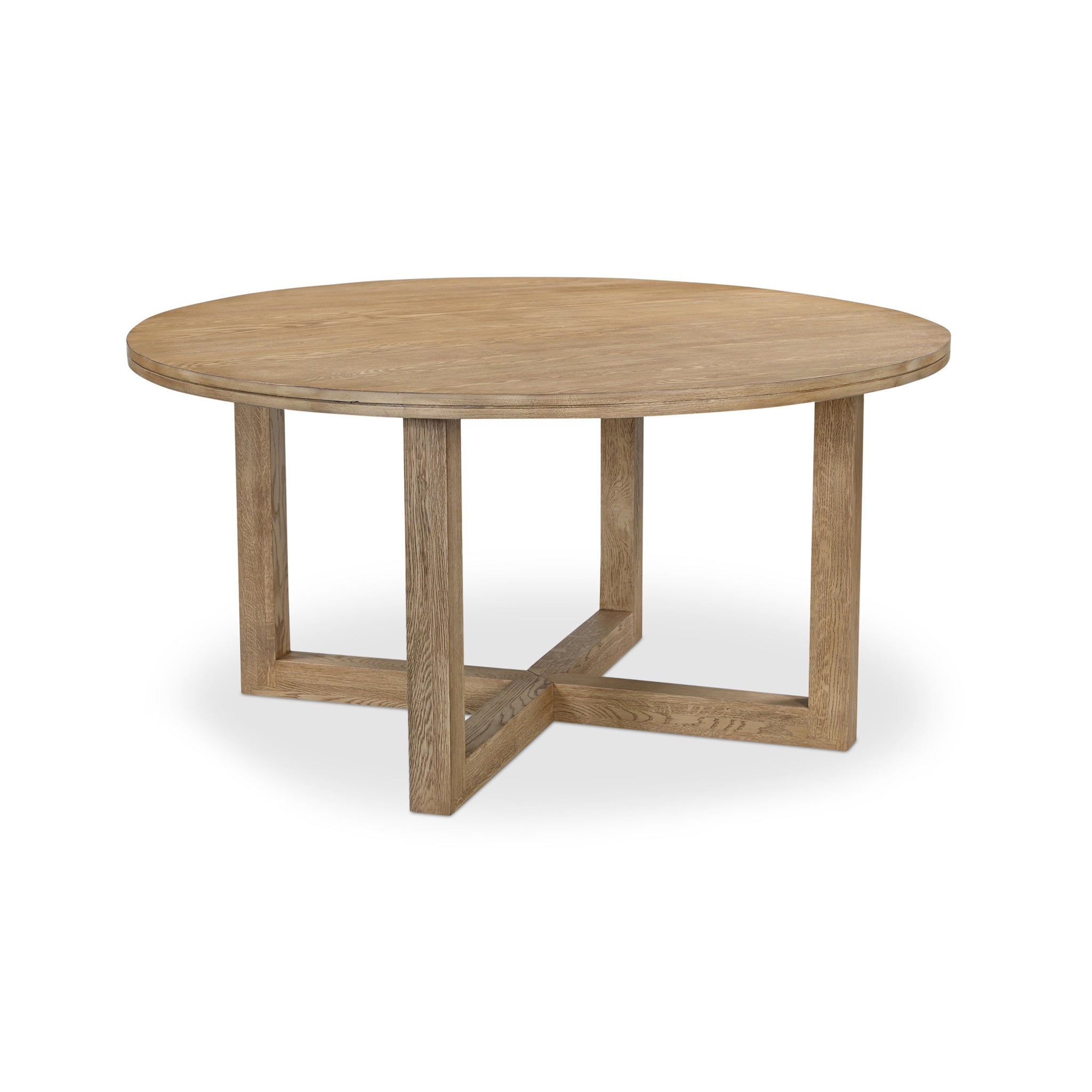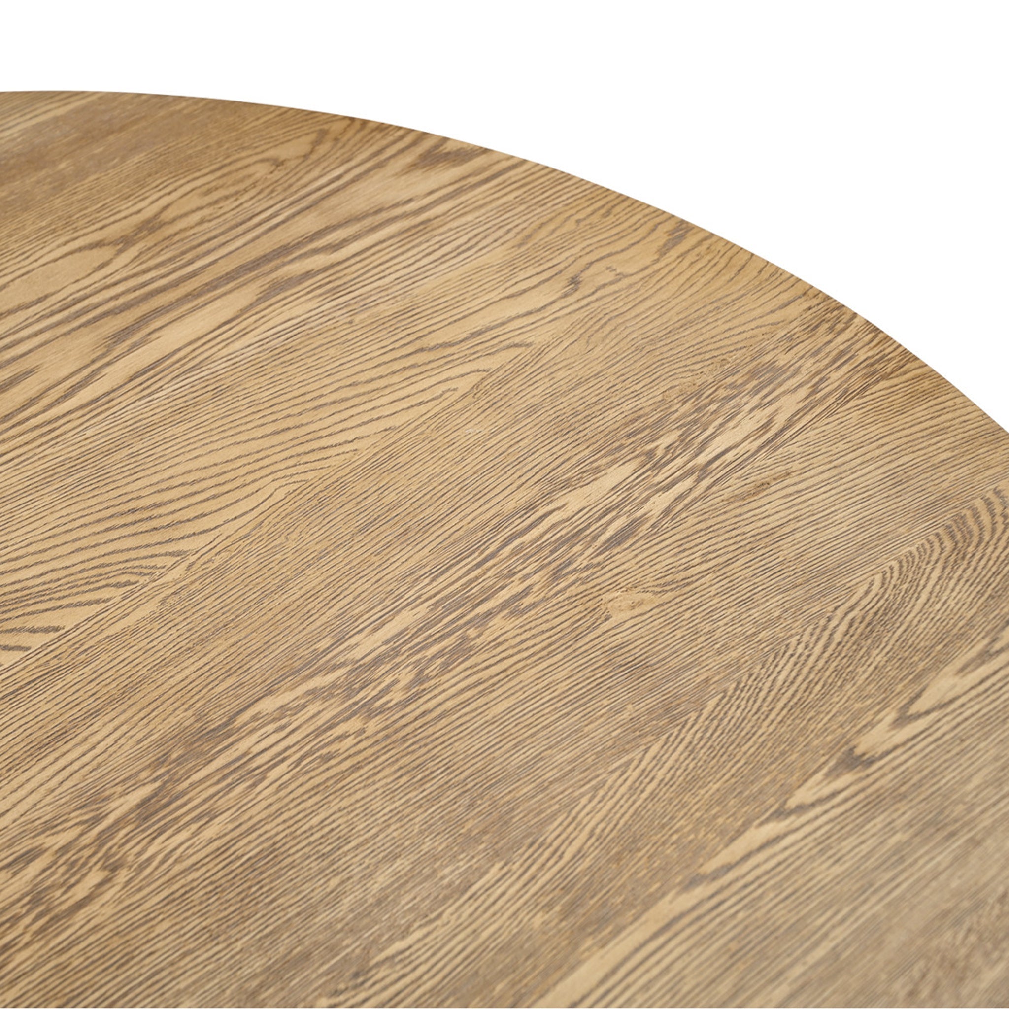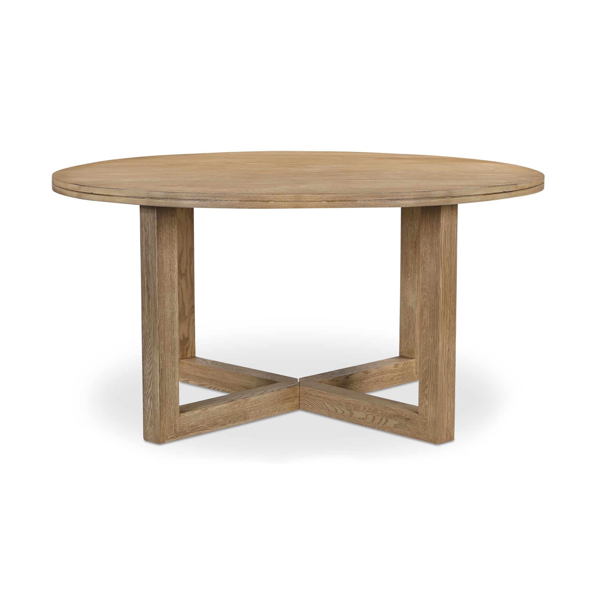 Crafted from solid oak, the Luciano dining table's 40mm thick round top features a thoughtfully crafted V-groove, adding a visual lightness to the substantial surface. The geometric base, with crisscrossing stretchers, grounds the piece with quiet confidence. A wire-brushed finish enhances the oak's organic beauty, creating a focal point of understated elegance.