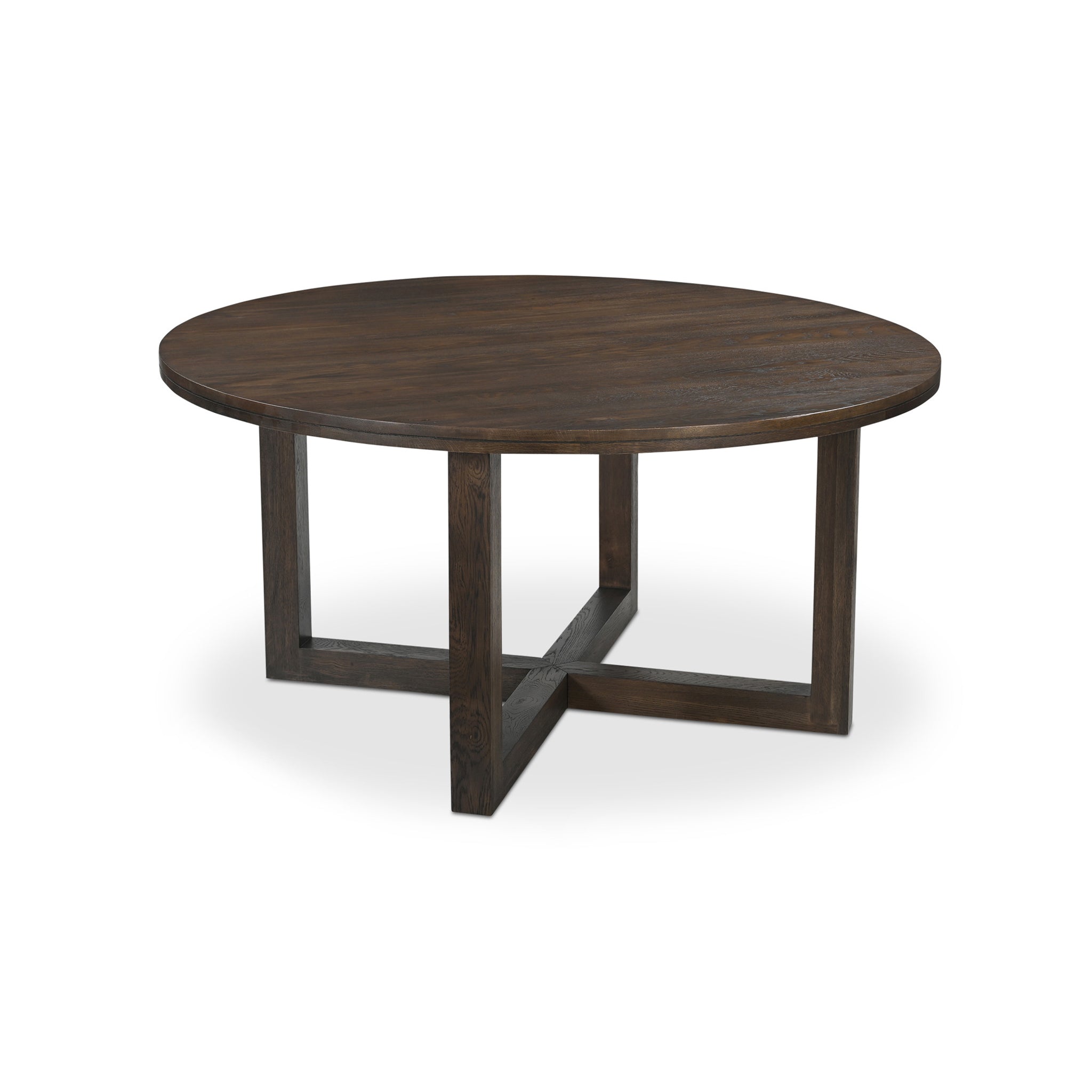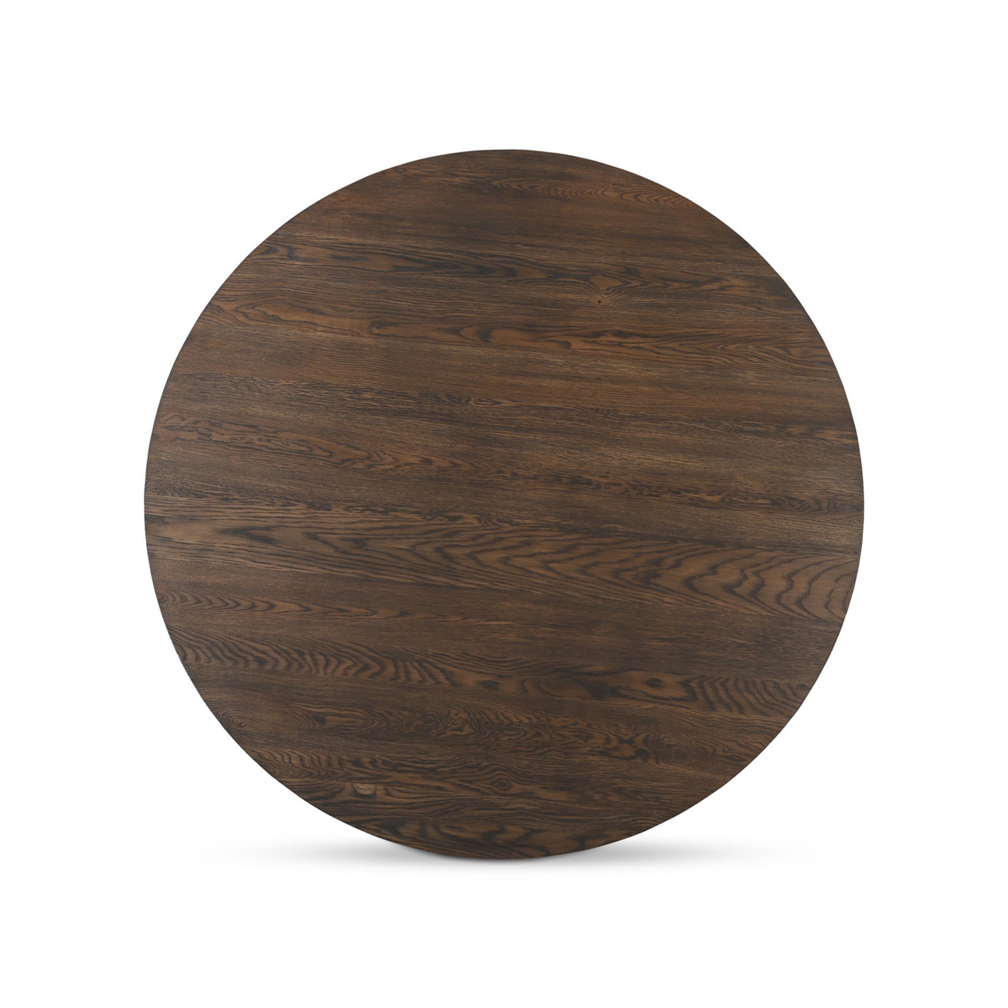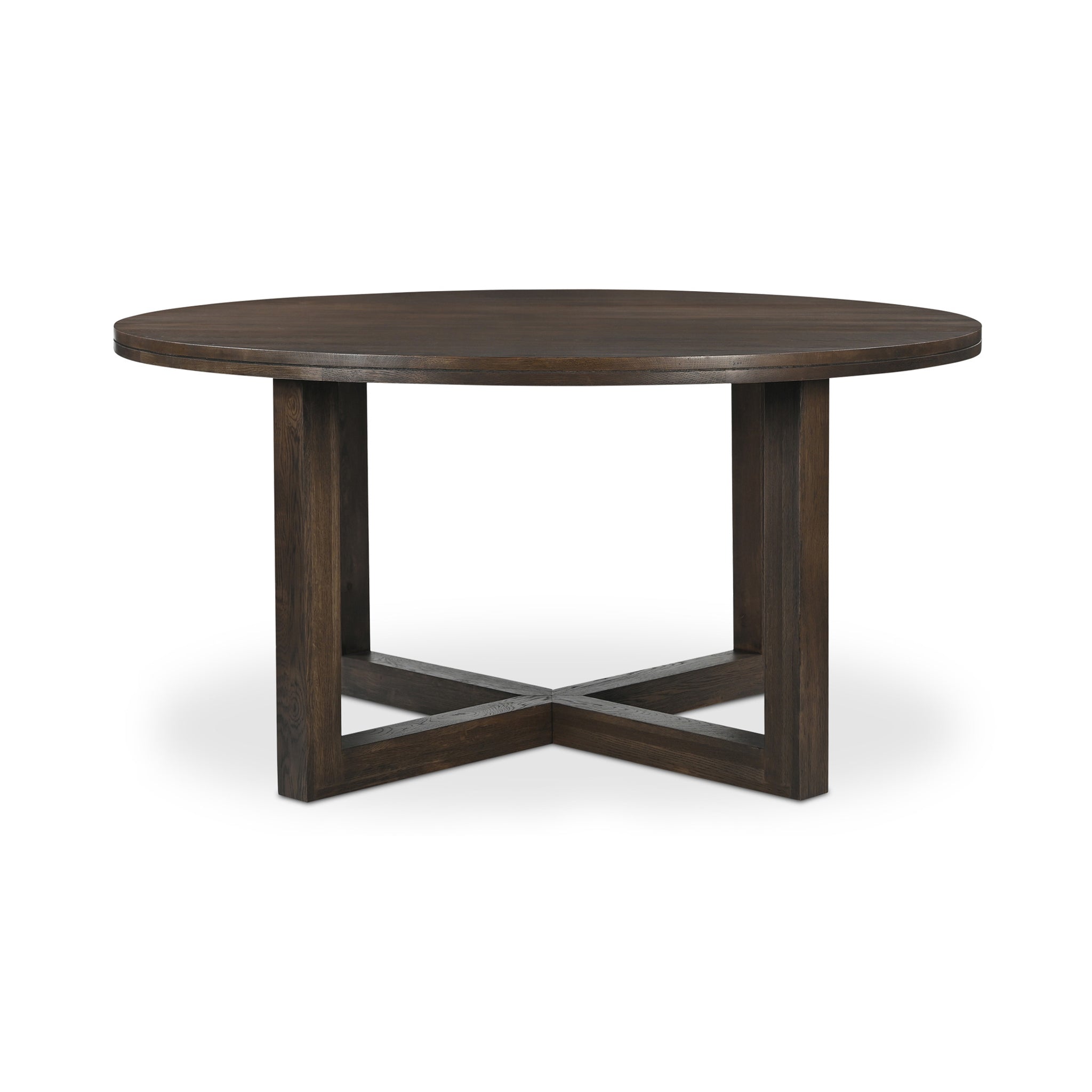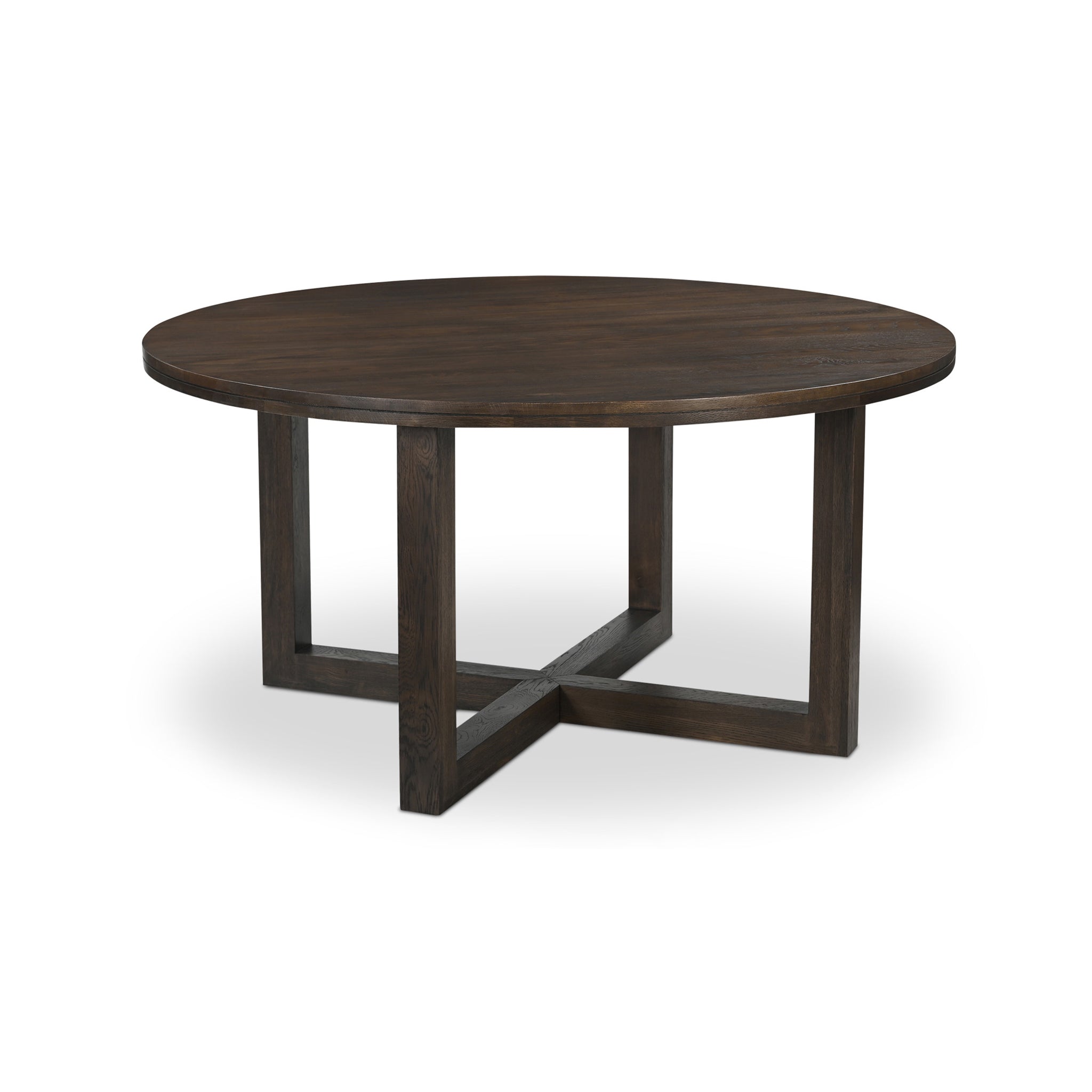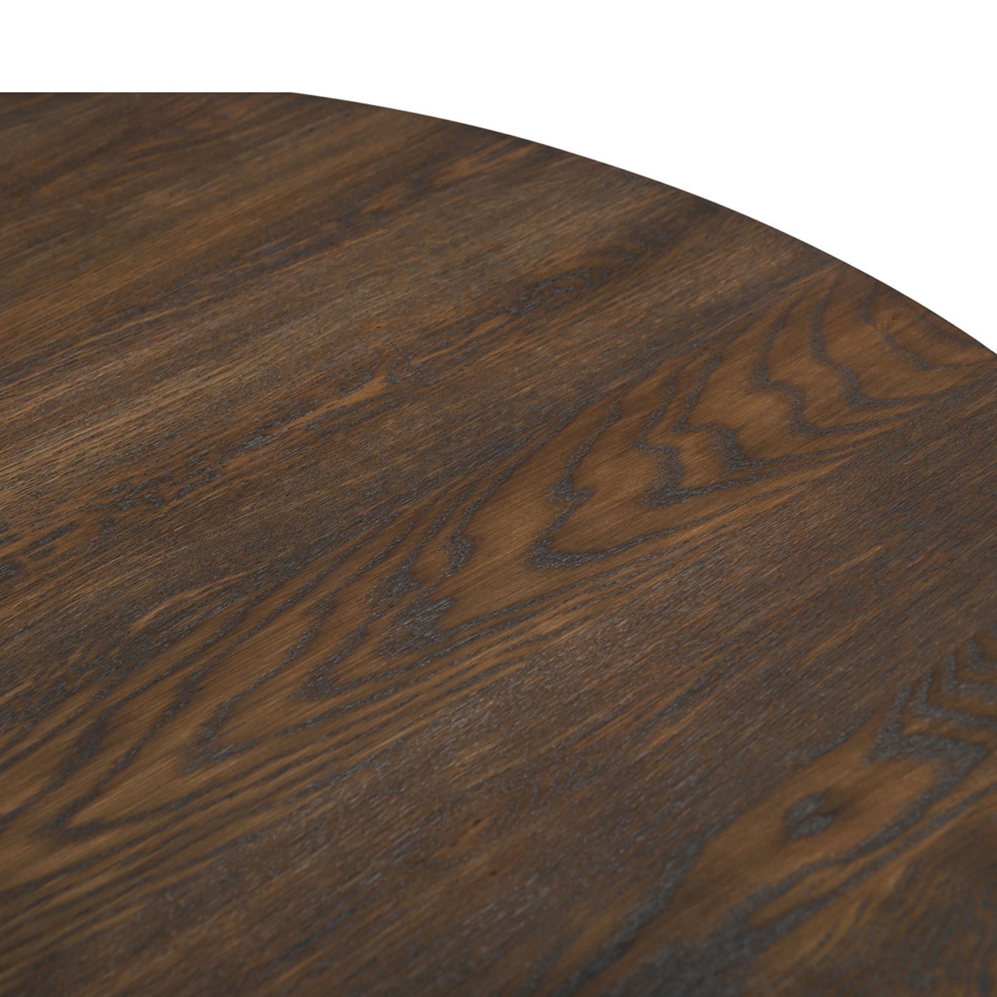 Crafted from solid oak, the Luciano dining table's 40mm thick round top features a thoughtfully crafted V-groove, adding a visual lightness to the substantial surface. The geometric base, with crisscrossing stretchers, grounds the piece with quiet confidence. A wire-brushed finish enhances the oak's organic beauty, creating a focal point of understated elegance.
