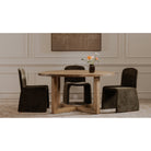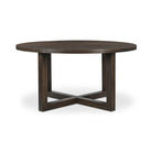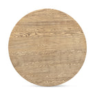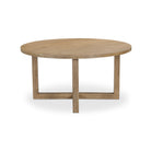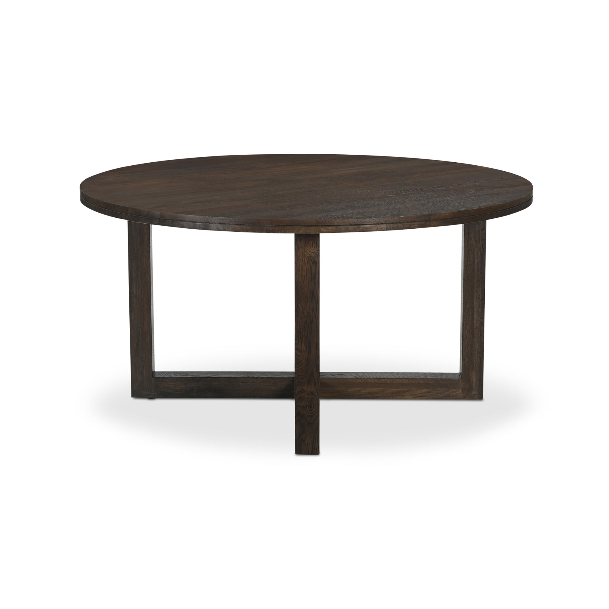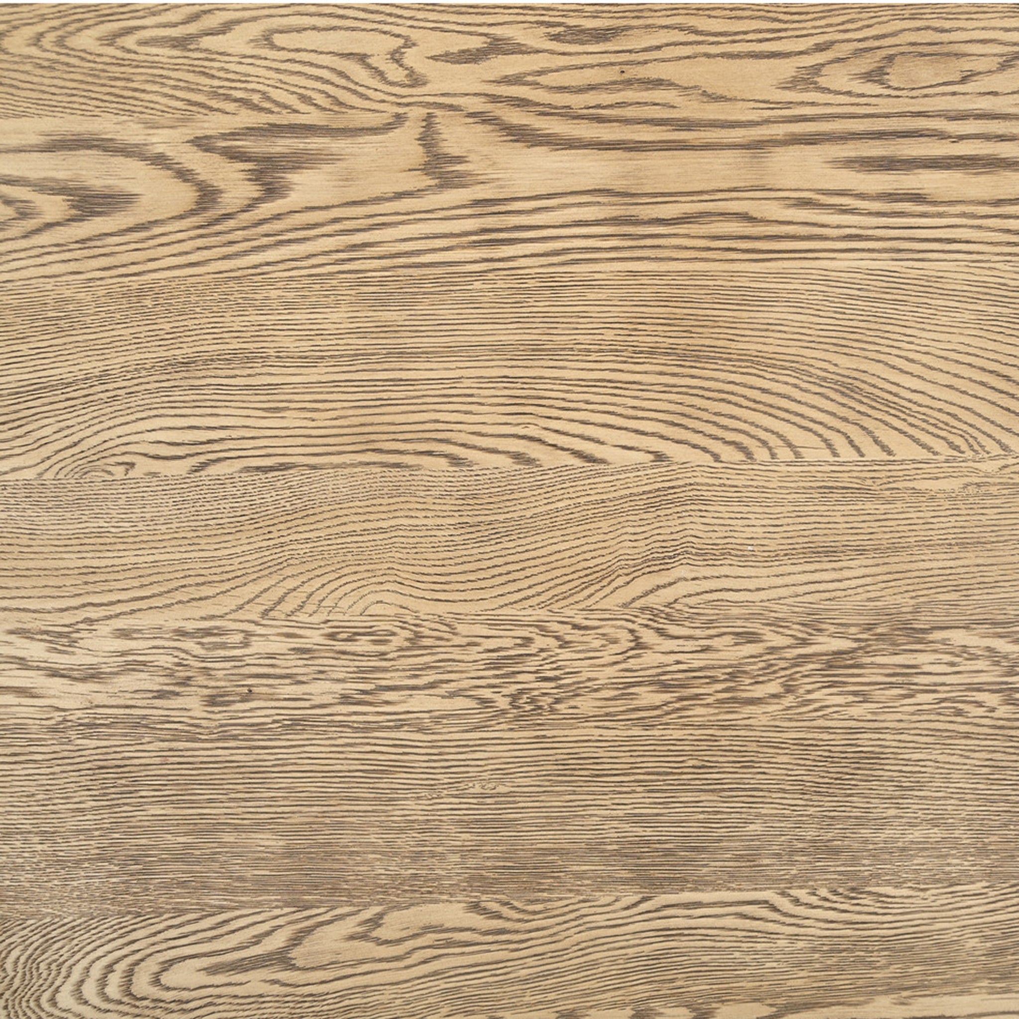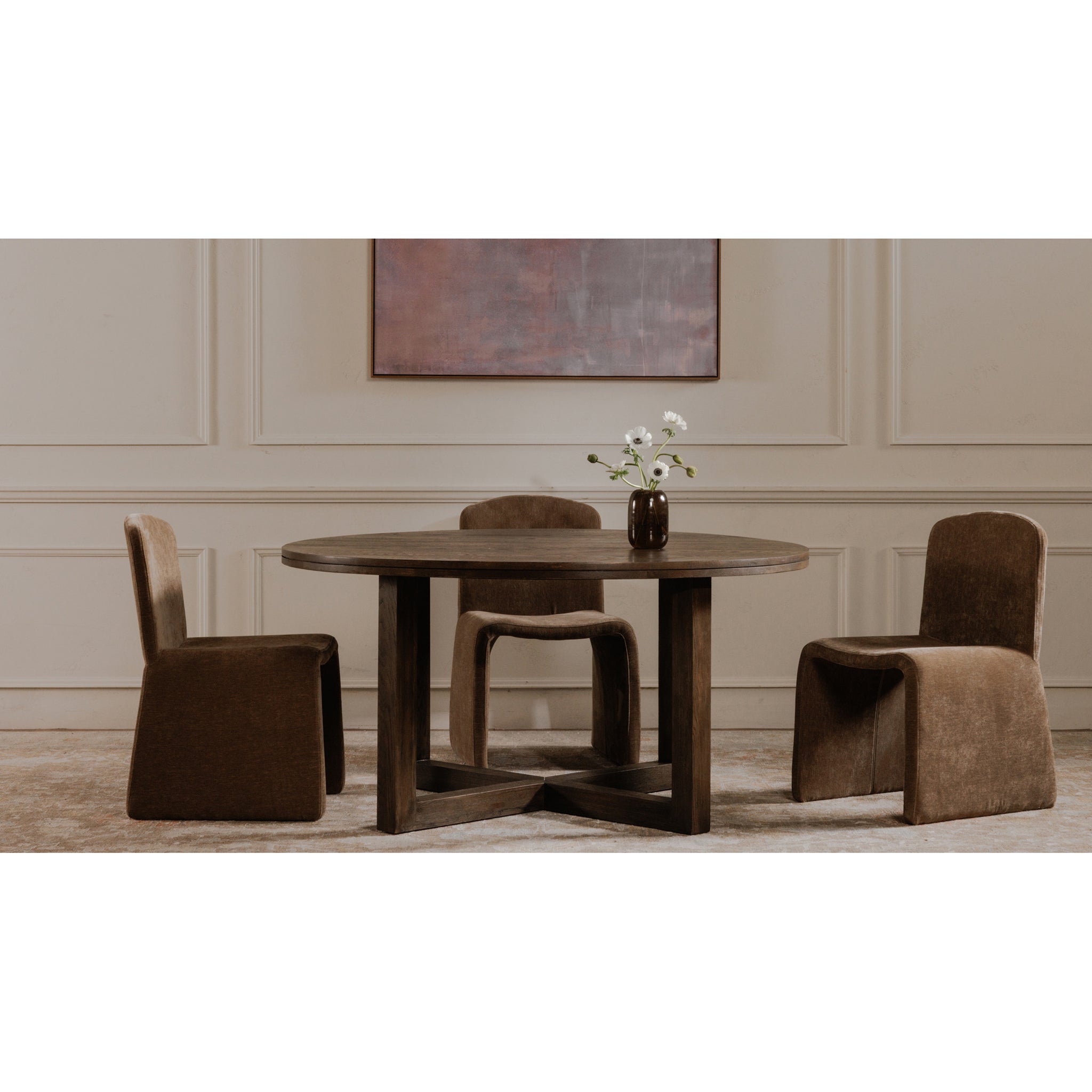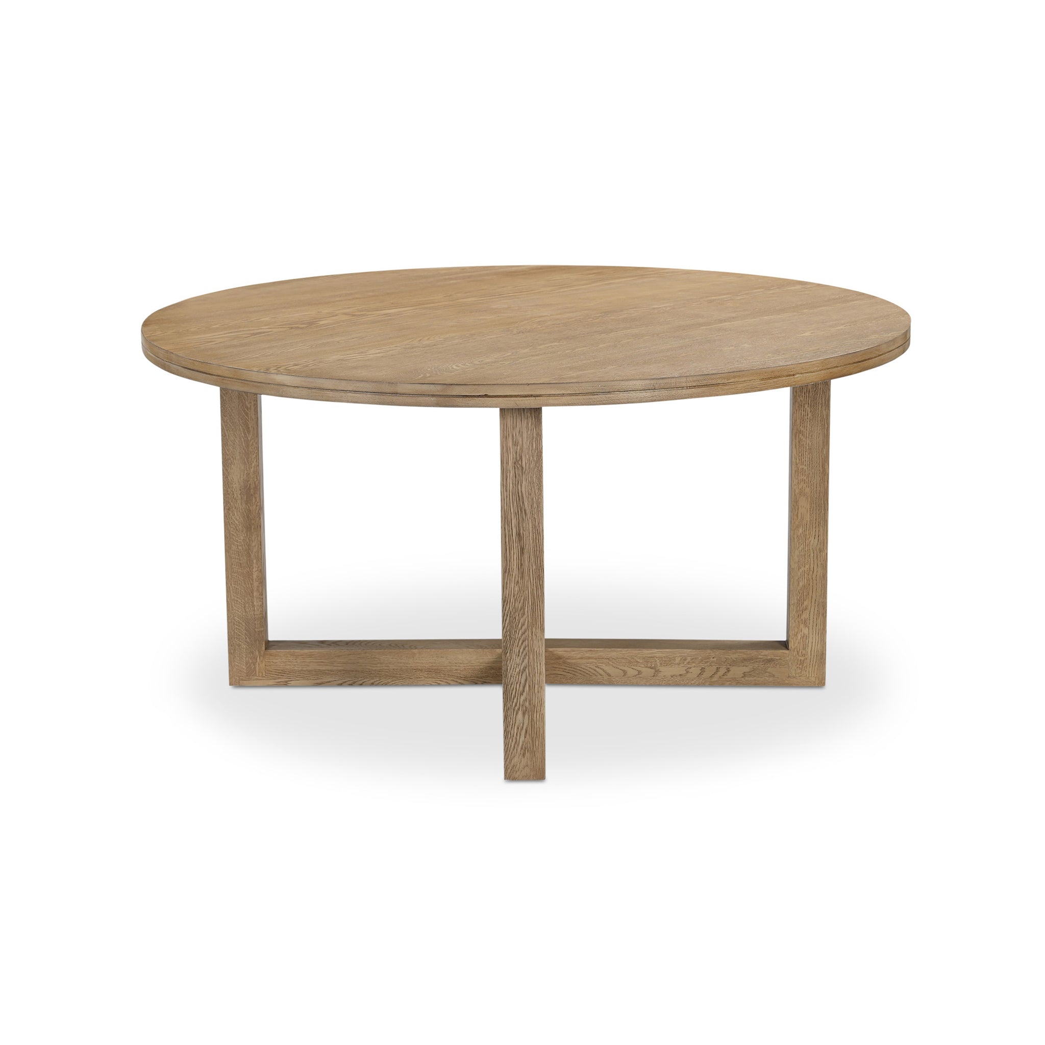 Crafted from solid oak, the Luciano dining table's 40mm thick round top features a thoughtfully crafted V-groove, adding a visual lightness to the substantial surface. The geometric base, with crisscrossing stretchers, grounds the piece with quiet confidence. A wire-brushed finish enhances the oak's organic beauty, creating a focal point of understated elegance.