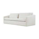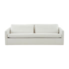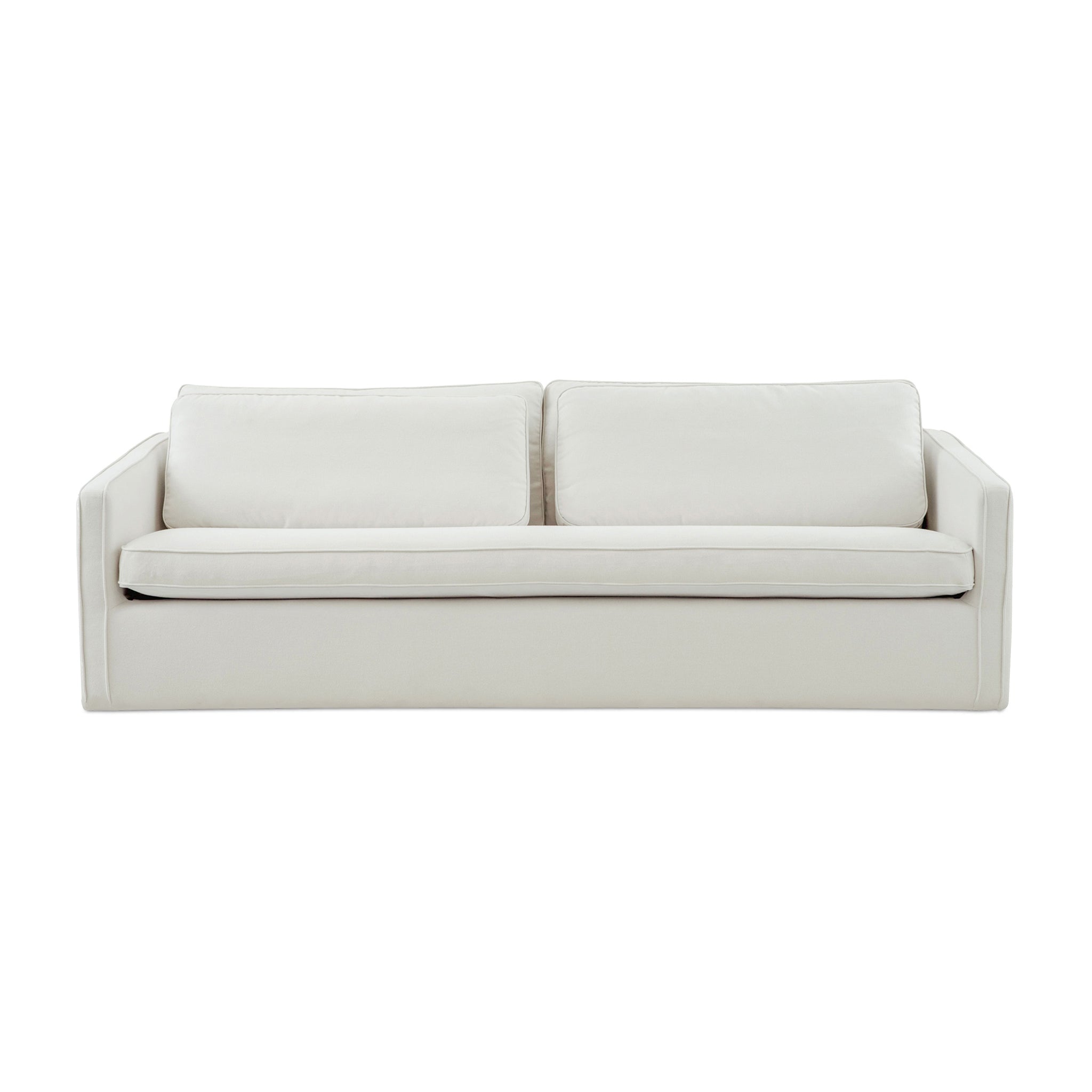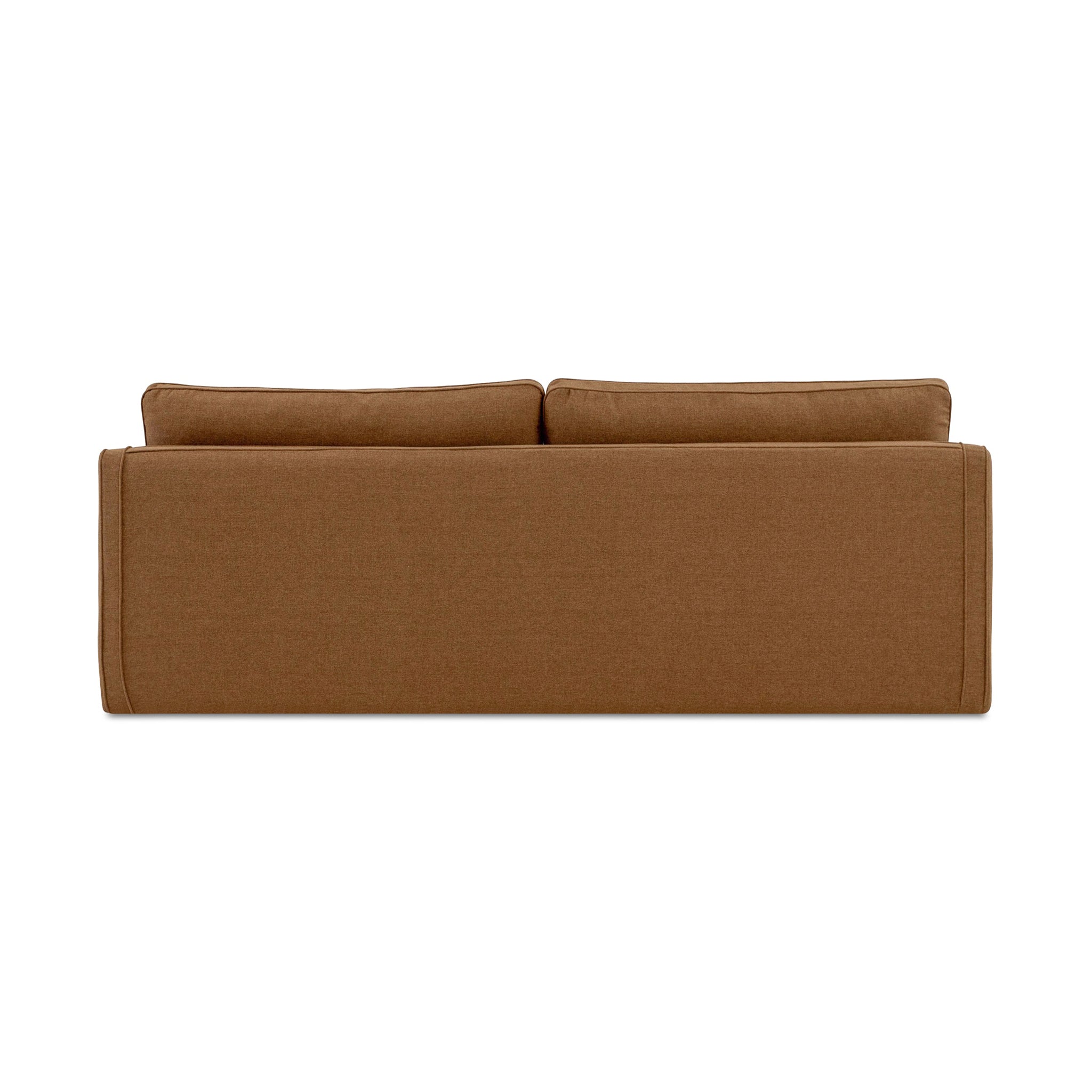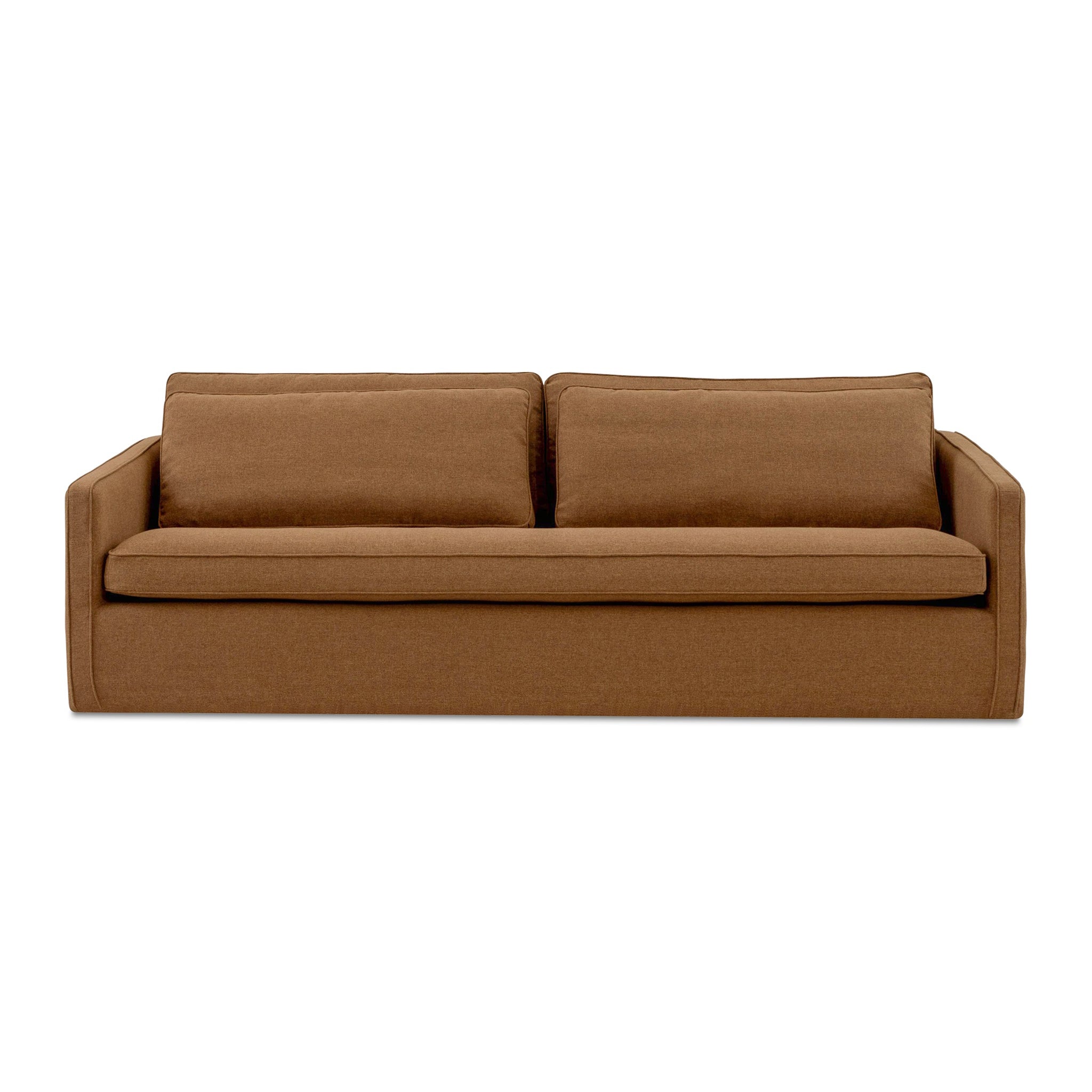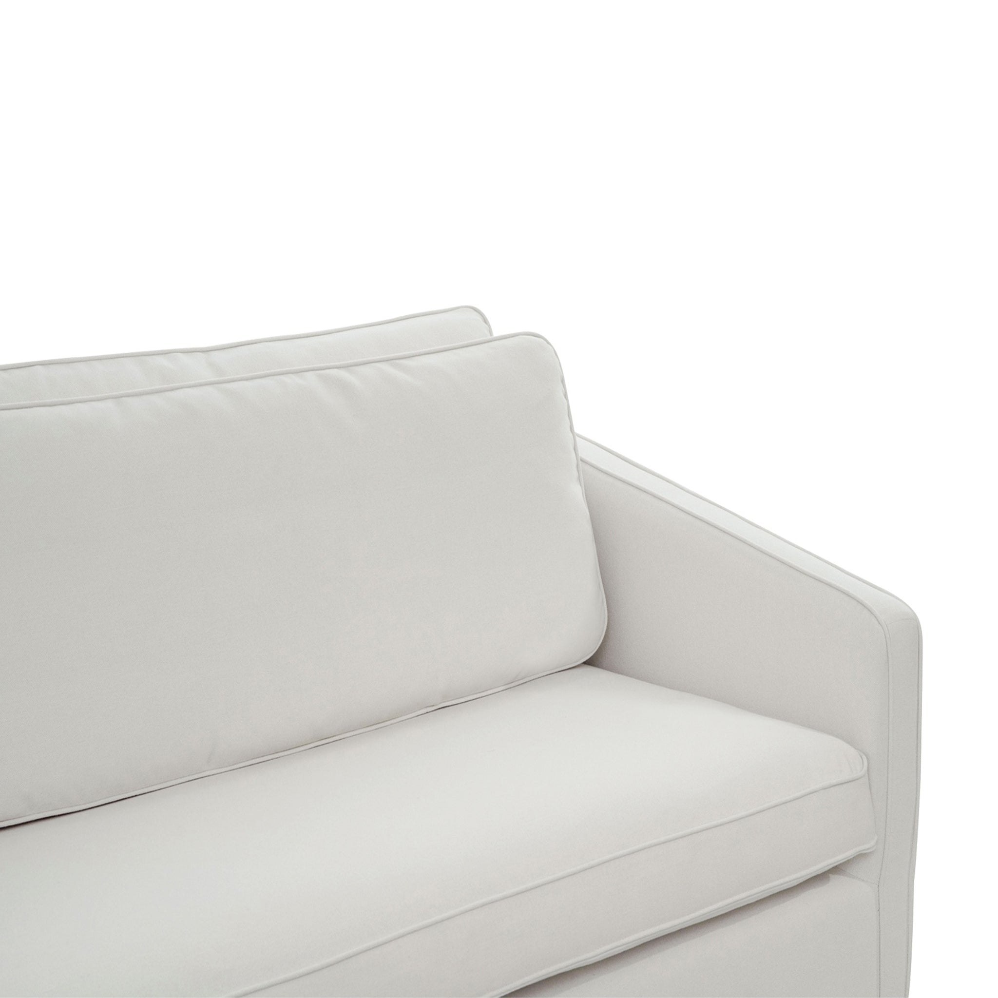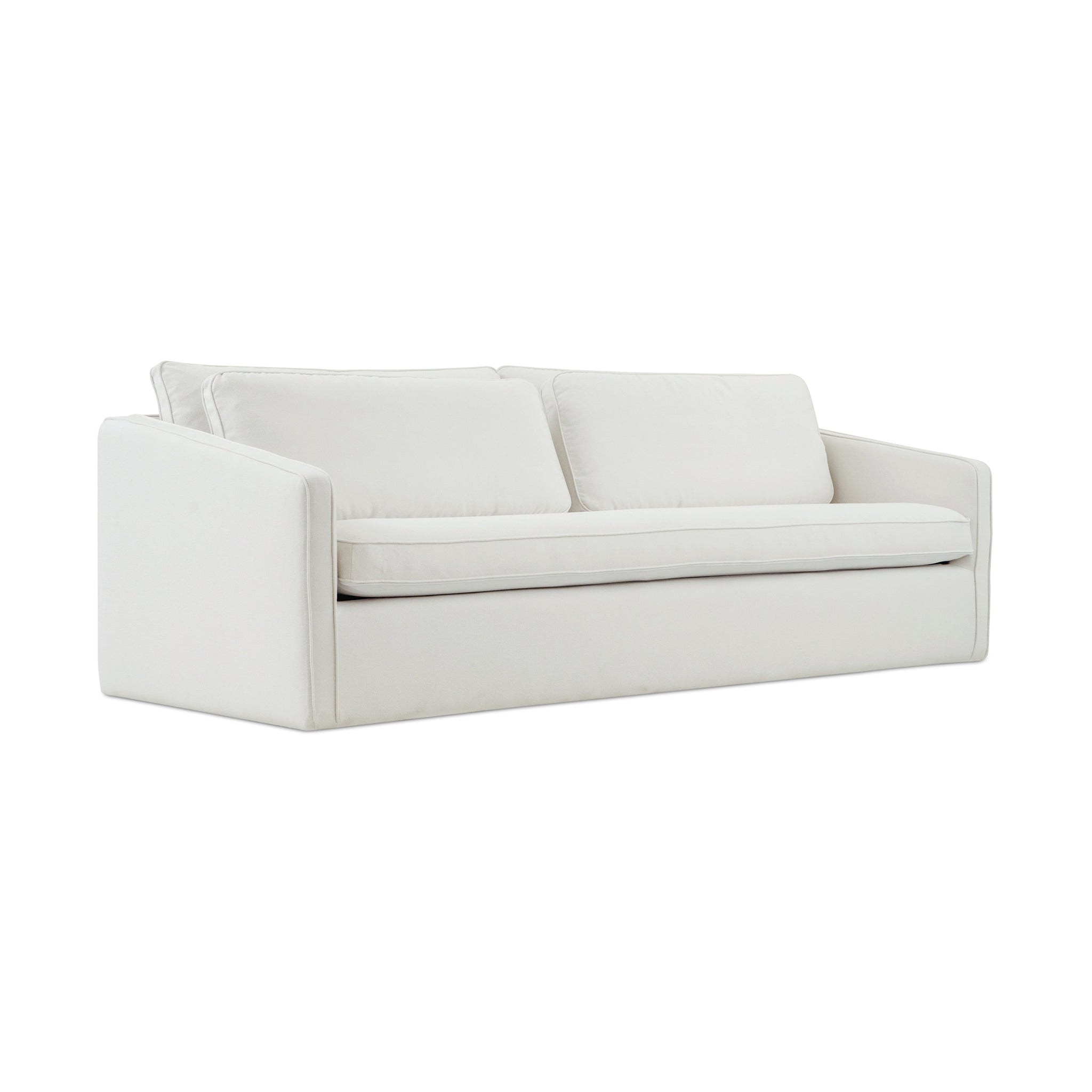 The Pompeo sofa in embodies transitional elegance with its minimalist form and tapered arms. The linear form is softened by a plush, feather-topped bench seat. Delicate piping adorns the arms and layered back cushions, adding tailored finesse. Upholstered in a soft, durable C0 performance fabric, it marries style with practicality.