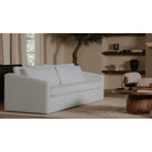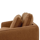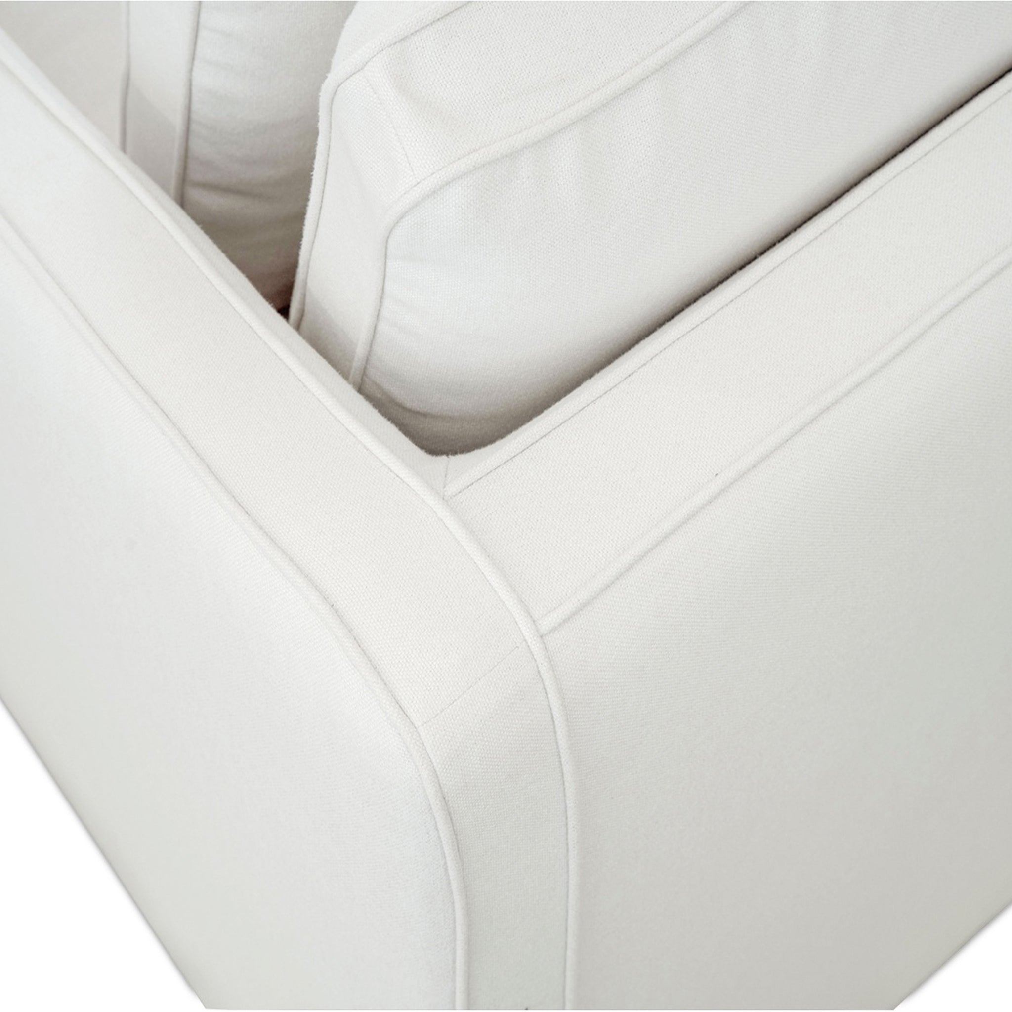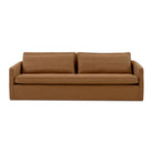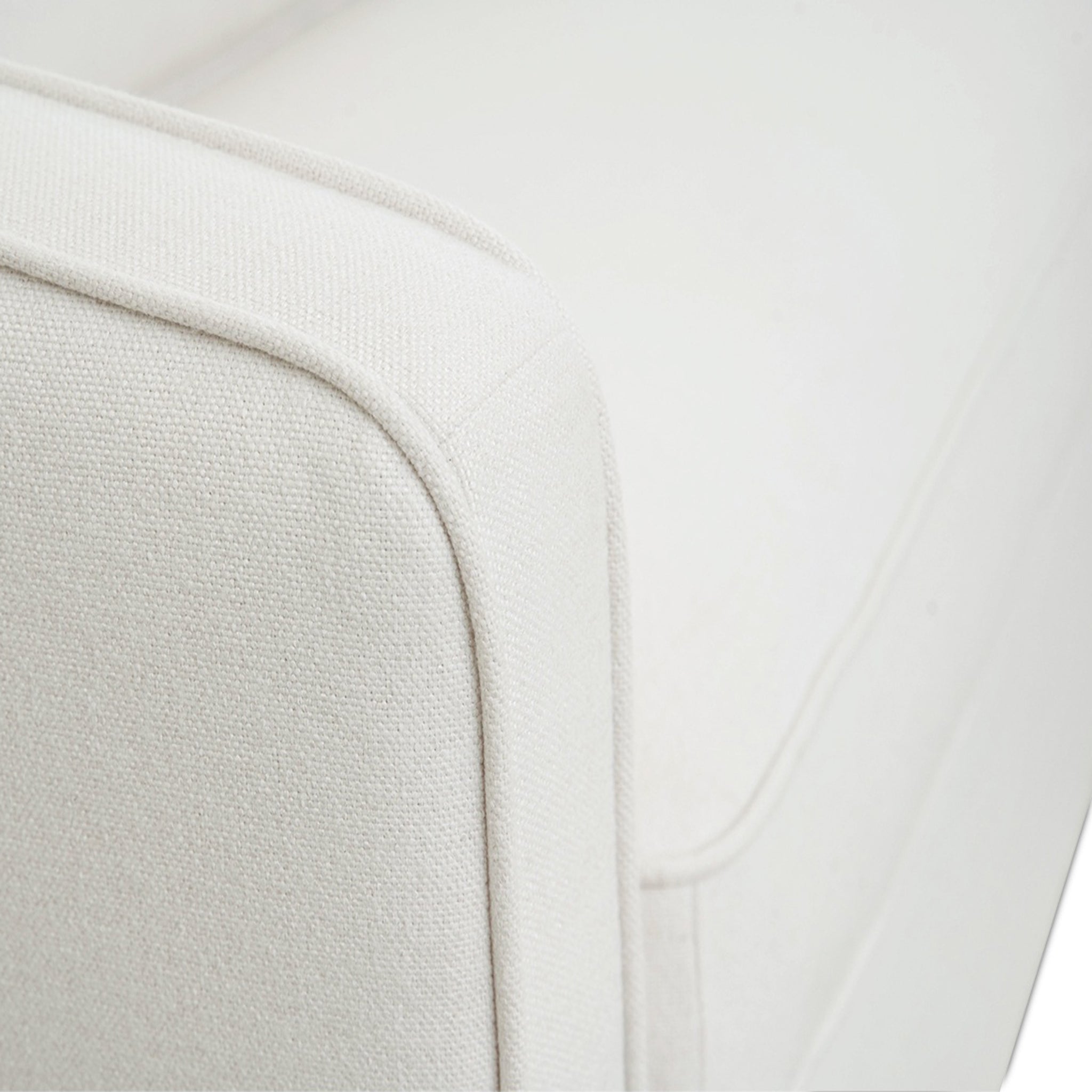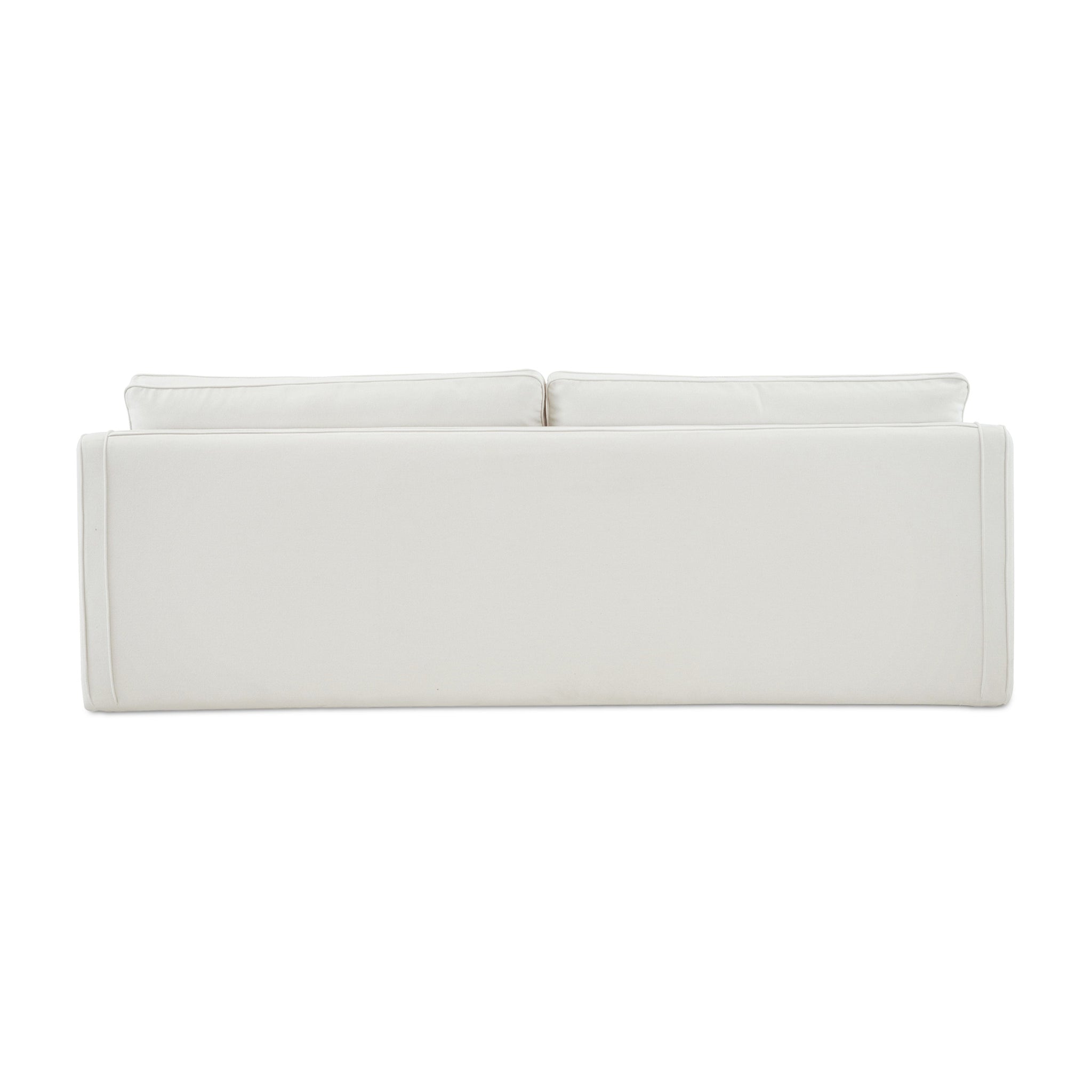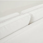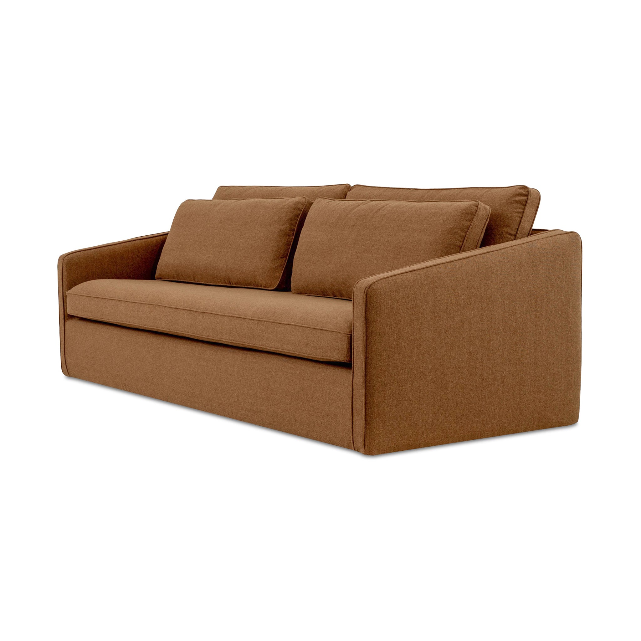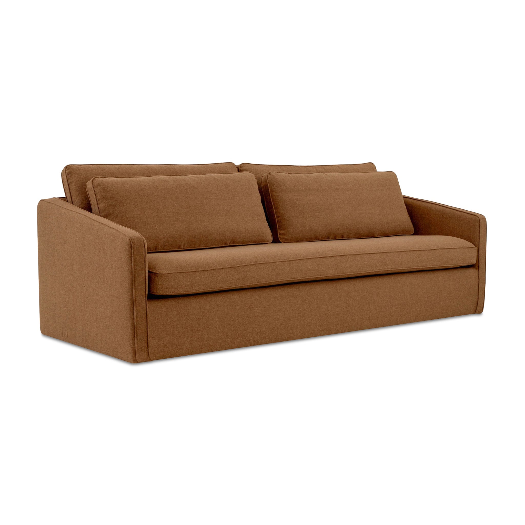 The Pompeo sofa in embodies transitional elegance with its minimalist form and tapered arms. The linear form is softened by a plush, feather-topped bench seat. Delicate piping adorns the arms and layered back cushions, adding tailored finesse. Upholstered in a soft, durable C0 performance fabric, it marries style with practicality.