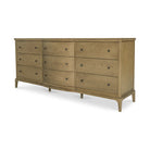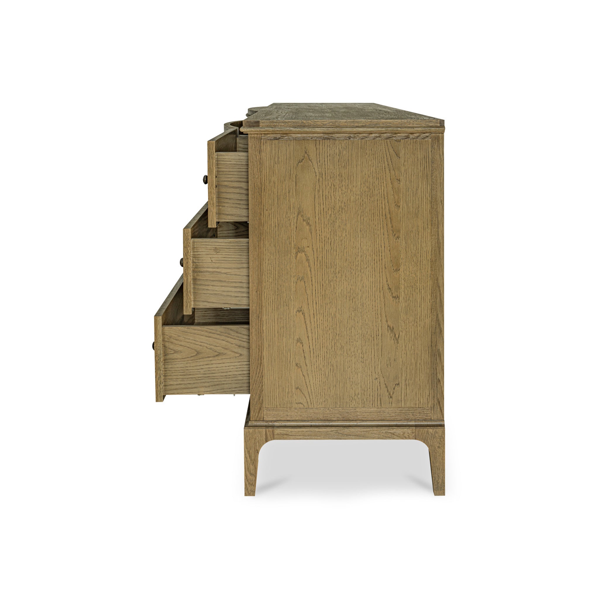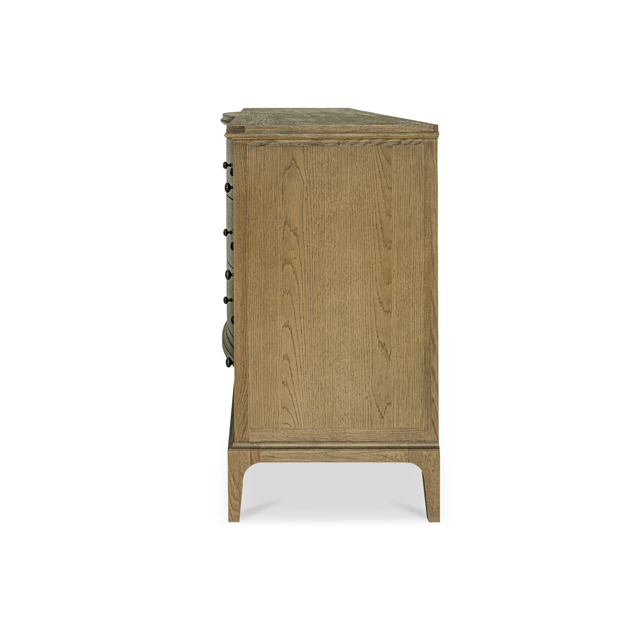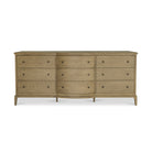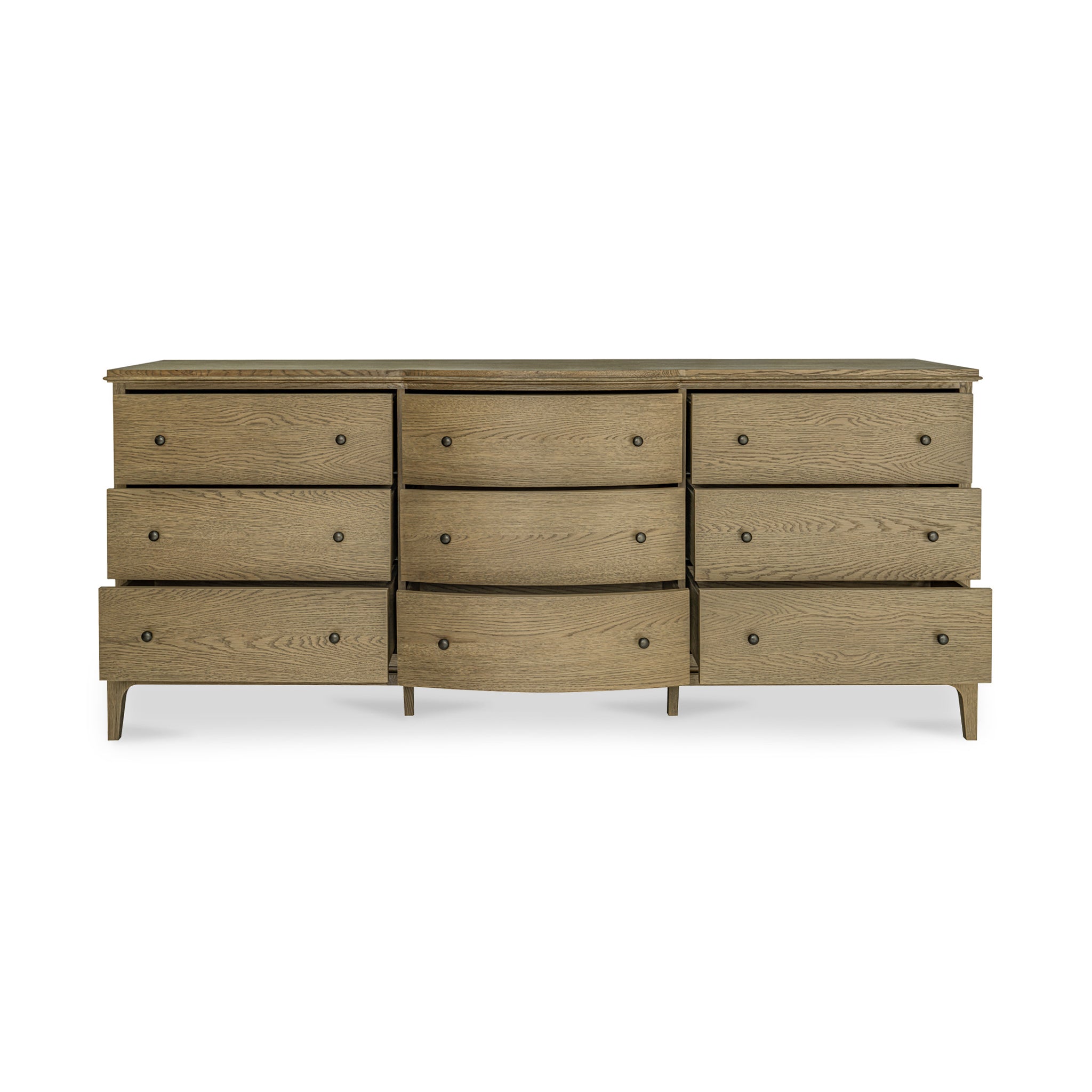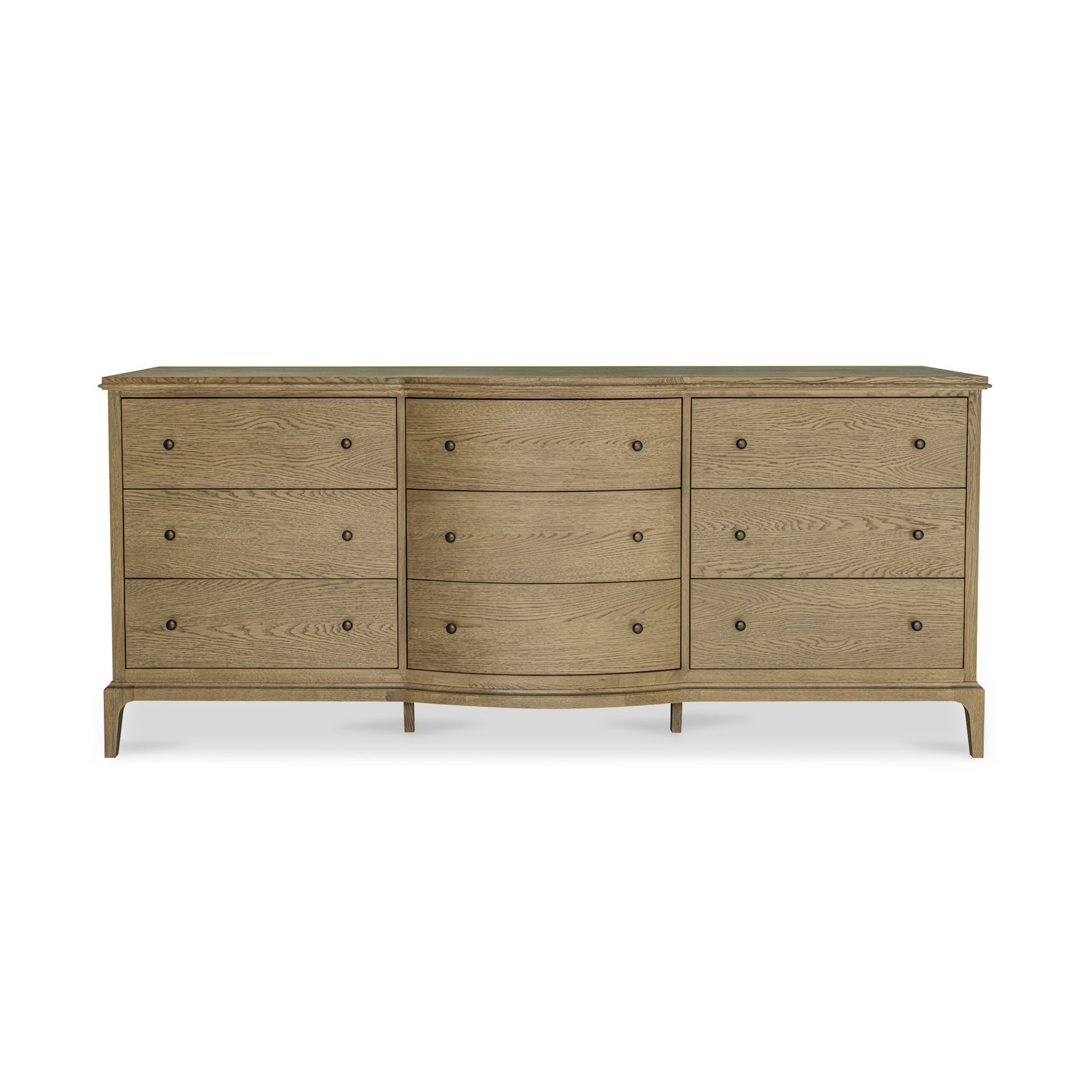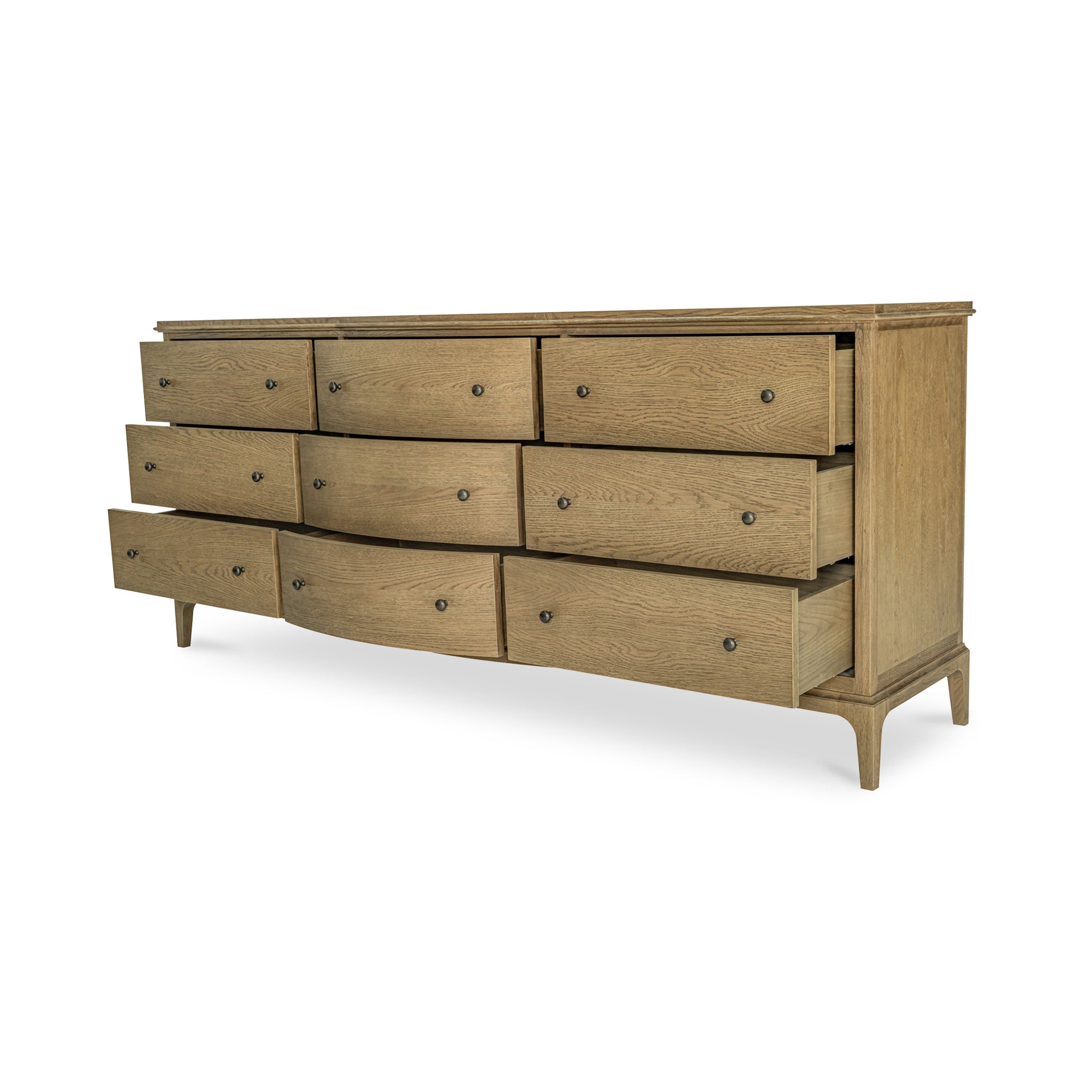 The Sebastian 9-drawer dresser's gentle curves and wire-brushed oak finish embrace modern traditionalism. The artfully designed overhang with rounded edges and curved front offers a soothing visual rhythm. Nine spacious drawers with delicate metal knobs provide ample storage, balancing form and function.