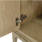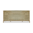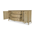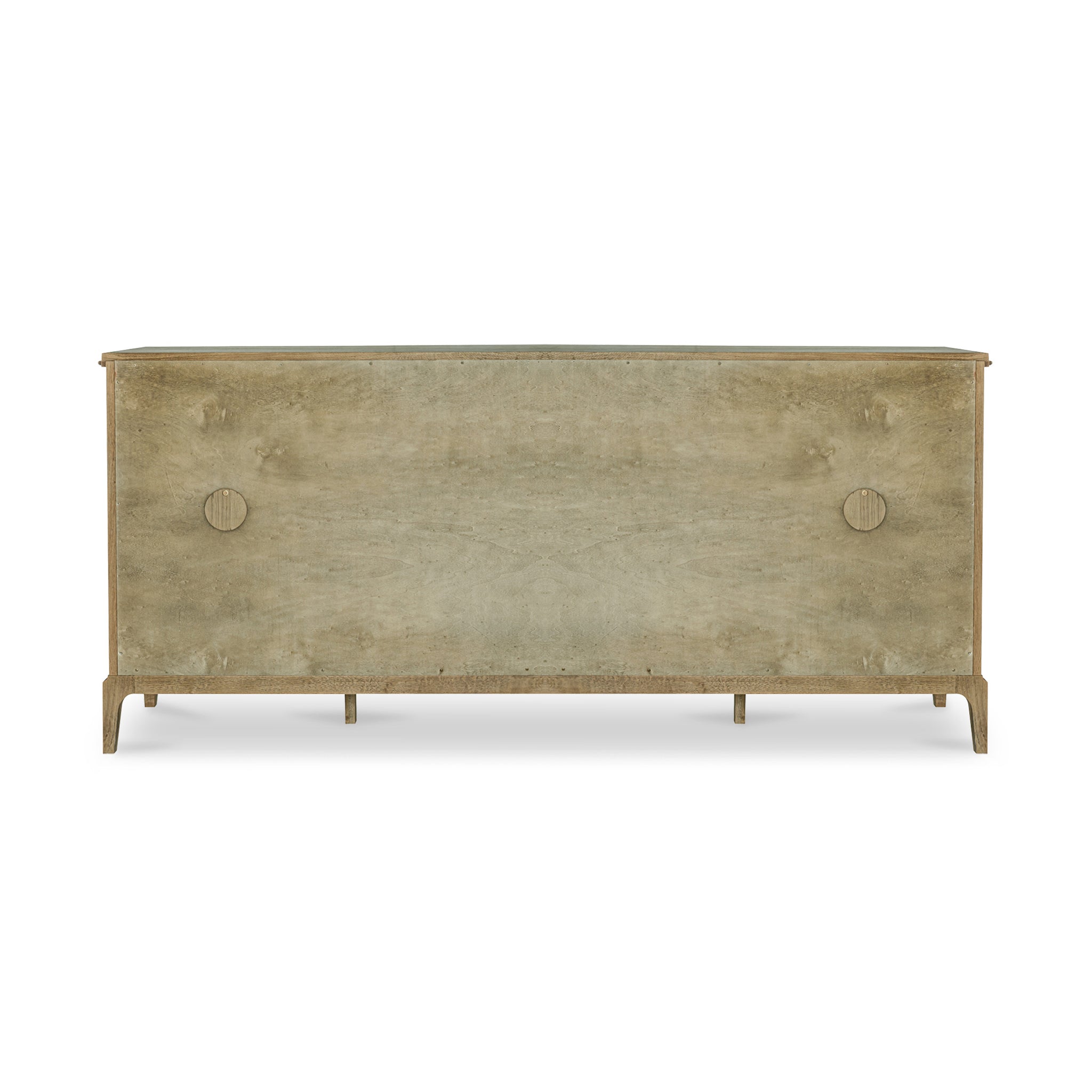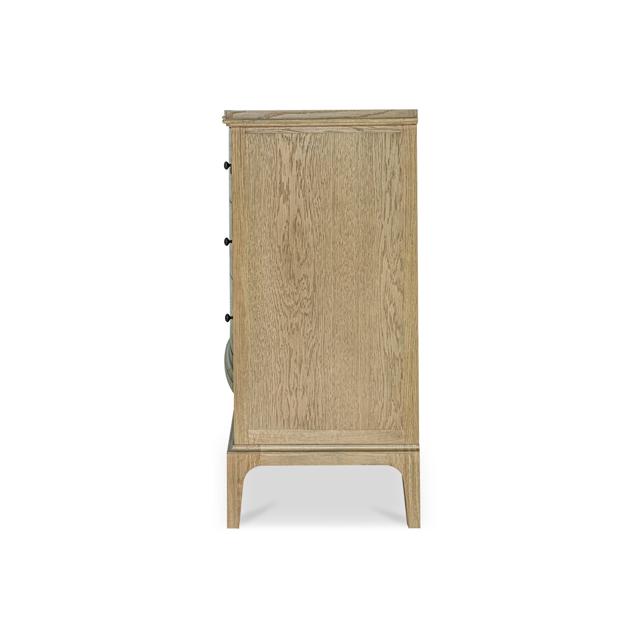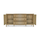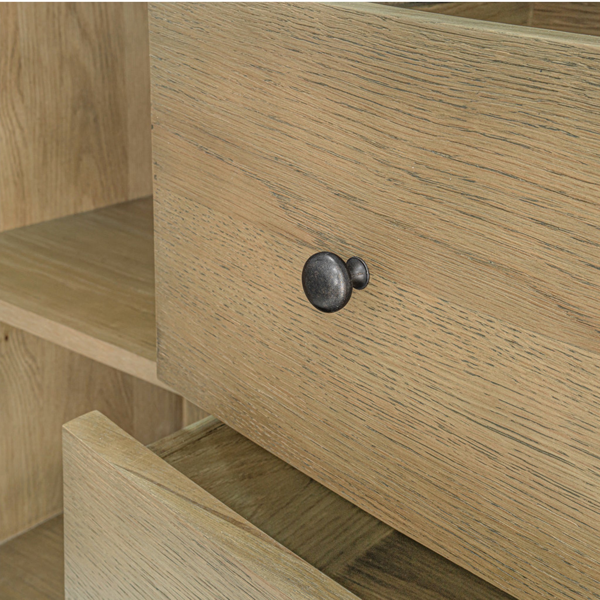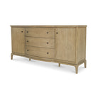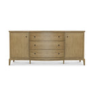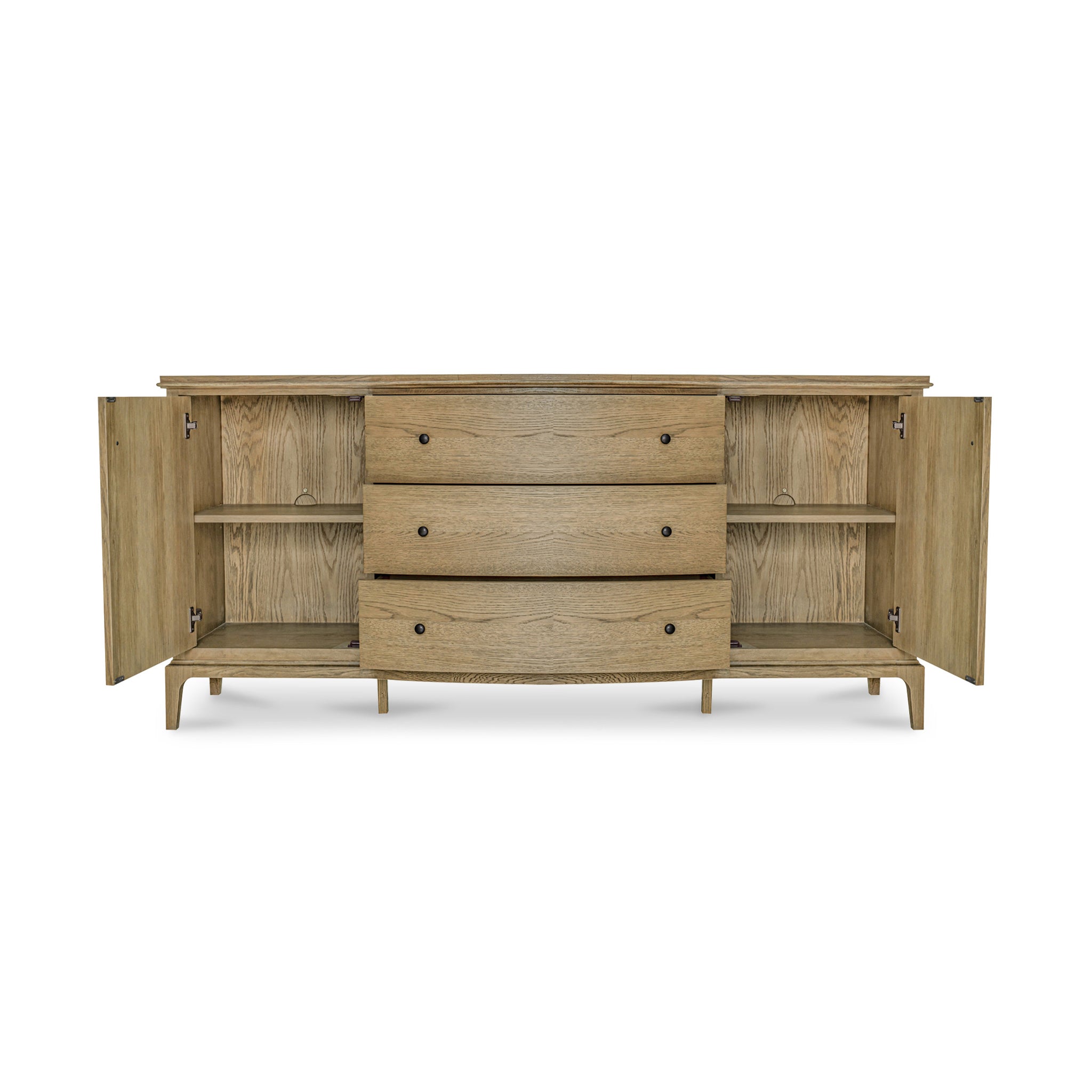 The Sebastien sideboard's gentle curves and wire-brushed oak finish embrace modern traditionalism. The artfully designed overhang with rounded edges and curved front offers a soothing visual rhythm. Three middle drawers provide ample storage, while two holes for media cables allow practical organization.