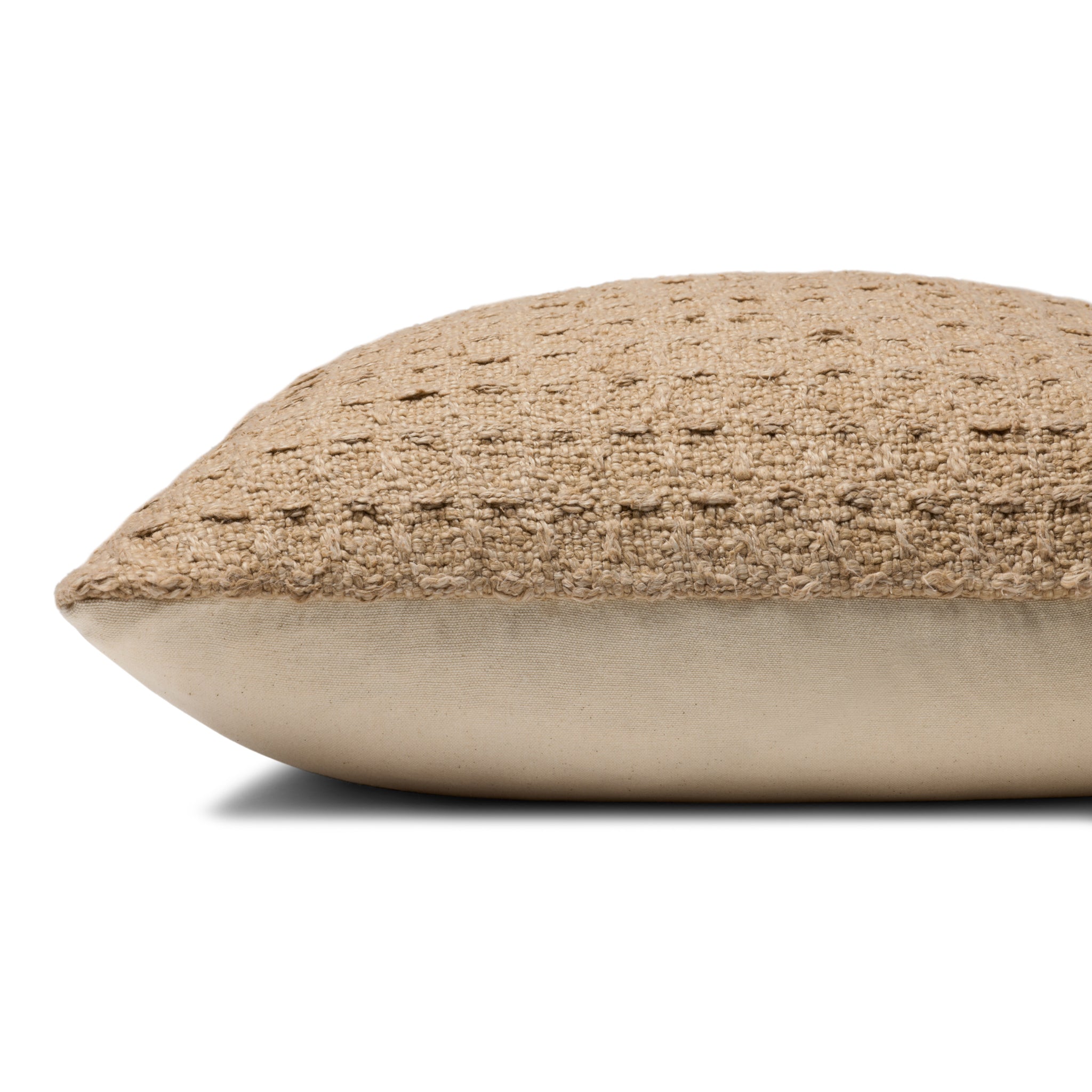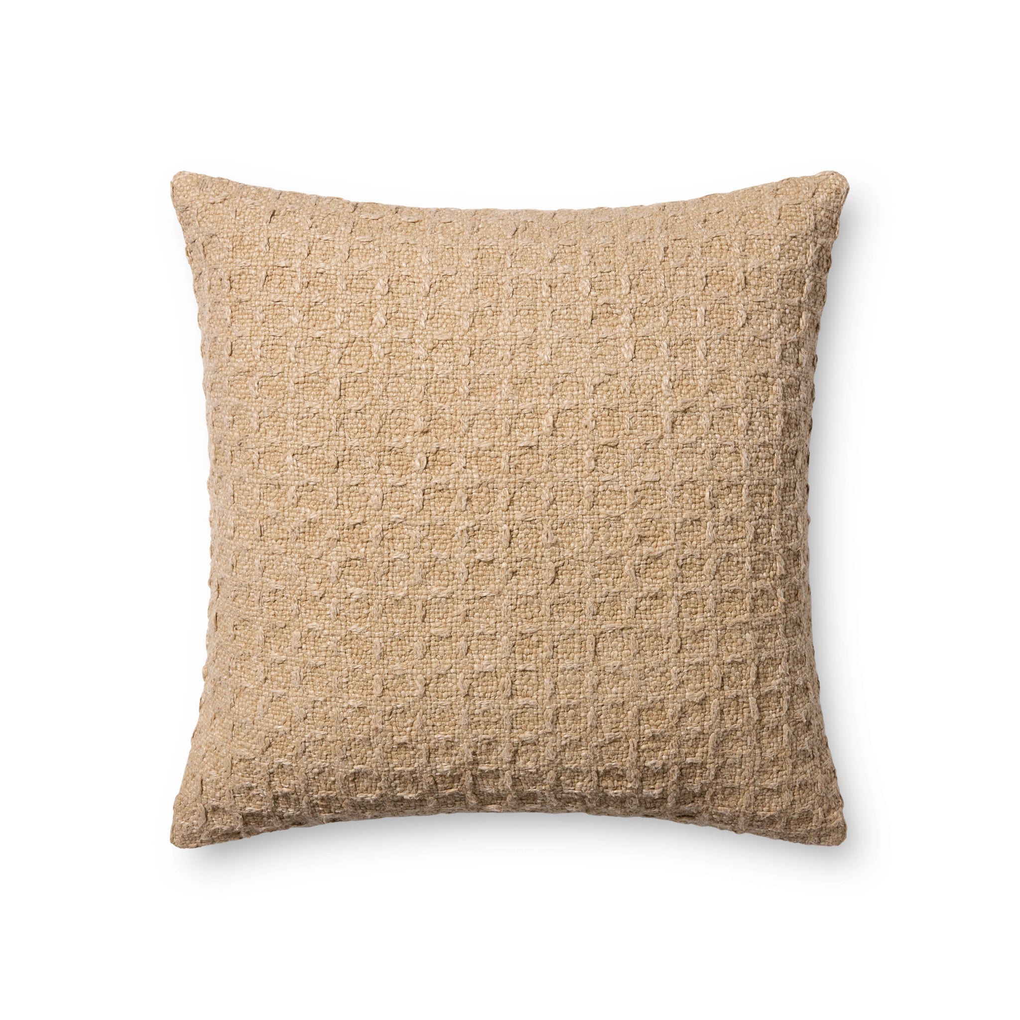Alinah is a neutral tan throw pillow from Amber Lewis x Loloi with a waffle texture, a timeless design for sophisticated home decor. The pillow cover is woven of cotton and polyester in India and measures 22" x 22", a versatile size for living rooms and bedrooms.