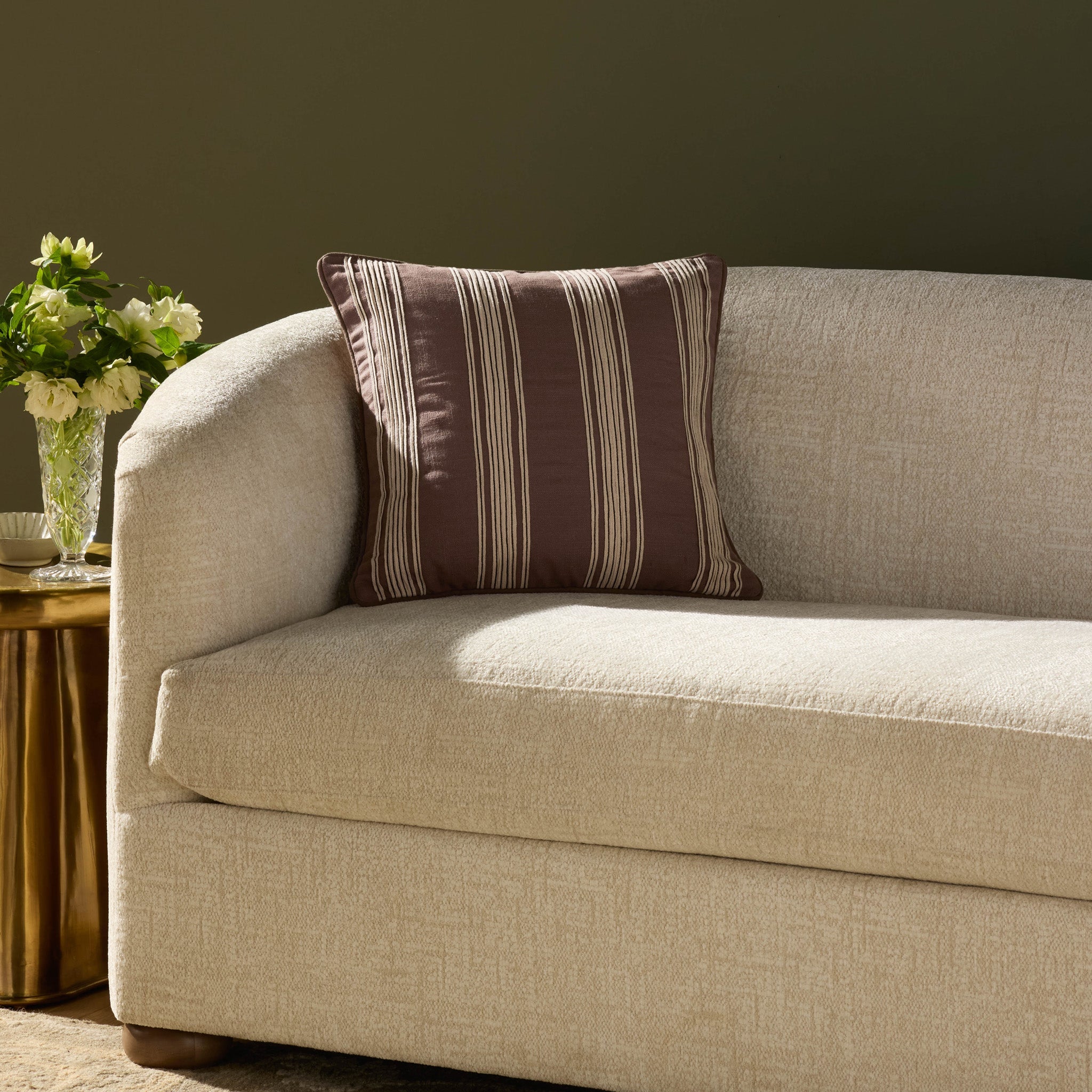 The Verona throw pillow by Chris Loves Julia x Loloi features a classic wide ribbon stripe; a versatile design for many home decor styles. The brown-striped pillow is made of 100% cotton in India and measures 18" x 18", a standard size to style in living rooms and bedrooms.