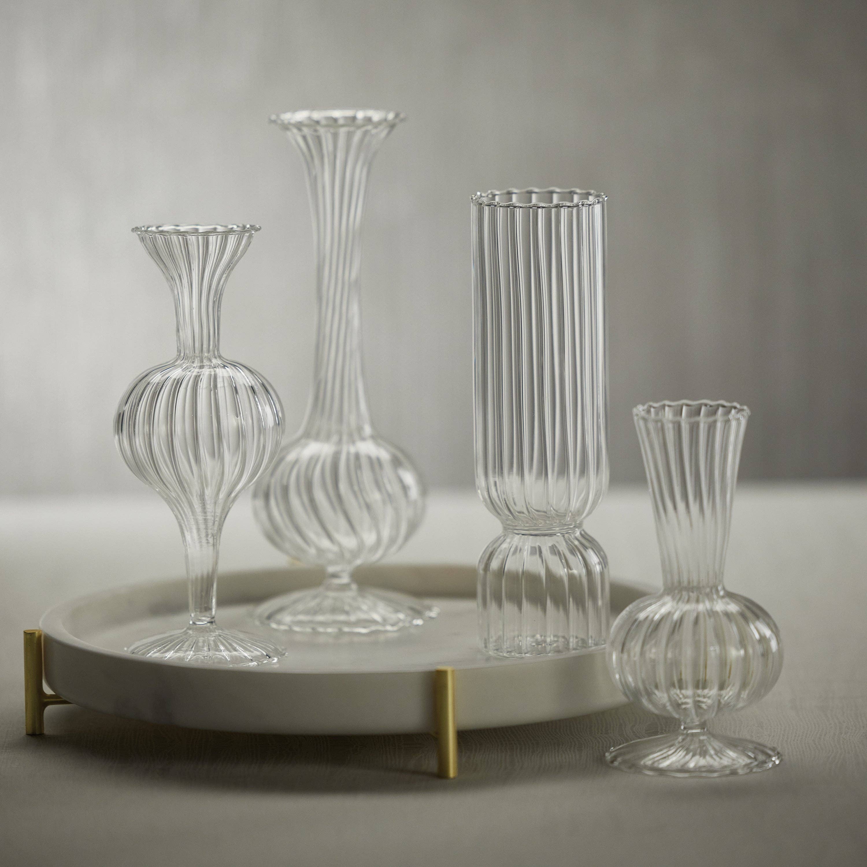 Elevate your decor with the Bella Optic Bud Vase, a refined piece crafted from clear glass featuring a distinctive ribbed stem. Its elegant simplicity seamlessly complements both formal settings and everyday arrangements, allowing you to showcase a variety of blooms with grace. This sophisticated vase adds a subtle yet striking touch, making it an ideal accessory for enhancing any space with timeless charm. Sold as a set of 4. Perfect for every corner of your home or neatly displayed in a row as a centerpiece for your dining table.