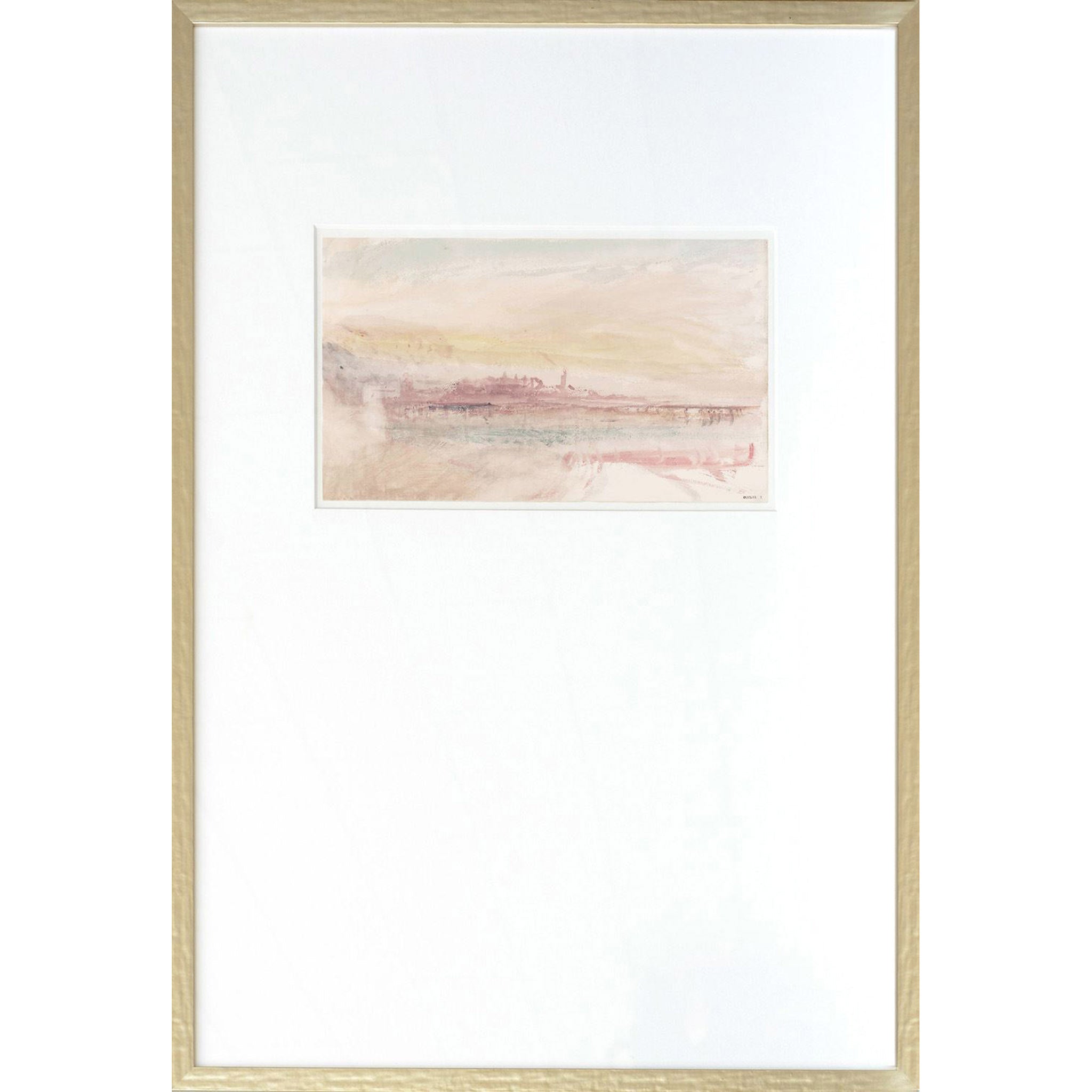William Turner was an English romanticist painter who is credited with being a precursor to the French Impressionist movement. His broadly applied atmospheric washes of paint earned him the title of 'the painter of light'. Inspired by spectacular sunsets in 1816 England. Each of the Turner Scapes is off set in a double thick oversize, bottom weighted matte with a fine mottled silver frame.