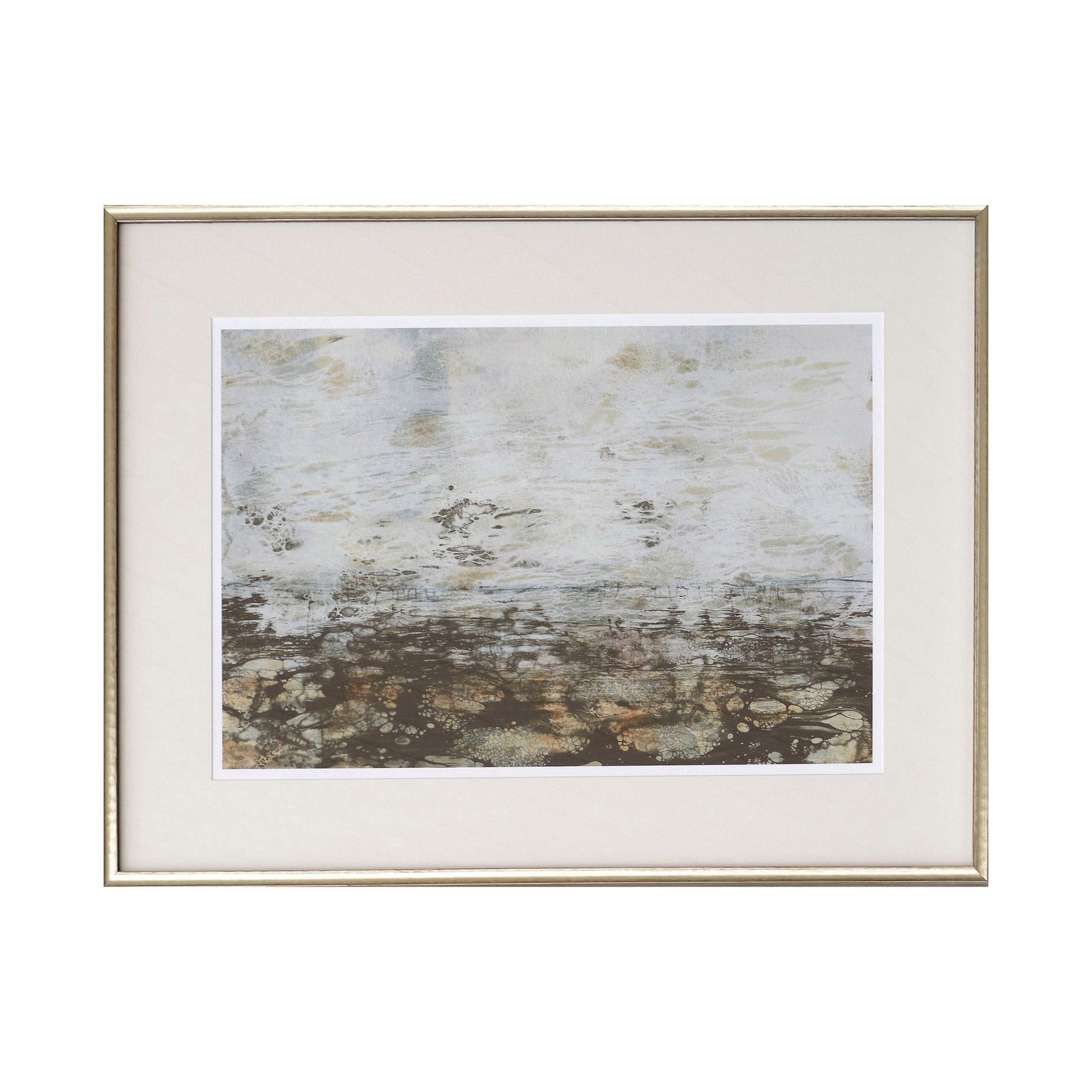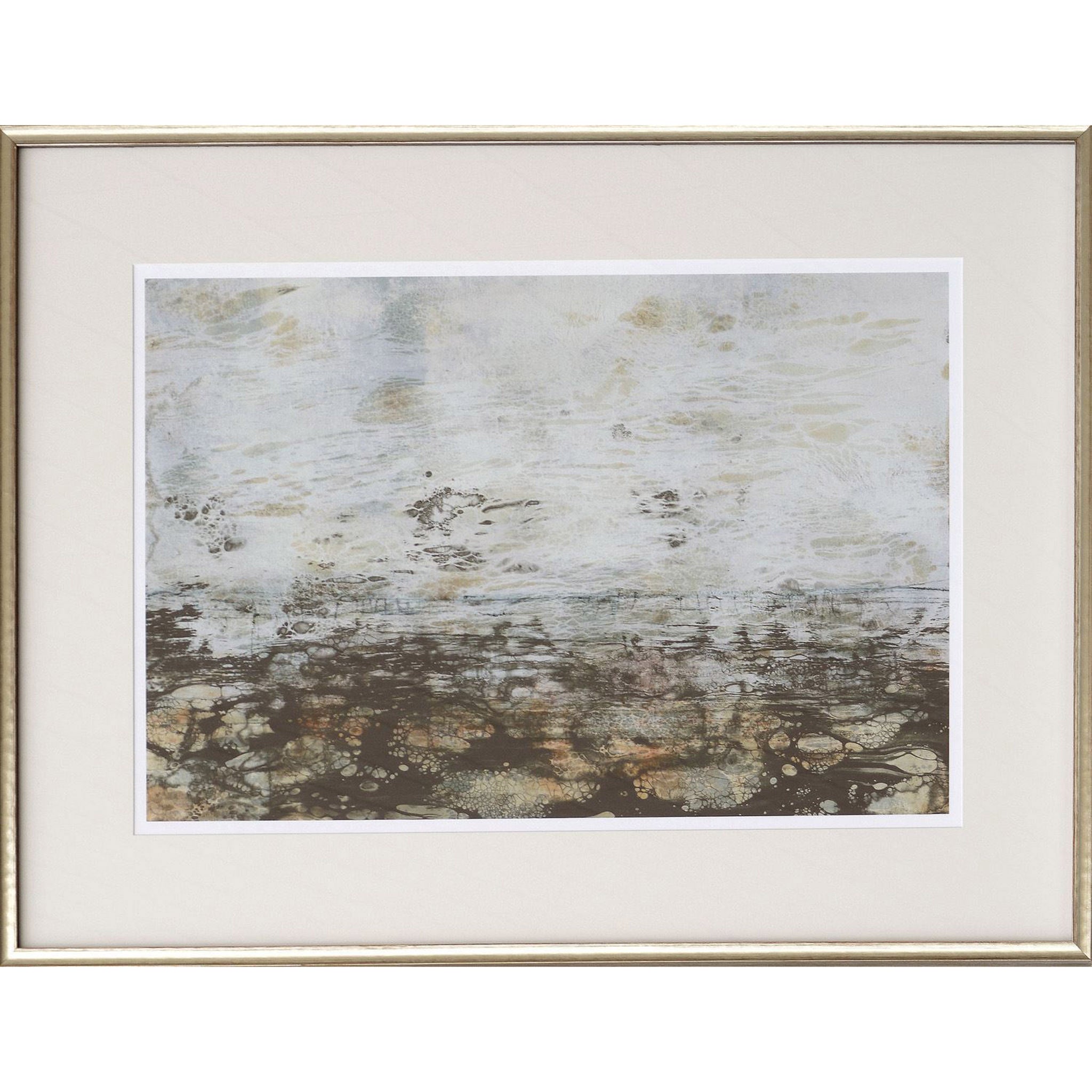 Experience layer upon layer of shifting textures in Jennifer Goldberger' s Neutral Horizons. She uses varying blush, soft green and neutral tones to create soft, watery expressions. Framed in elegant grey washed profile with silver face.