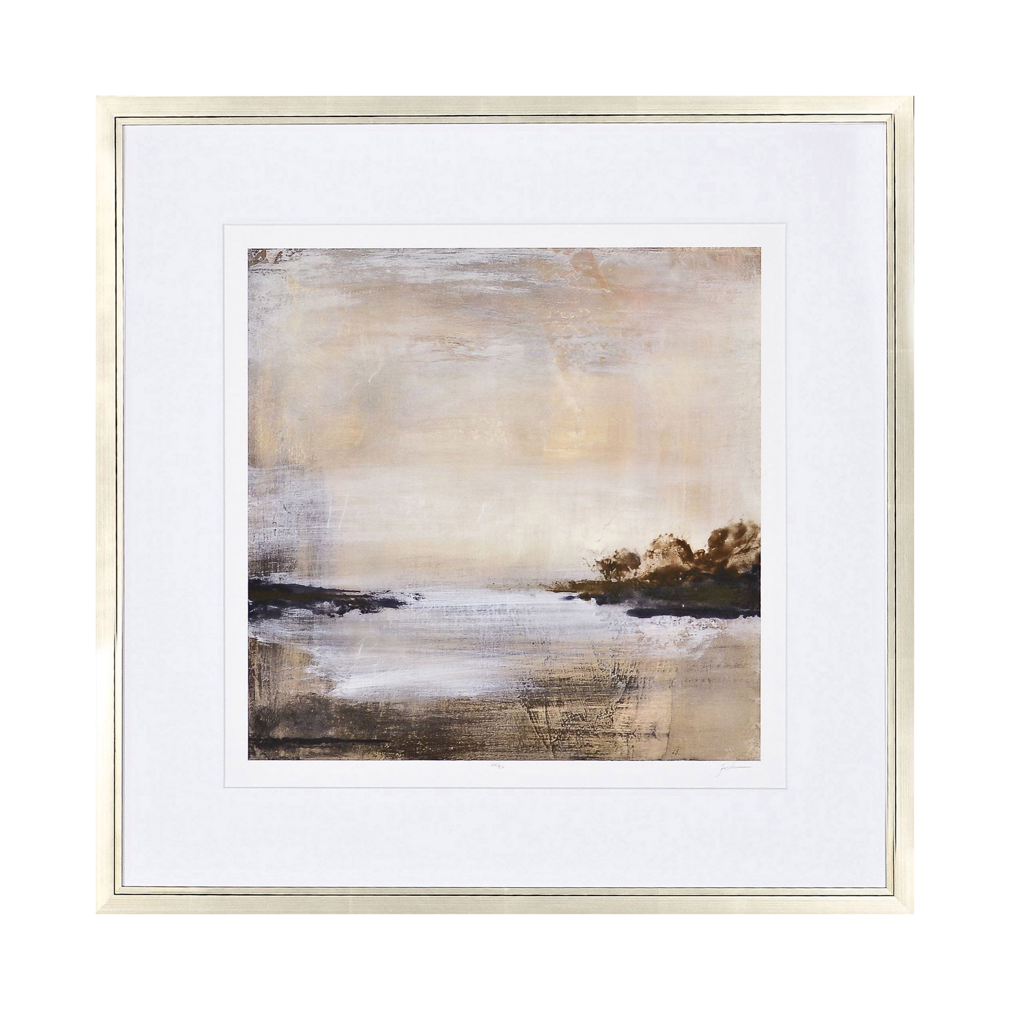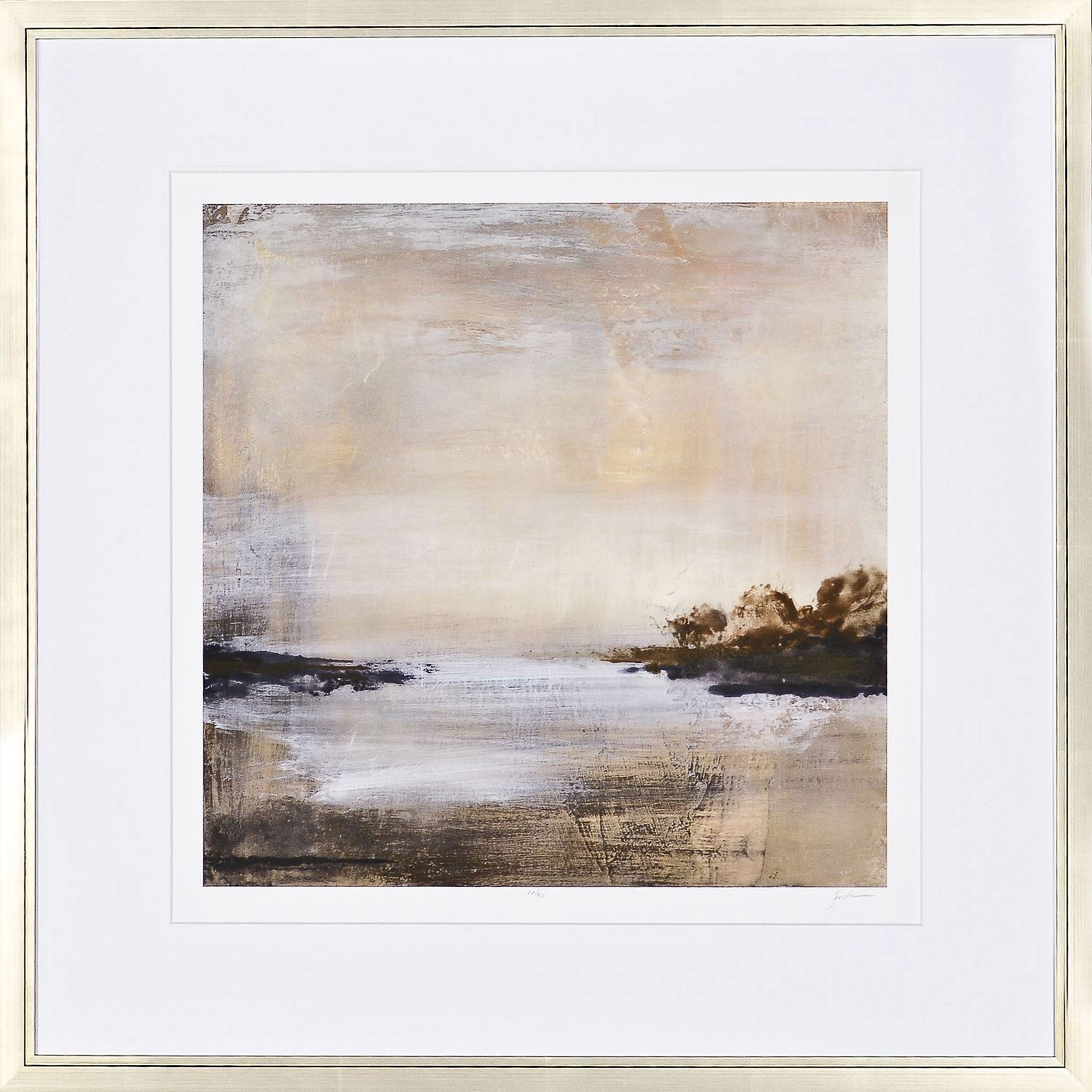 An atmospheric loose abstract evokes the mysterious landscape genre. Butter yellows, browns and taupes are layered over by misty tones.