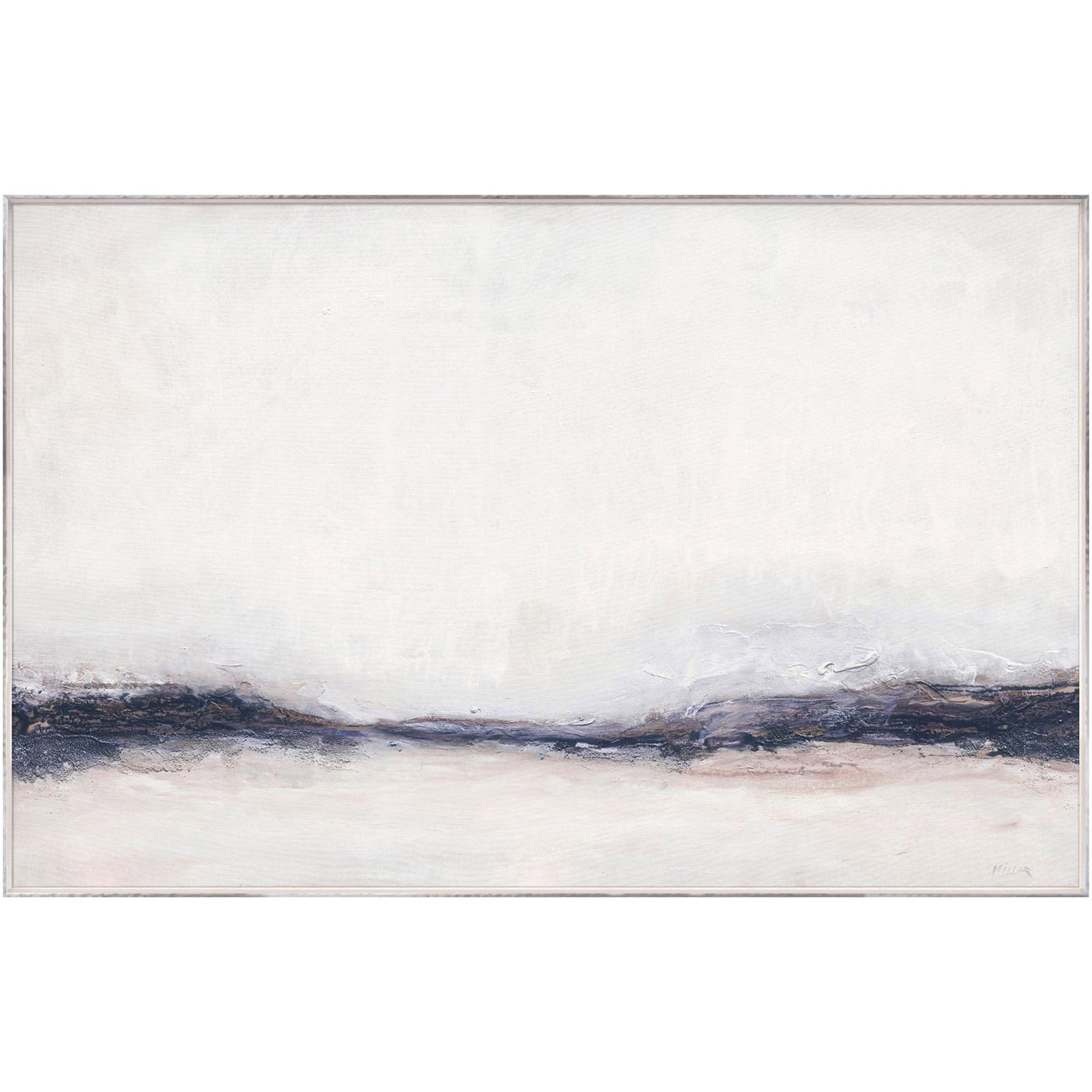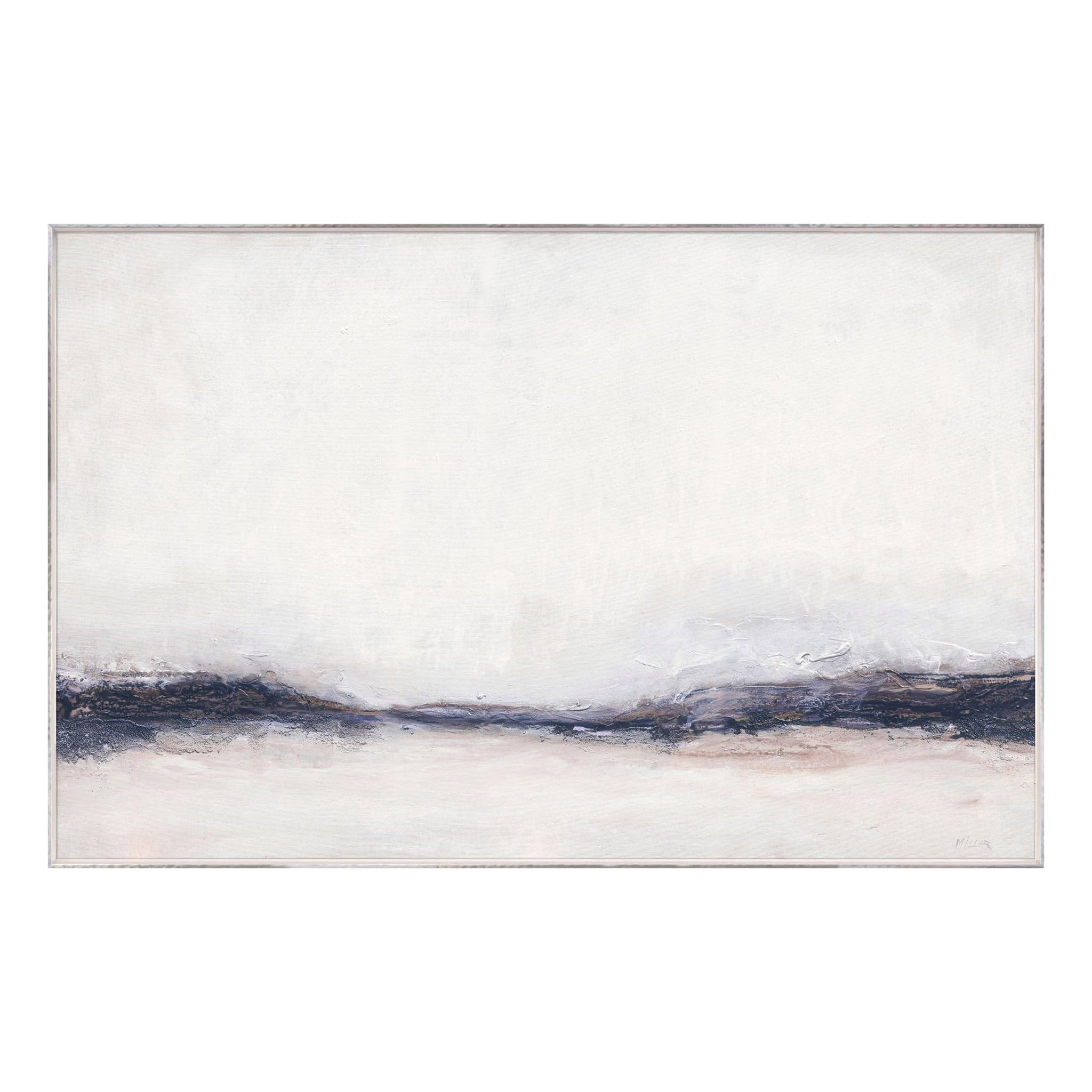 The misty atmosphere of this oversize canvas uses indigo blue with a light swath of blush over a ground of soft dove gray. Framed in a beautiful ivory washed deep profile frame with a soft silver, metal wrapped and angled edge.