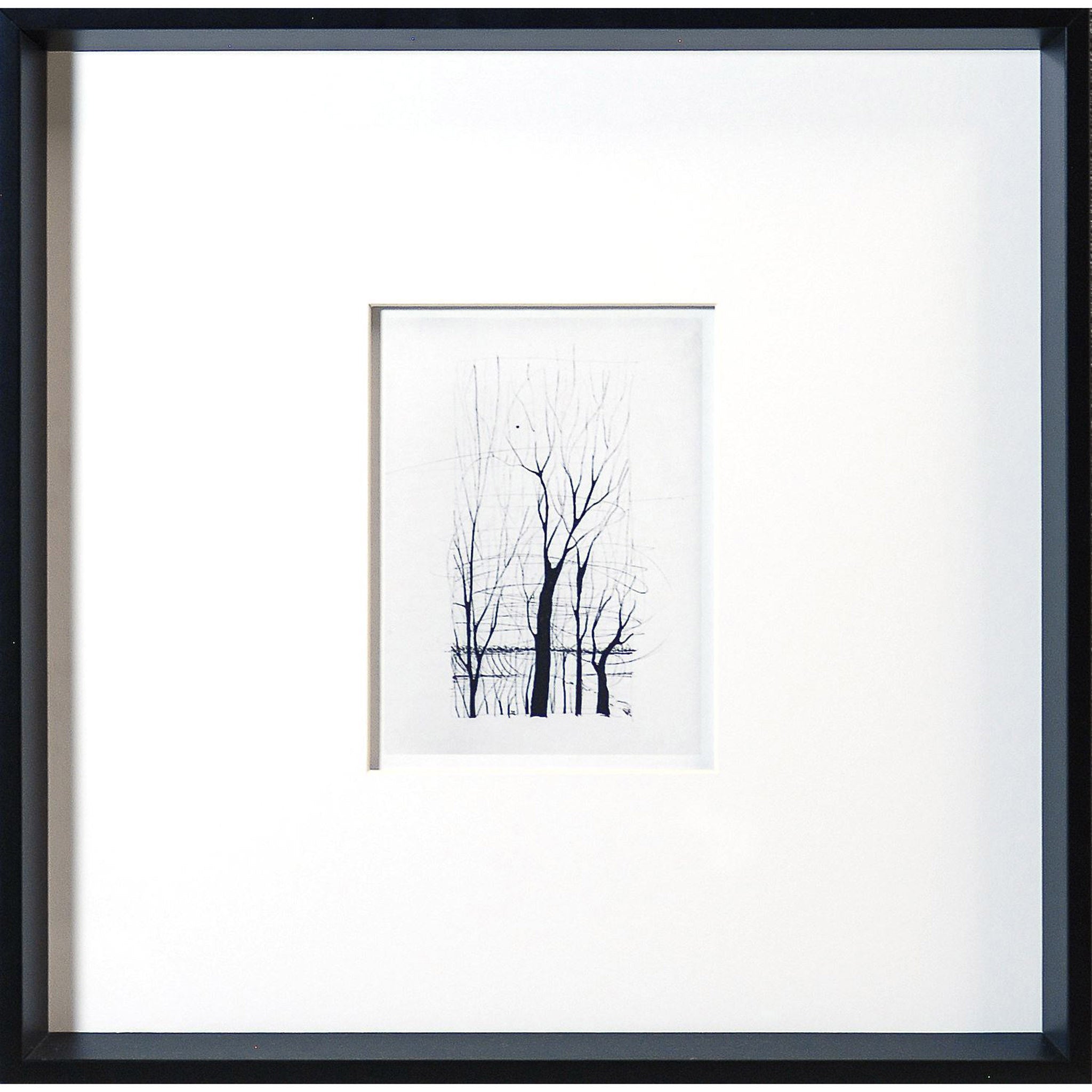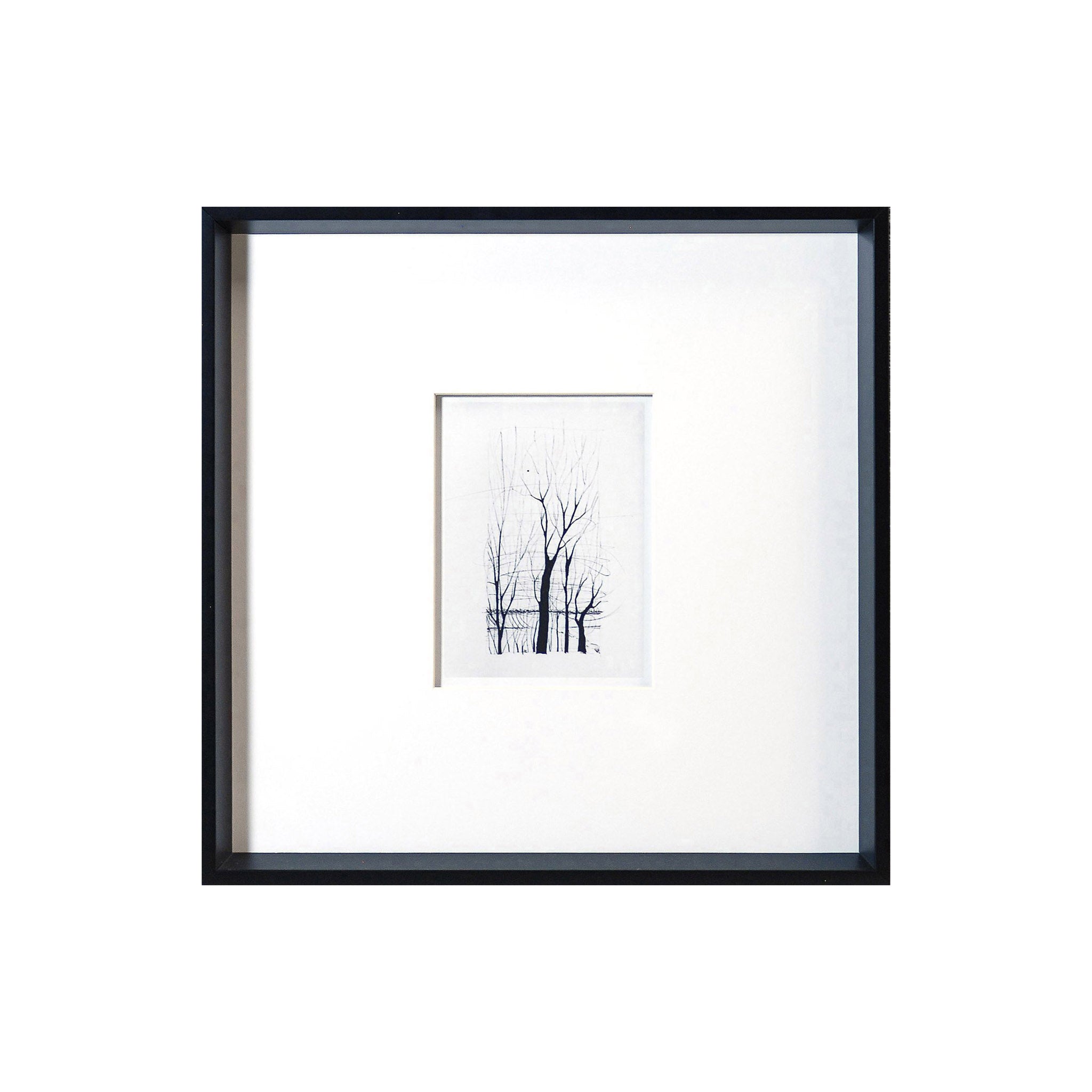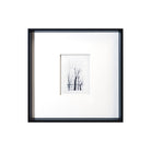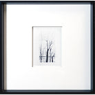 Black and white etched trees framed in a black wooden angled frame. Perfect for your built-ins, library and even leavining in the kitchen.