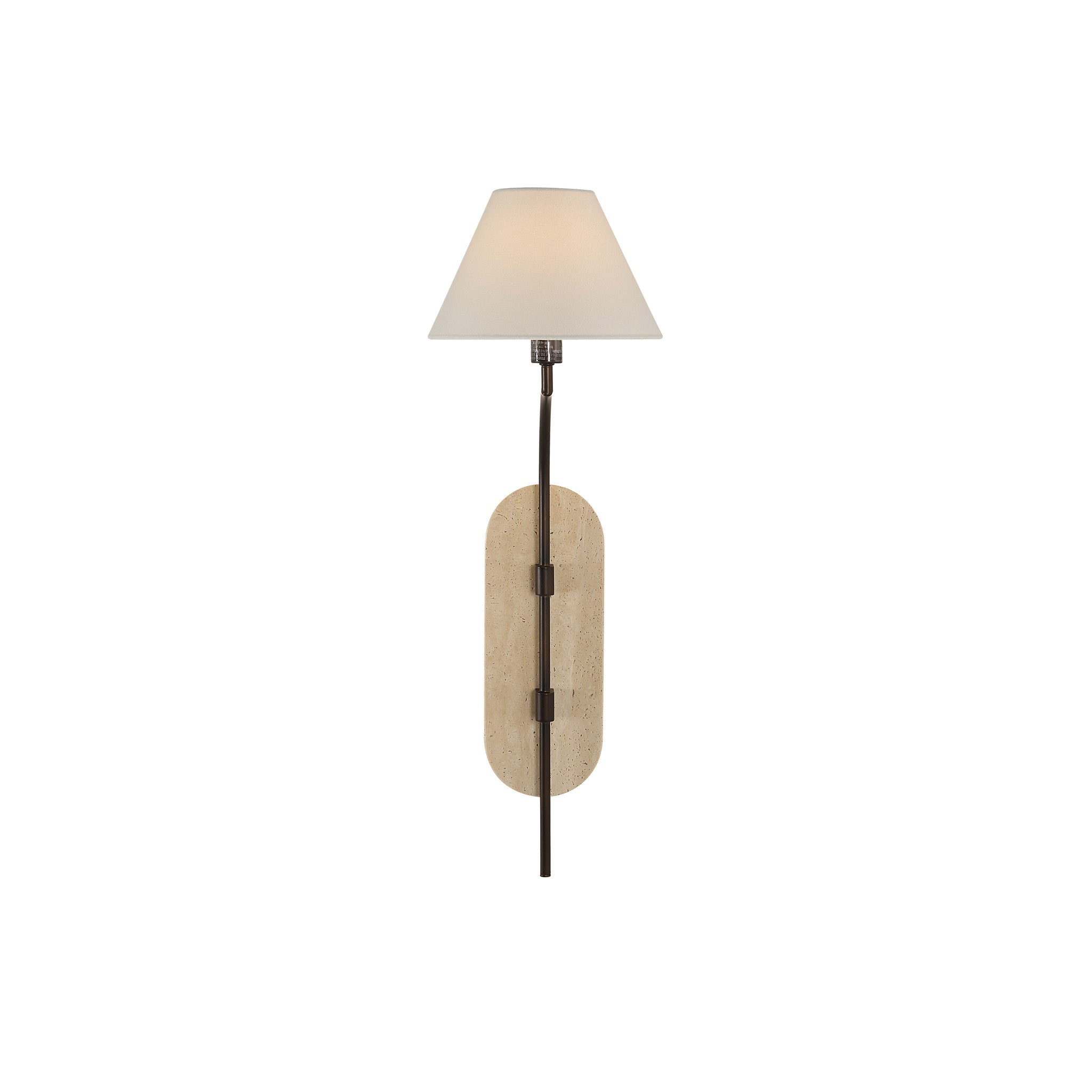 When it comes to layering lighting, it’s important to cover all your bases and that includes walls. Designed with a modern yet historic feel, this wall sconce is composed of artfully chosen materials including travertine and dark antique bronze-finished iron. Its ivory linen tapered drum shade delivers a classic touch and the perfect level of illumination.
