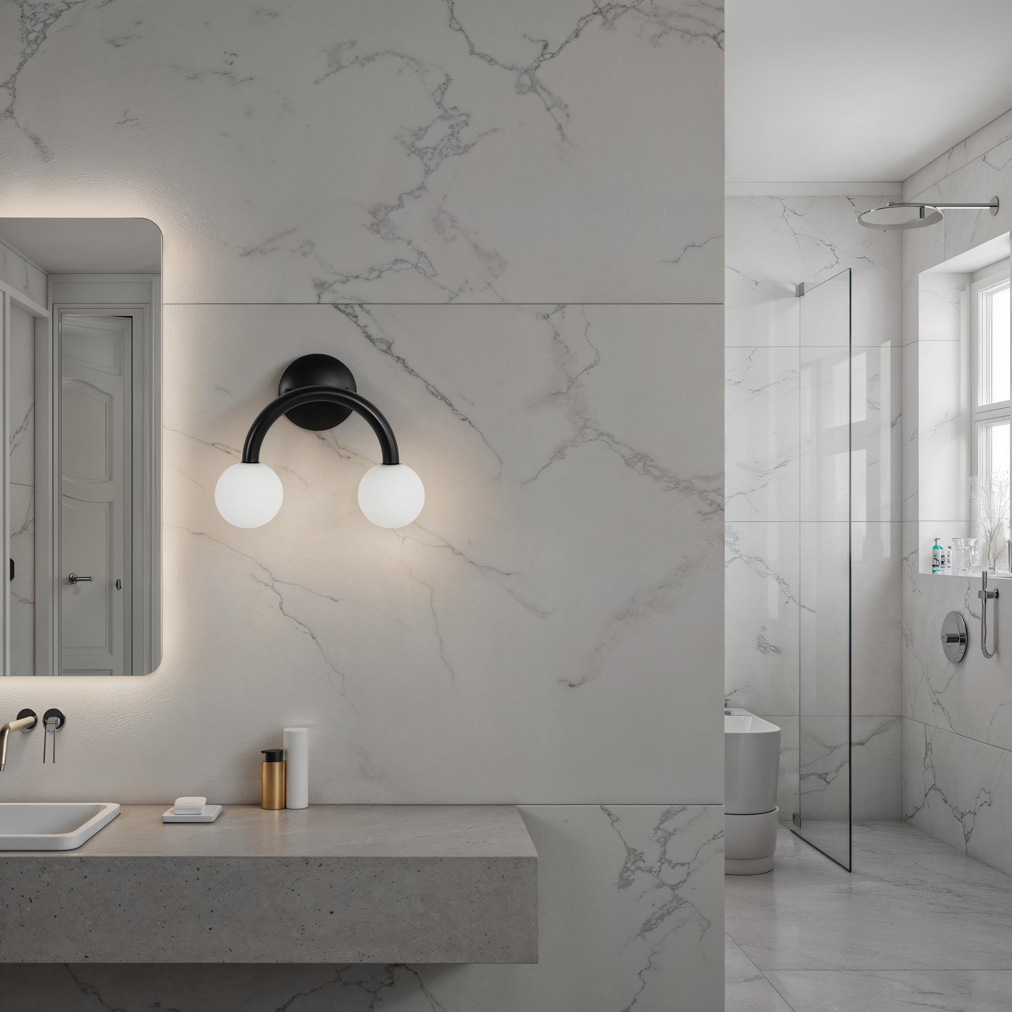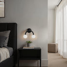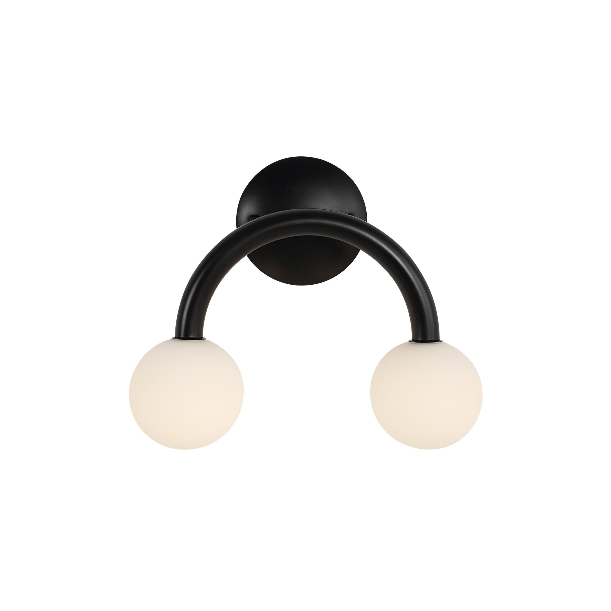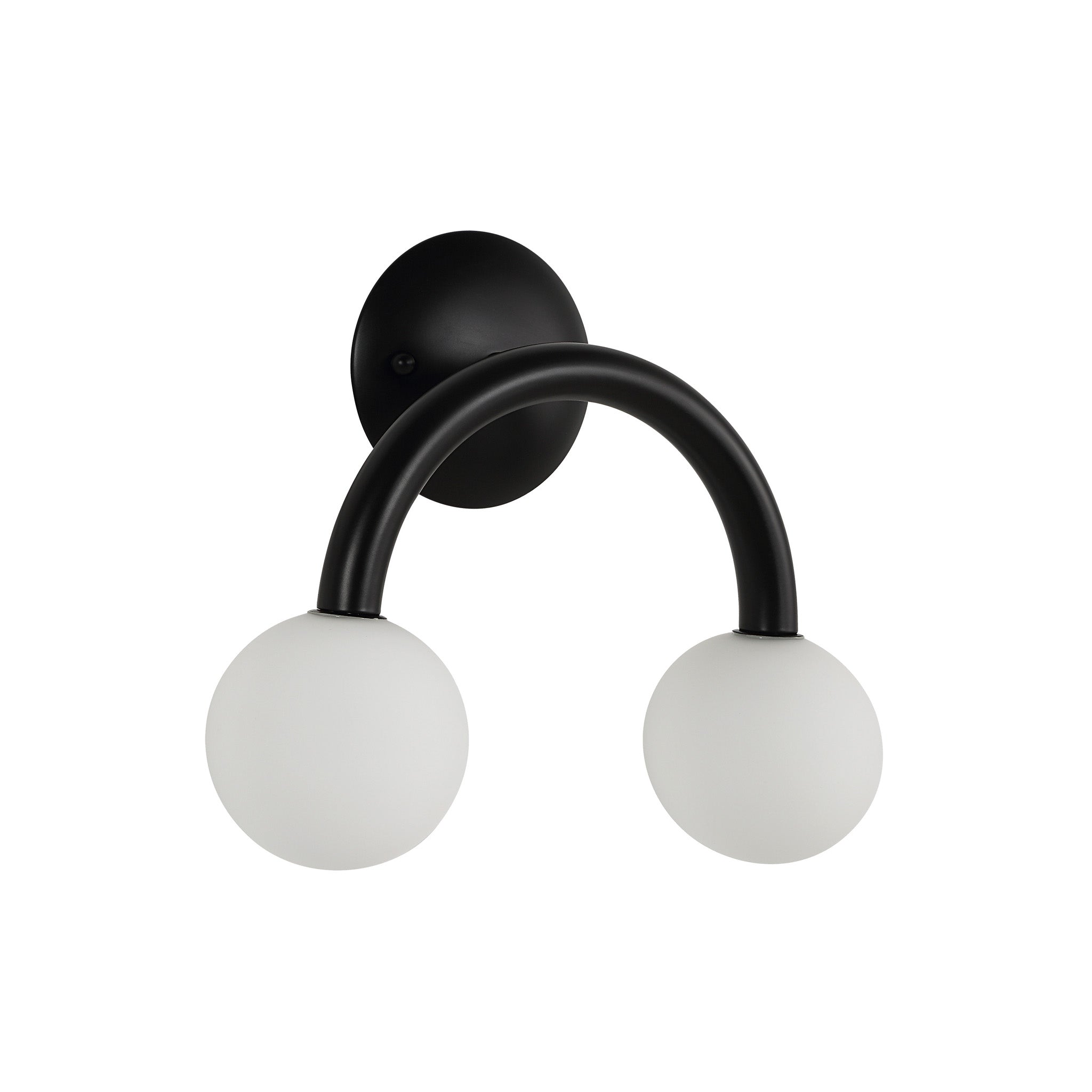 A stylish choice for contemporary interiors, this double-light wall sconce will bring a whimsical touch to your project. Its two white etched globes are suspended from a matte black-finished iron fixture, delivering an airy aesthetic and modern vibe anywhere you feature it. Perfect for pairing up or showcasing solo.