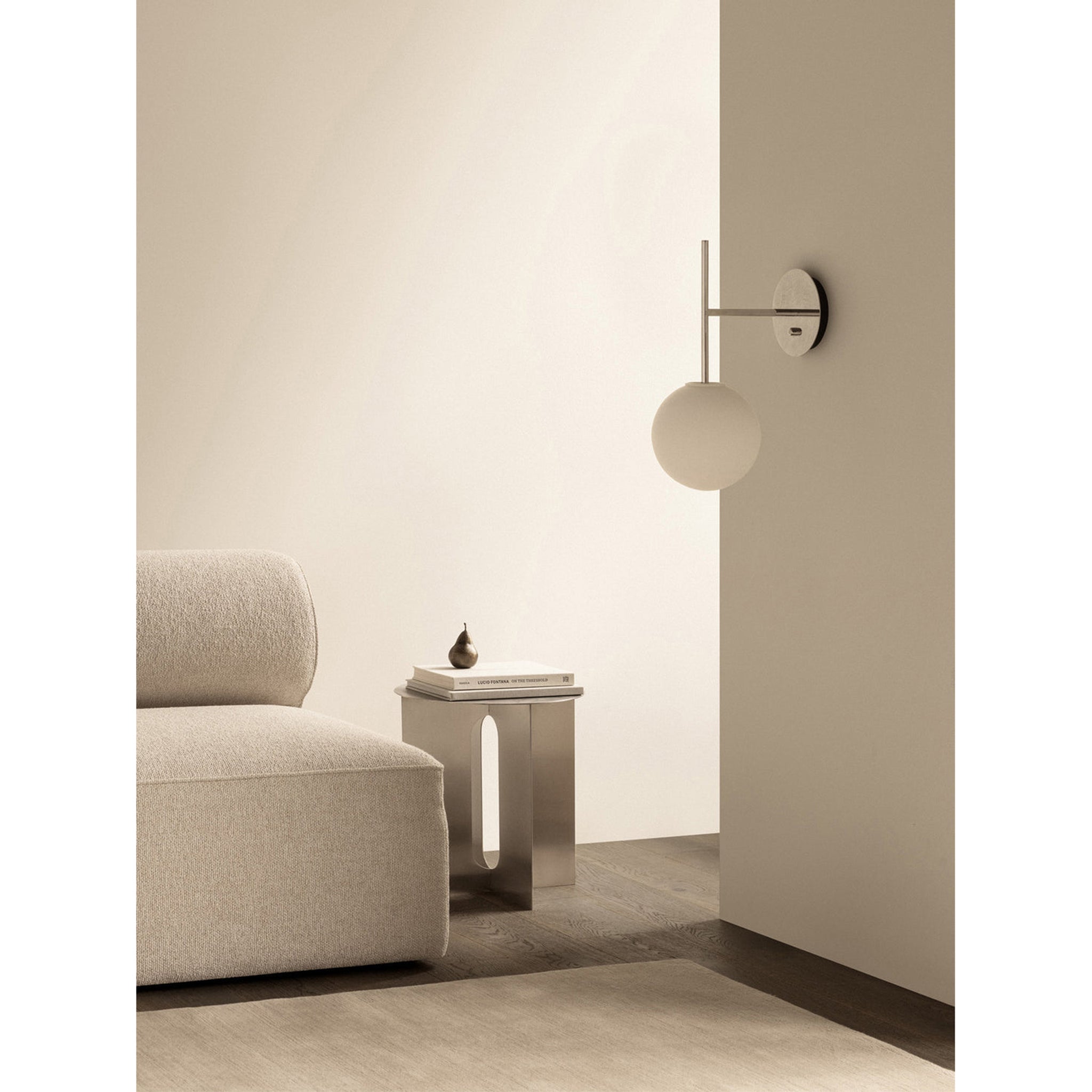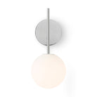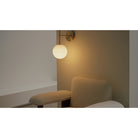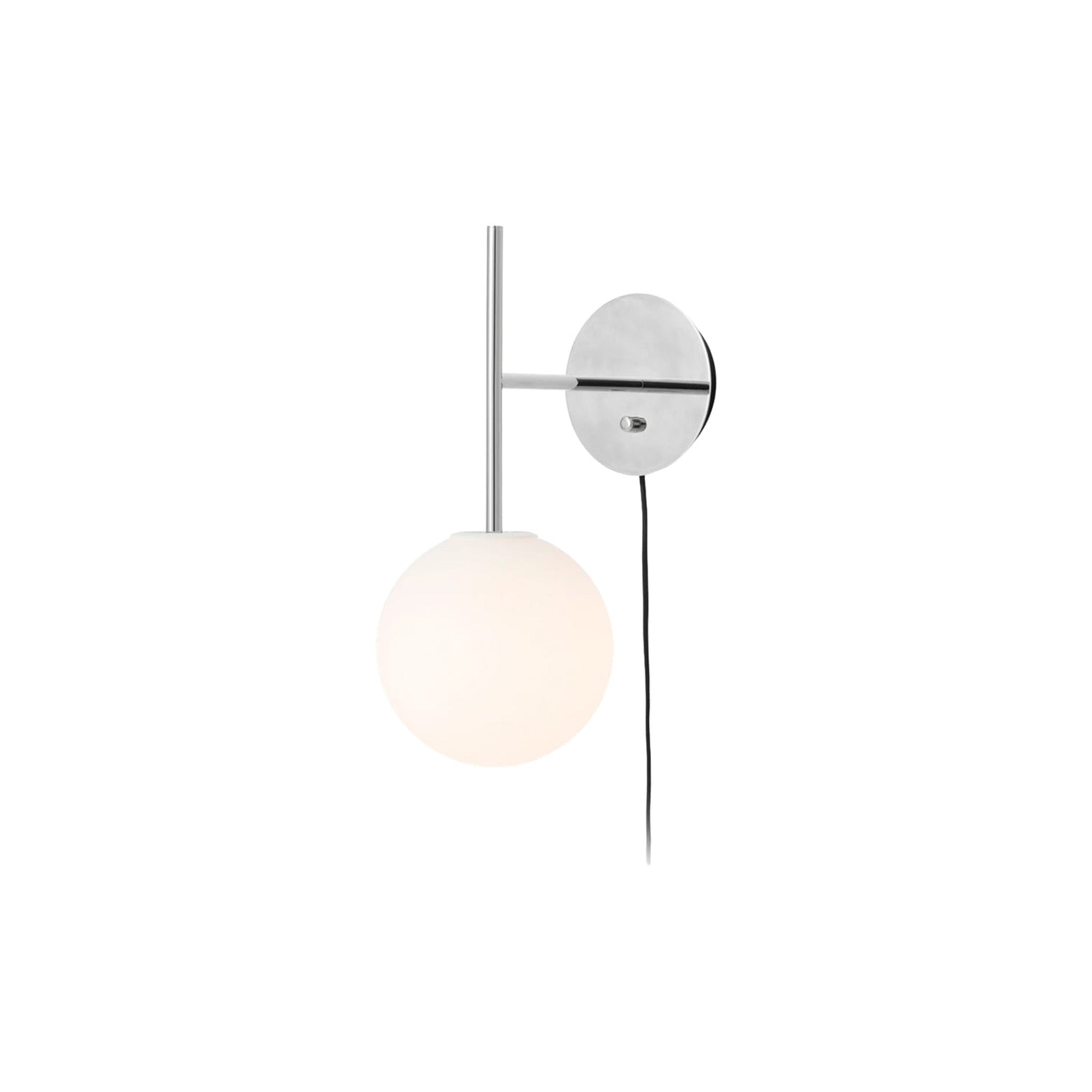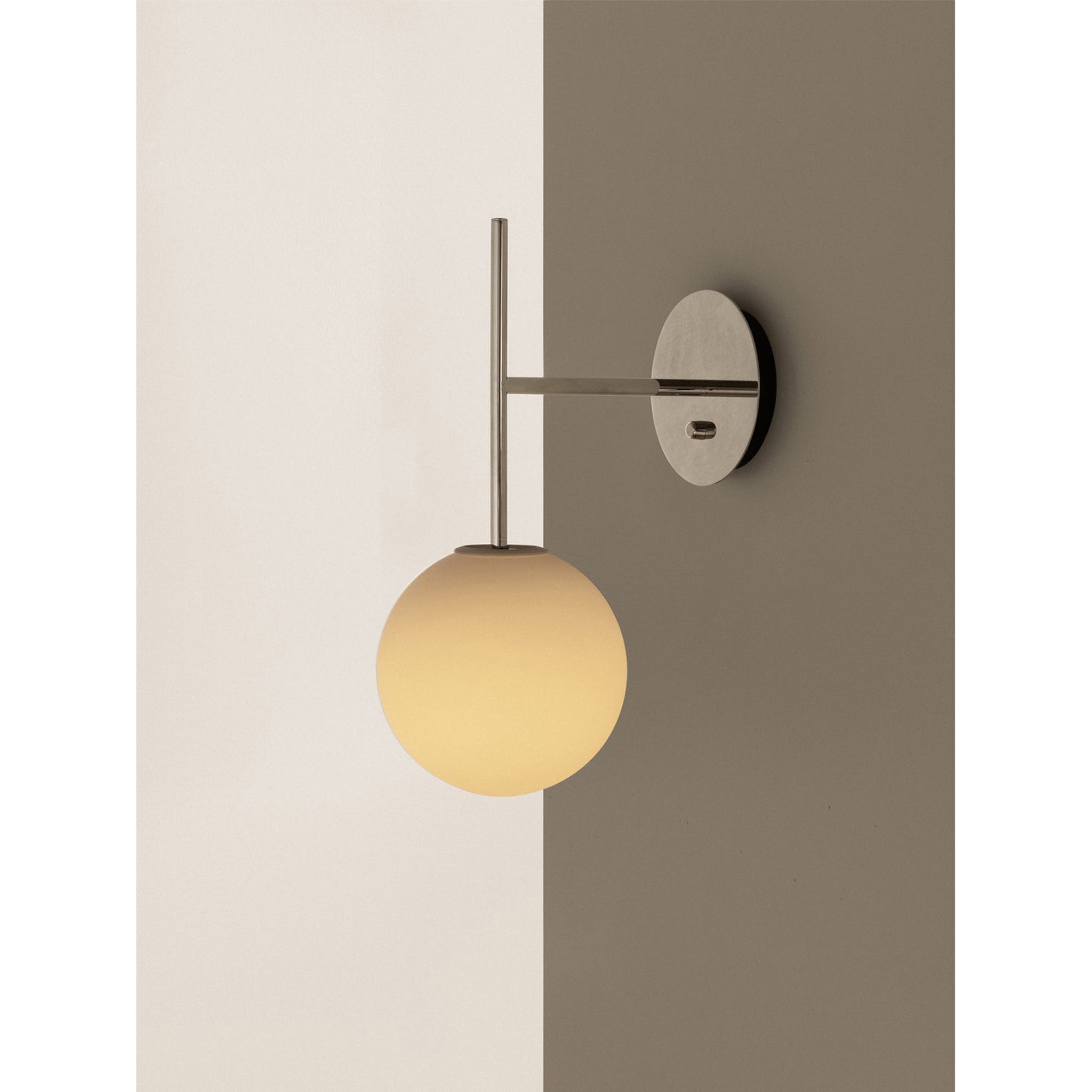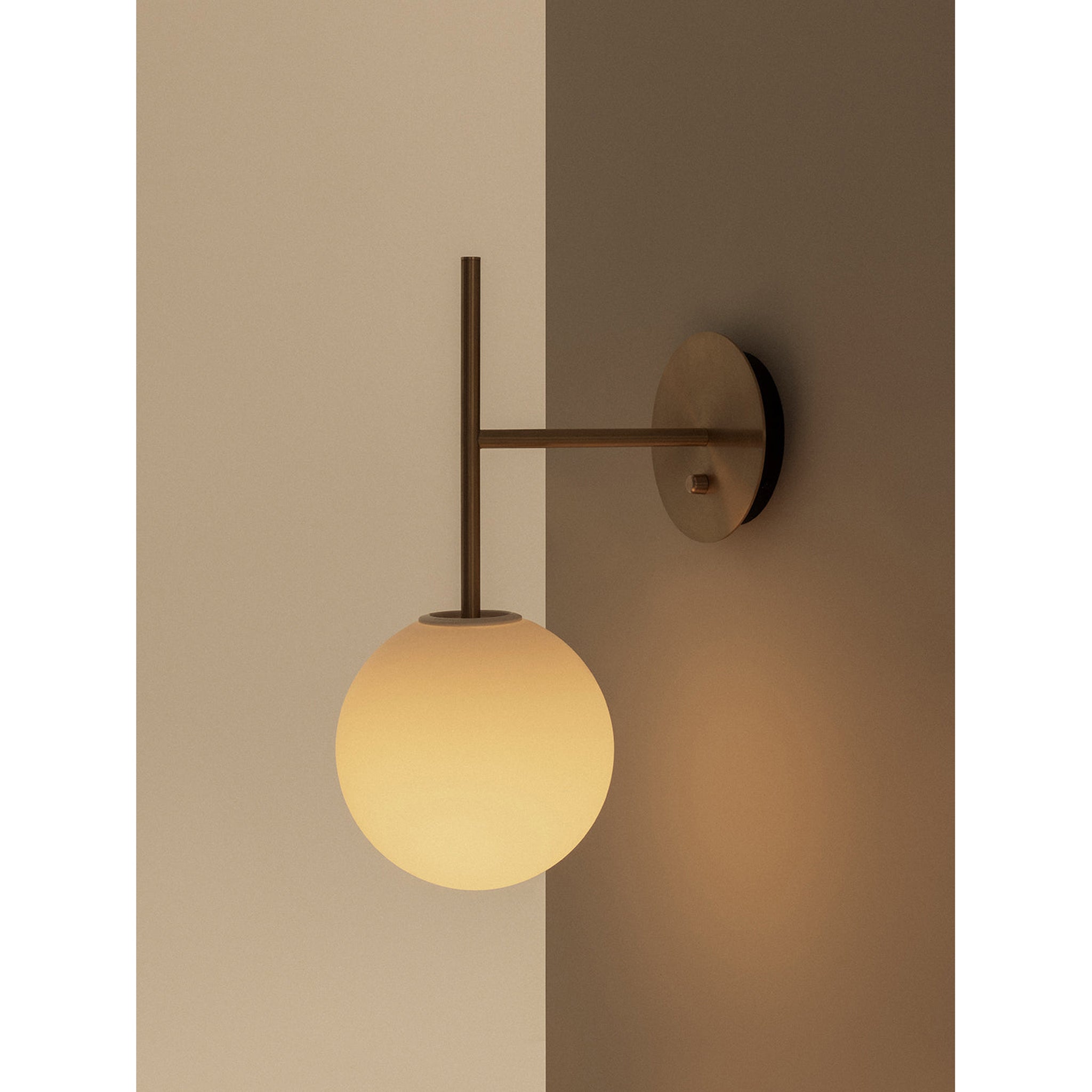 Tim Rundle's TR series for Audo is based on the modern nomadic lifestyle, moving between cities and countries in the pursuit of life experiences. Simple in form yet sophisticated in expression, the TR Bulb Suspended Wall Lamp sees the itinerant TR Bulb in opal glass suspended from a protruding arm in a meeting of straight lines and round shapes. Emitting an even, glare-free glow, the dimmable LED bulb is controlled via a dial on the wall-mounted backplate. While fitted with a cord, the lamp can also be hardwired. Available in brushed brass or mirror polished steel with a matte or shiny white opal glass bulb.