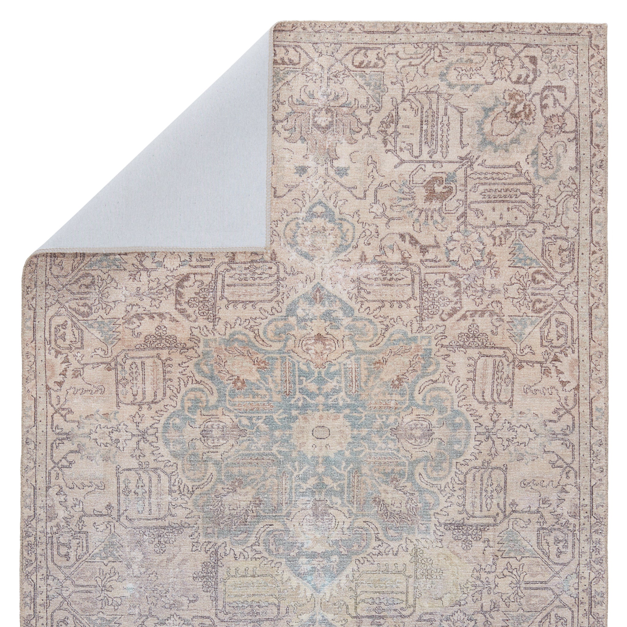 The Kindred collection melds the timelessness of vintage designs with modern, livable style. In subdued tones of tan, beige, gray, and blue-green, the statement-making Parisa rug ground spaces with luxe appeal and a classic center medallion motif. This low-pile rug is made of soft polyester and features a stunning, Old World-inspired digitally printed design.