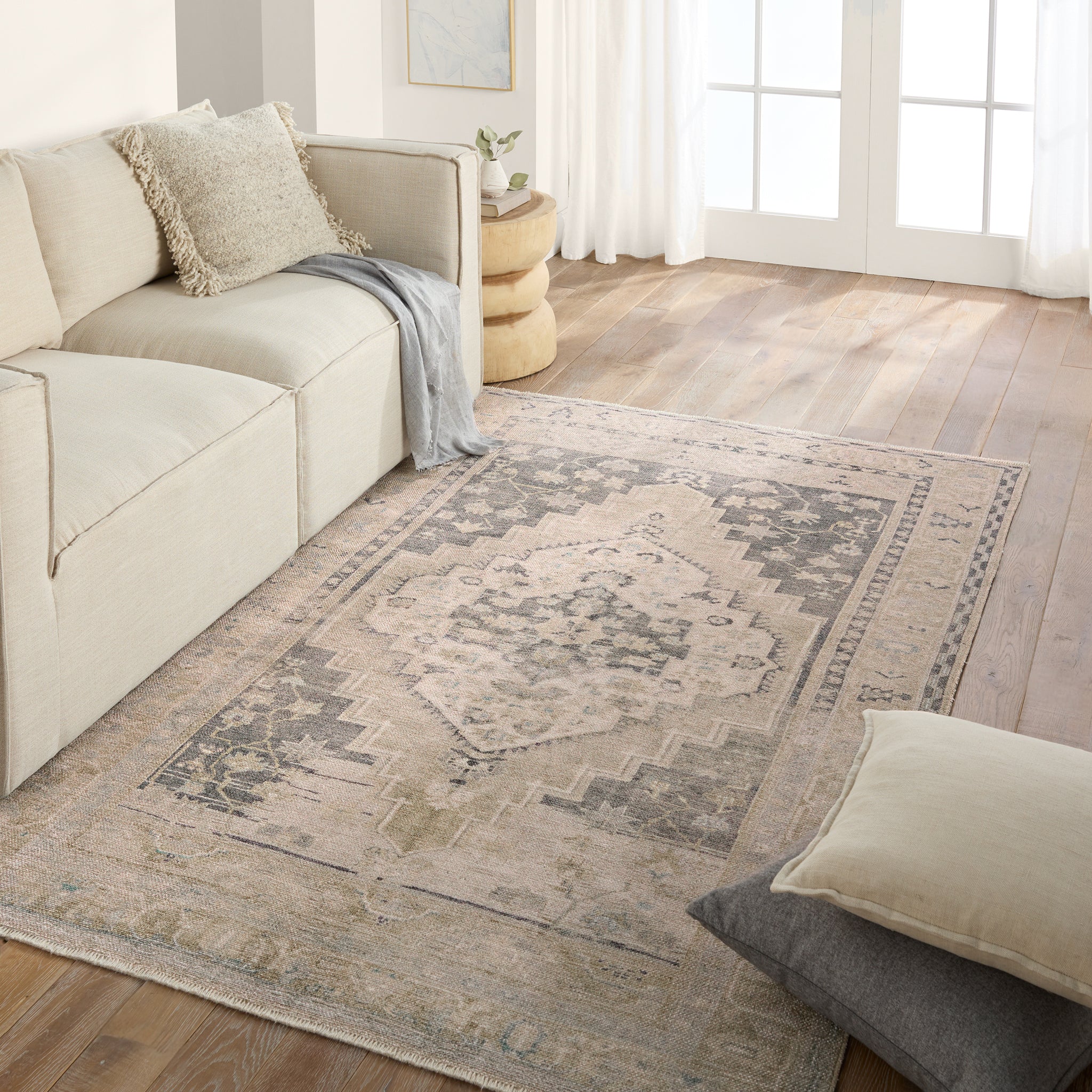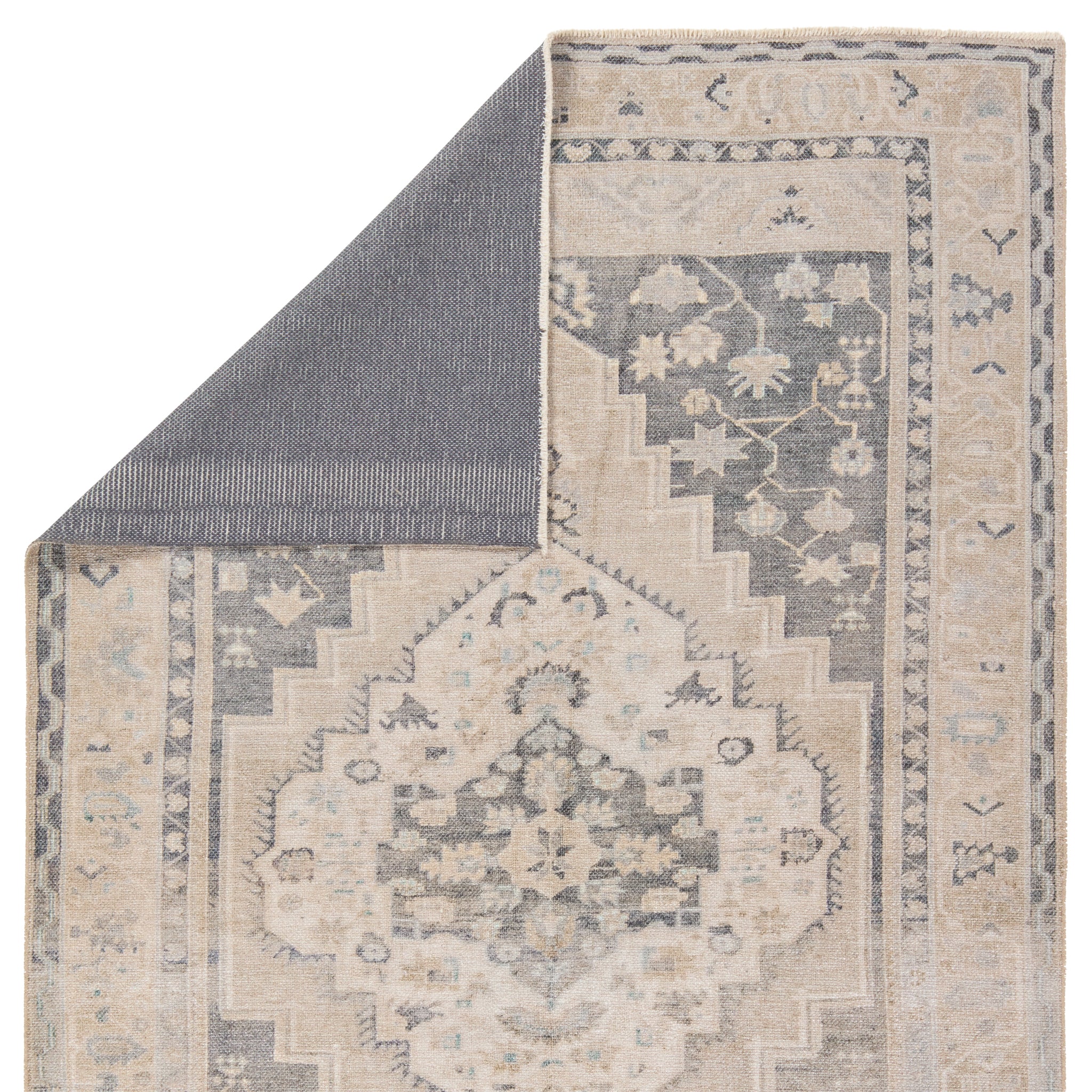 Distressed, vintage designs offer an elevated tone for the Lumal Collection. The Pasin rug features an updated traditional inspired medallion and multiple floral borders in tones of navy, light green, cream, gray, and tan. This machine washable rug is stain resistant and easy to clean, perfect for homes with children and pets. The 100% polyester fibers allow for maximum cleanability while maintaining a soft hand.