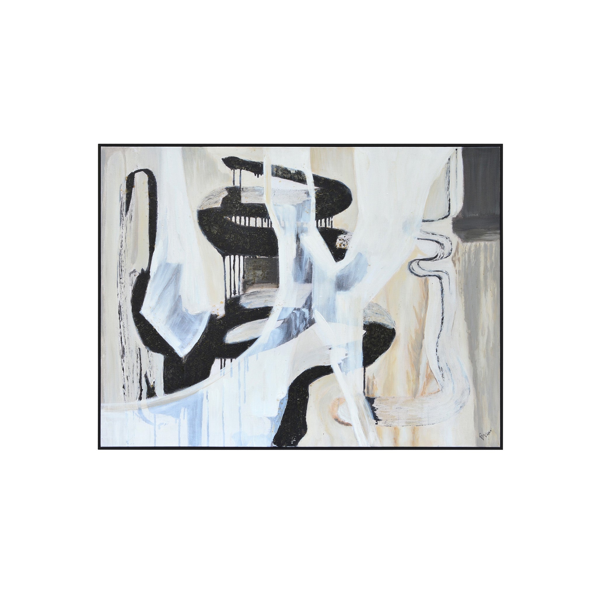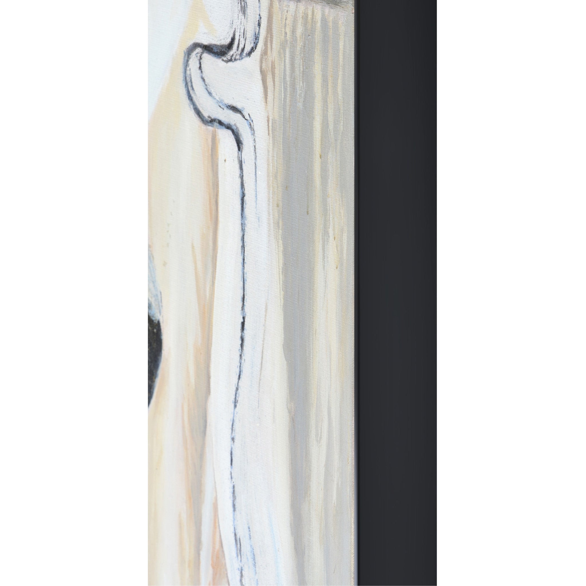 L'intérieur minimaliste est sublimé par une touche de personnalité grâce à la toile Stephanie accrochée au mur. Le mélange de peinture texturée, réalisée à la main, et d'imprimés, associé aux gribouillis et aux rayures, confère à ce design un esprit street art. Un fin cadre noir souligne la complexité de l'œuvre.