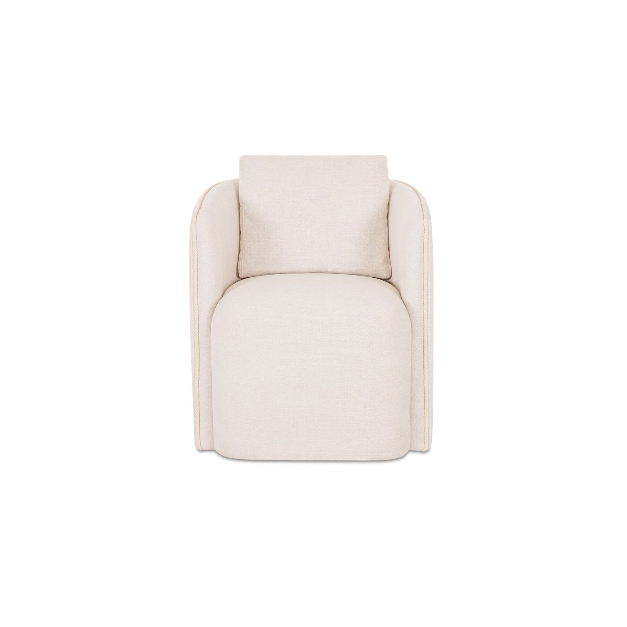 Meet Camille: the dining chair that likes to move with the conversation. Traditional tailoring gets a modern twist with tonal cotton cord trim and a cushioned seat made for lingering. Wrapped in micro-textured polyester in Warm White, it keeps the look clean while the foam-and-fiber fill stays comfortable through long dinners. A 360-degree swivel base lets you turn in and out with ease. Pull up, spin slightly, stay awhile; let the trim do the work.