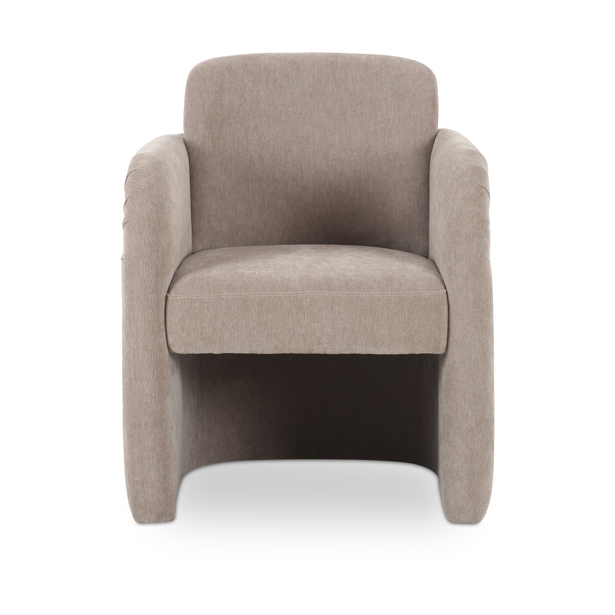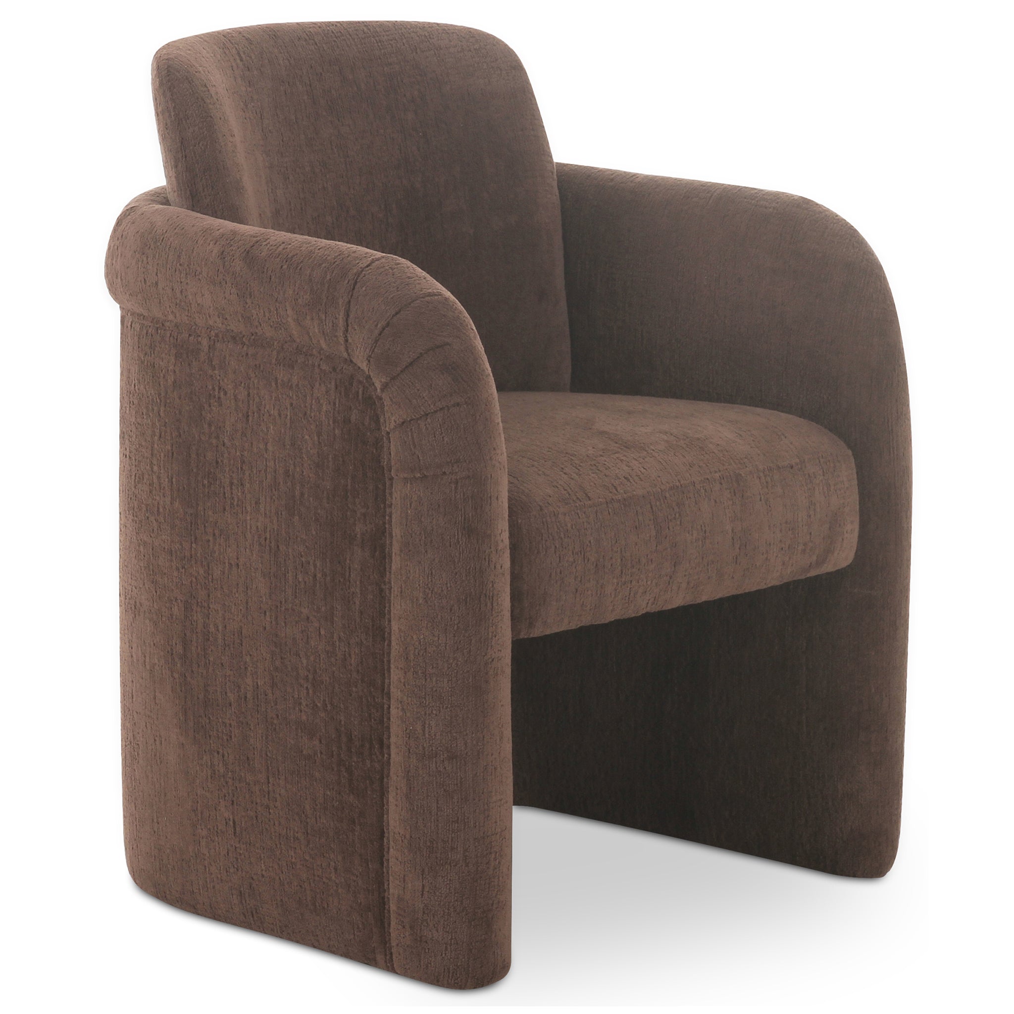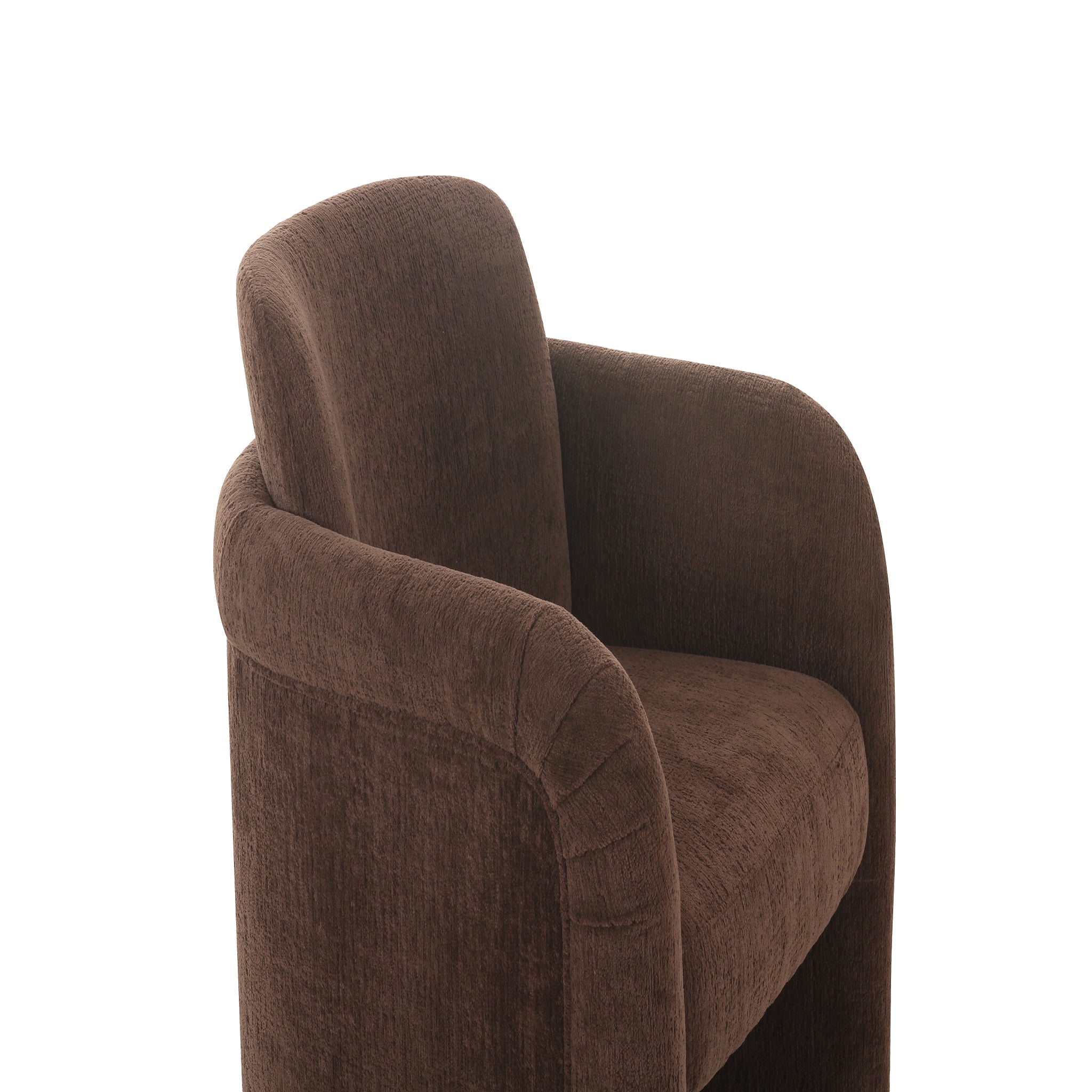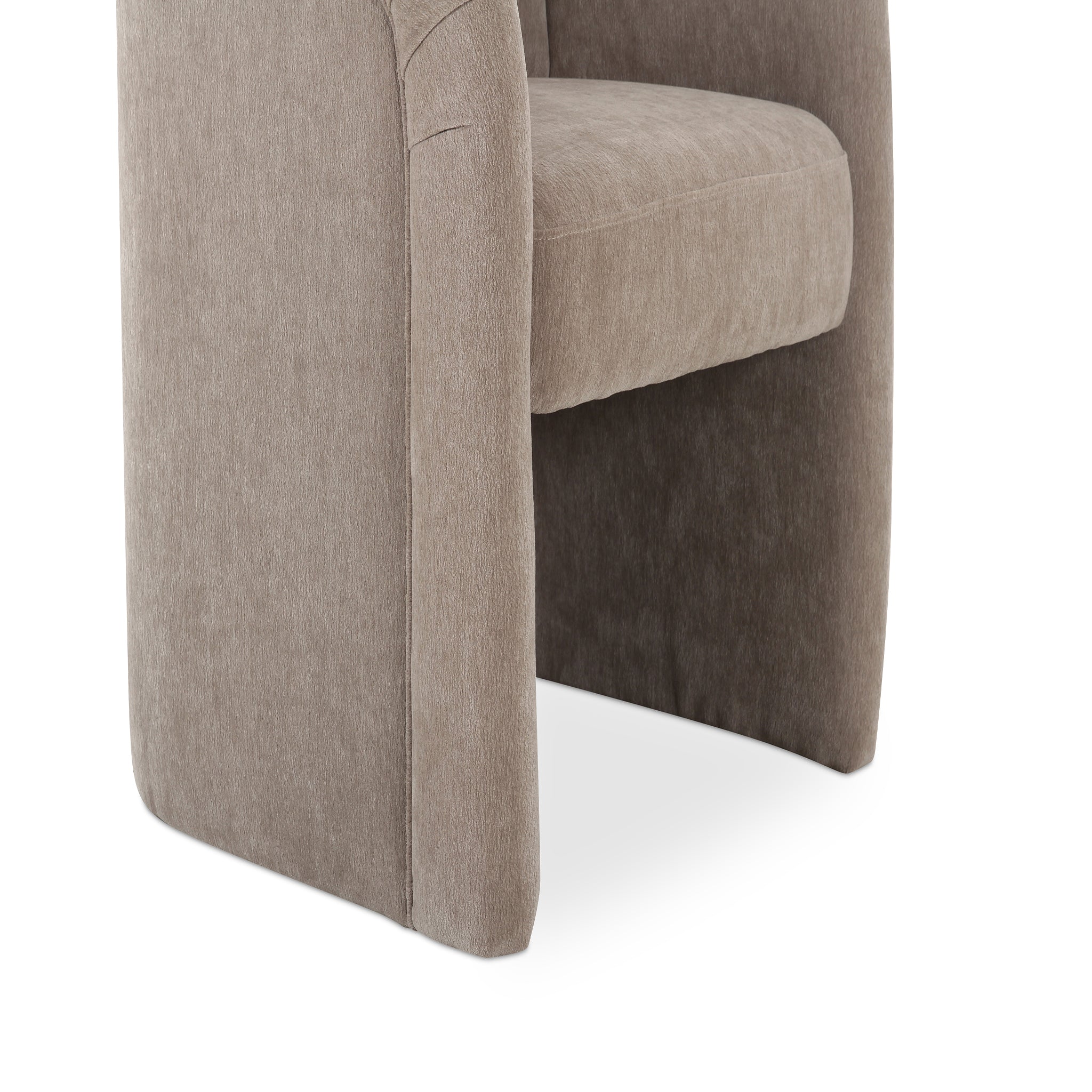 La chaise de salle à manger George incarne l'essence même du confort. Son assise généreusement rembourrée semble flotter entre un élégant cadre galbé et rembourré, et un piètement roulant, remplaçable par les pieds en plastique inclus, pour une assise fixe. Les accoudoirs, avec leurs détails plissés, rendent hommage aux modèles anglais traditionnels, alliant savoir-faire classique et esthétique moderne. Le revêtement doux et texturé apporte une touche de douceur et d'hospitalité à tout espace.