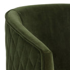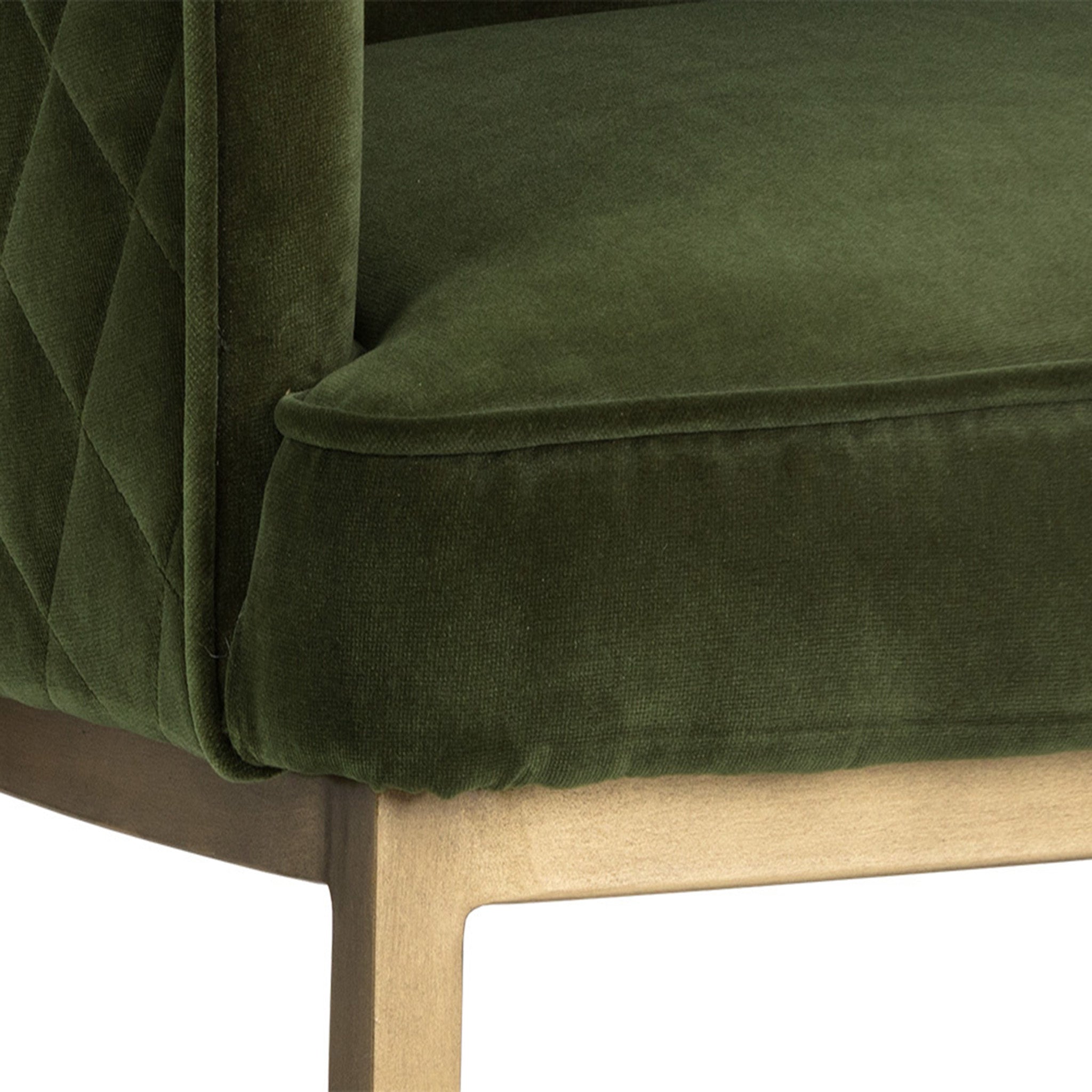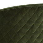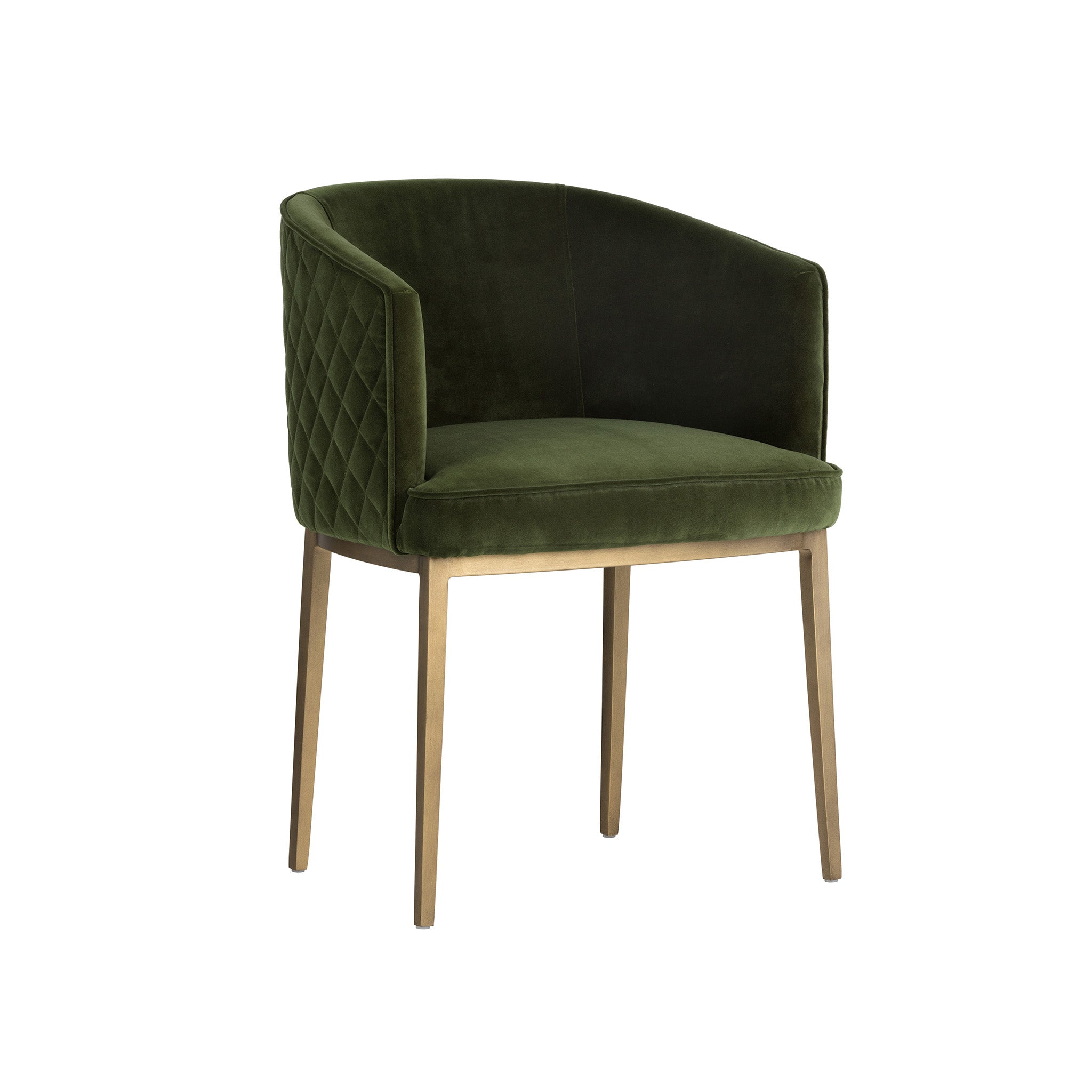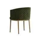 Cette chaise de salle à manger moderne incarne l'élégance féminine. Disponible en tissu vert forêt avec de délicates surpiqûres en losange sur le dossier. Une structure en acier laitonné vieilli complète son style.