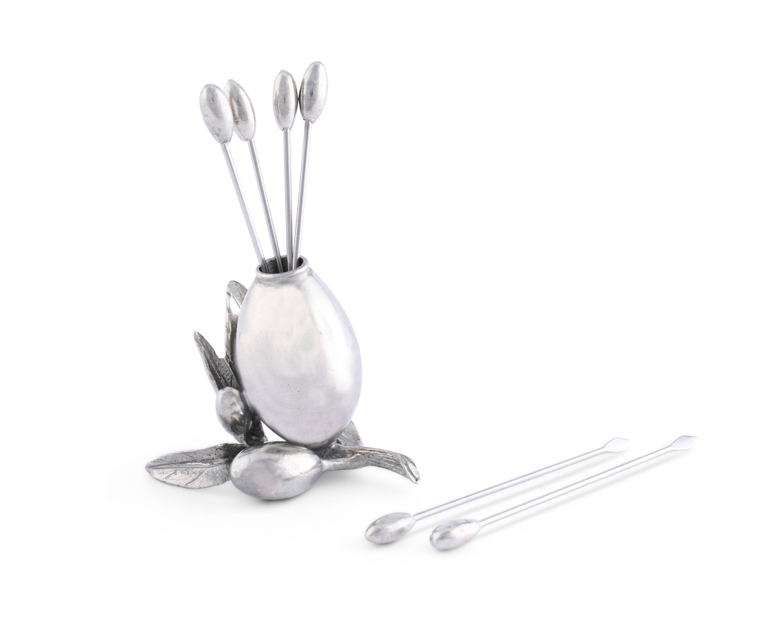 Sublimez la présentation de vos fromages avec le set de pics à fromage Olive, un accessoire raffiné inspiré du charme méditerranéen. Fabriqué en étain luxueux, le support moulé à la main évoque une délicate branche d'olivier chargée de fruits, tandis que chacun des six pics est orné d'une olive en étain finement ciselée. Cet élégant set allie art et praticité, sublimant chaque dégustation d'une touche de raffinement et de joie de vivre. Présenté dans un coffret cadeau.