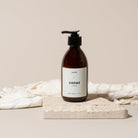 Une bouteille en verre ambré élégante au look chic et minimaliste.