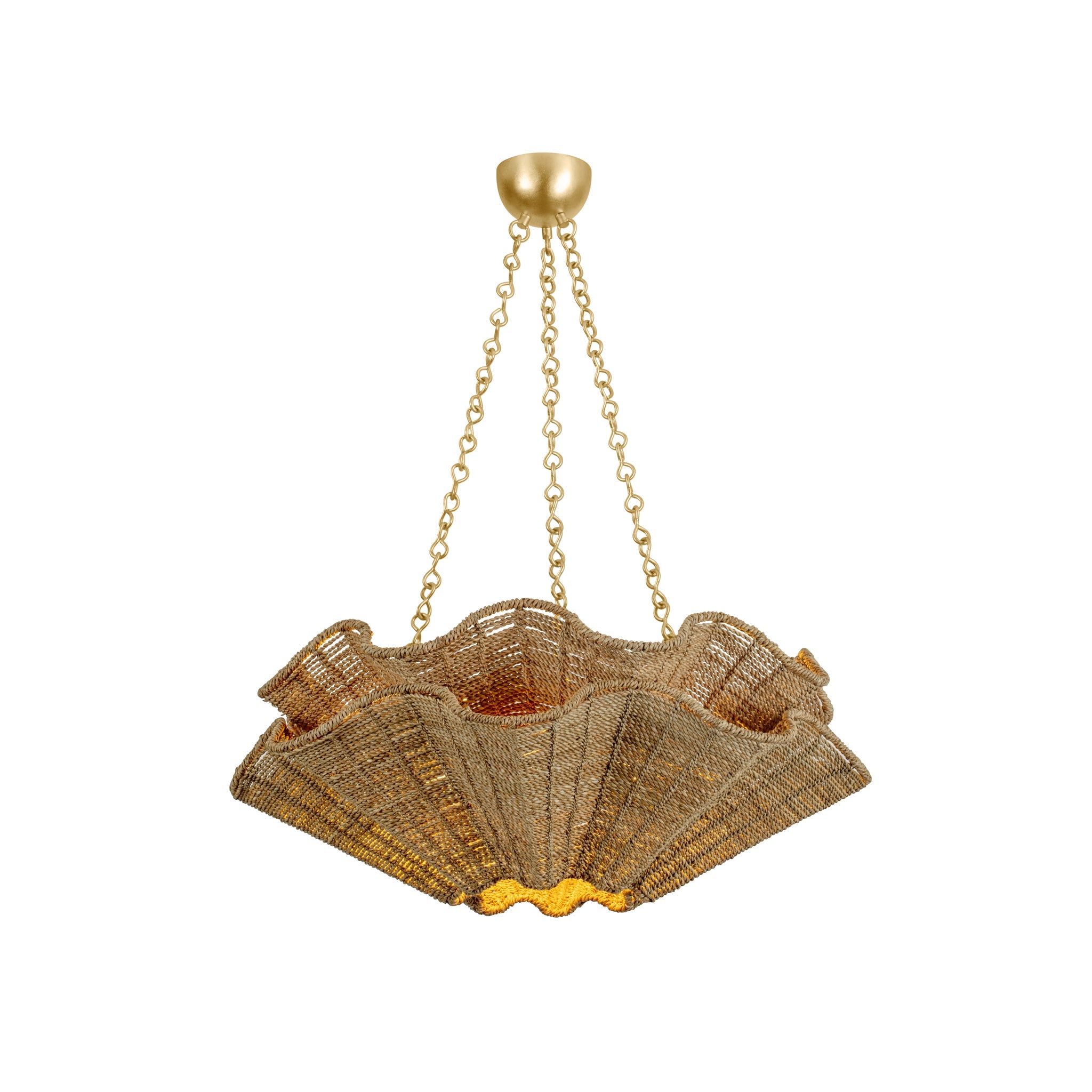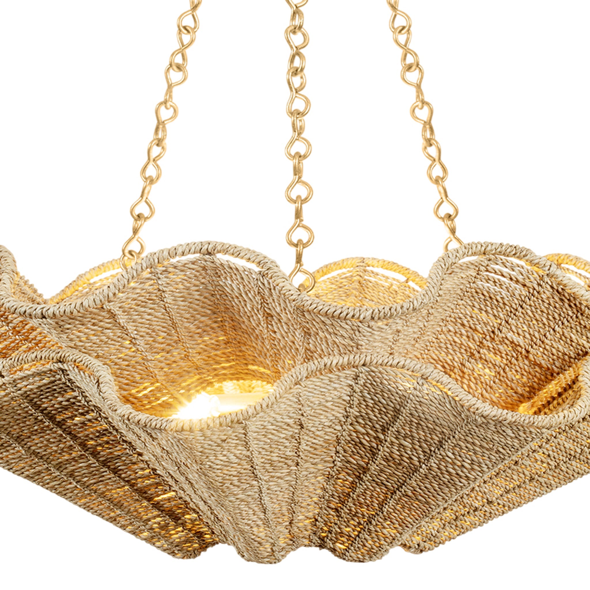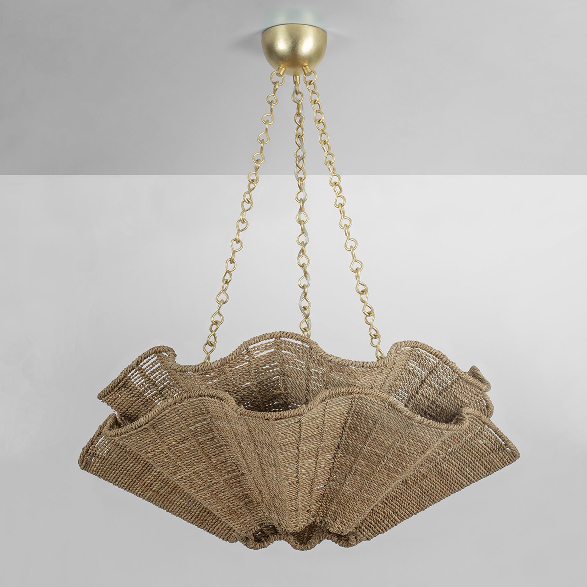 Évoquant la silhouette d'un coquillage, Hayworth revisite le design côtier avec une touche artisanale. Deux grands abat-jour tissés en corde d'abaca aux teintes neutres incarnent la légèreté, tandis que la chaîne en feuille d'or vieilli apporte un contraste élégant. L'ouverture à la base de l'abat-jour crée un faisceau concentré qui illumine de larges espaces.