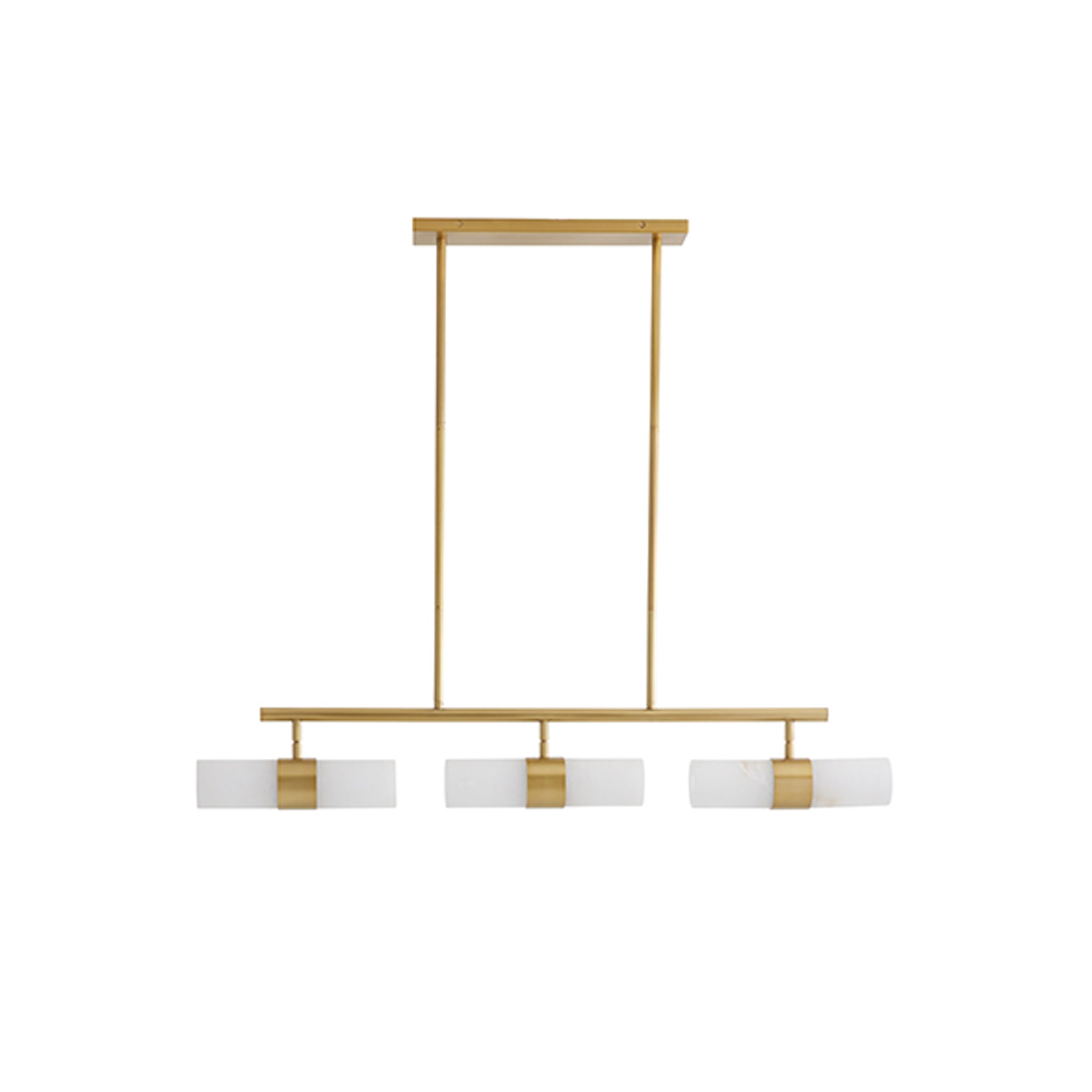 Pierre naturelle et ferronnerie raffinée s'associent pour créer ce lustre élégant et moderne. Des abat-jour en albâtre blanc ornent chacun des deux luminaires, centrés par une ceinture en laiton antique et un cadre assorti. La finition est variable.