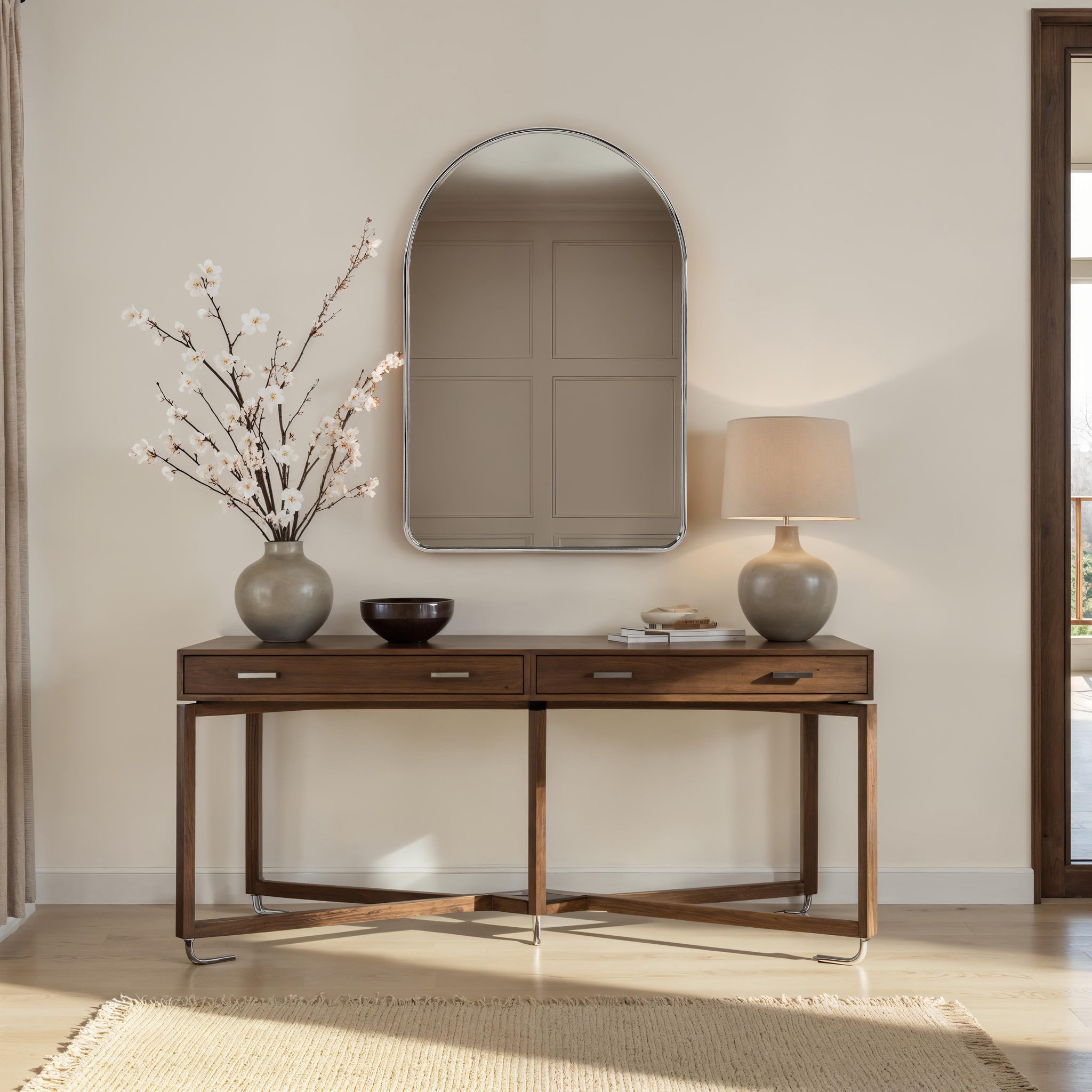 Parfait pour un dernier coup d'œil avant de sortir ou pour apporter lumière et style à une pièce, ce miroir mural arqué s'intègre harmonieusement à tous les styles de décoration. Robuste, avec son cadre en nickel poli et son miroir de haute qualité, il allie style et fonctionnalité pour sublimer n'importe quel espace d'une touche de modernité.