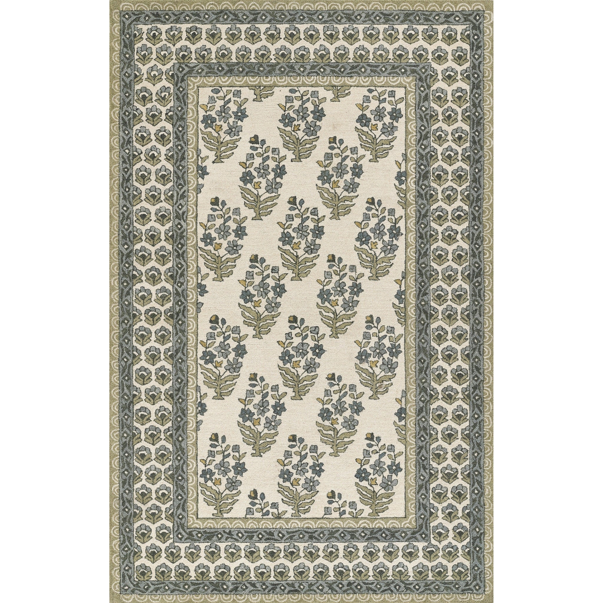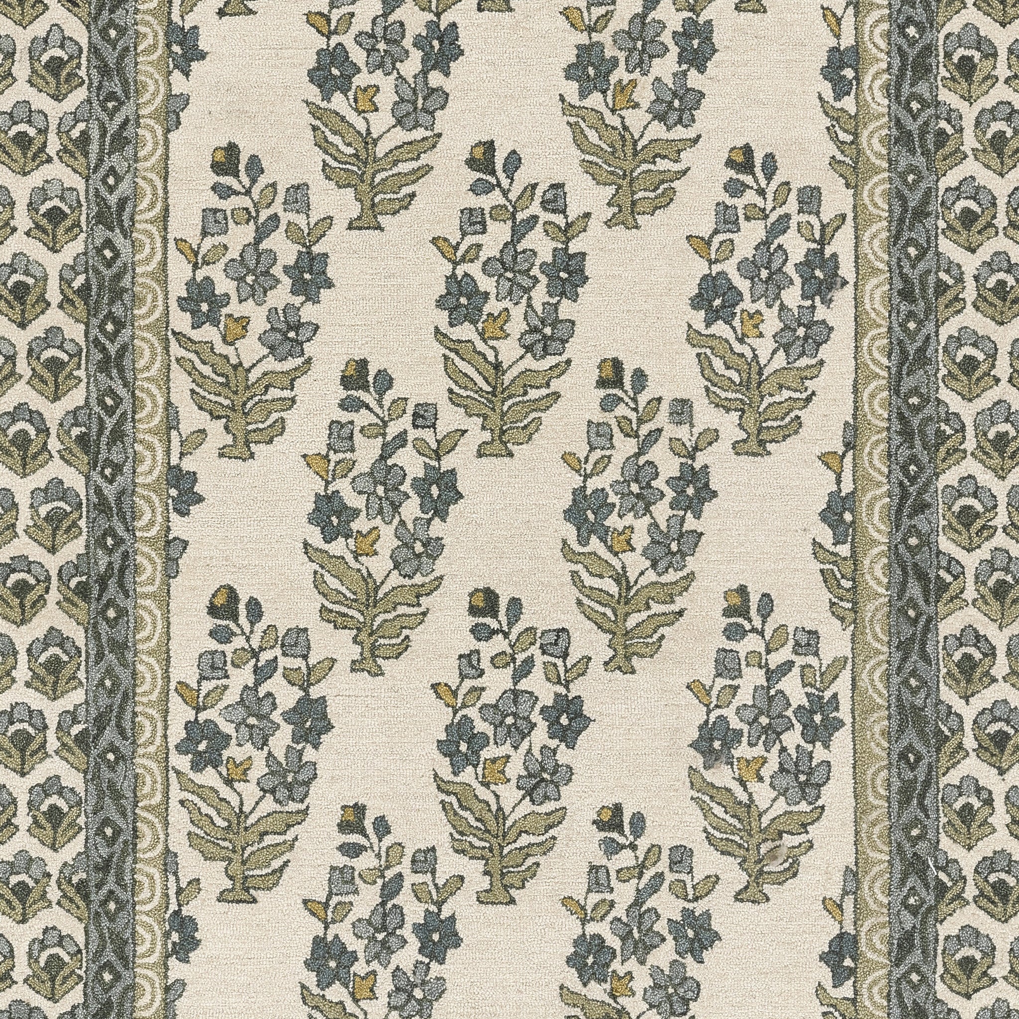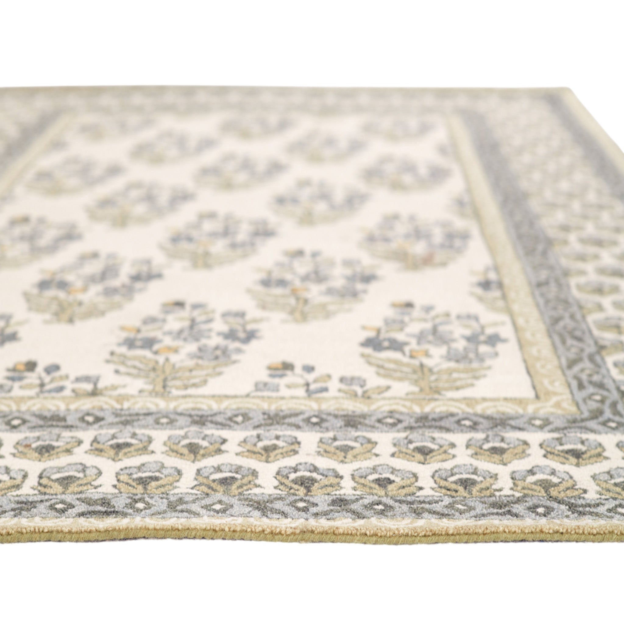 A charming blend of pastoral elegance and timeless craft, this rug is a modern tribute to heritage textiles. Inspired by classic Indian block prints and the delicate sensibilities of English cottage décor, its repeating floral motif brings a garden-like rhythm to any room. A soft ivory ground anchors the clusters of blue, sage, and golden blooms, while the ornate border frames the composition with vintage flair. Hand-tufted of 100% wool, this rug feels both grounded and graceful-perfect for cozy cottages, breezy sunrooms, or layered eclectic spaces that embrace warmth, whimsy, and tradition.