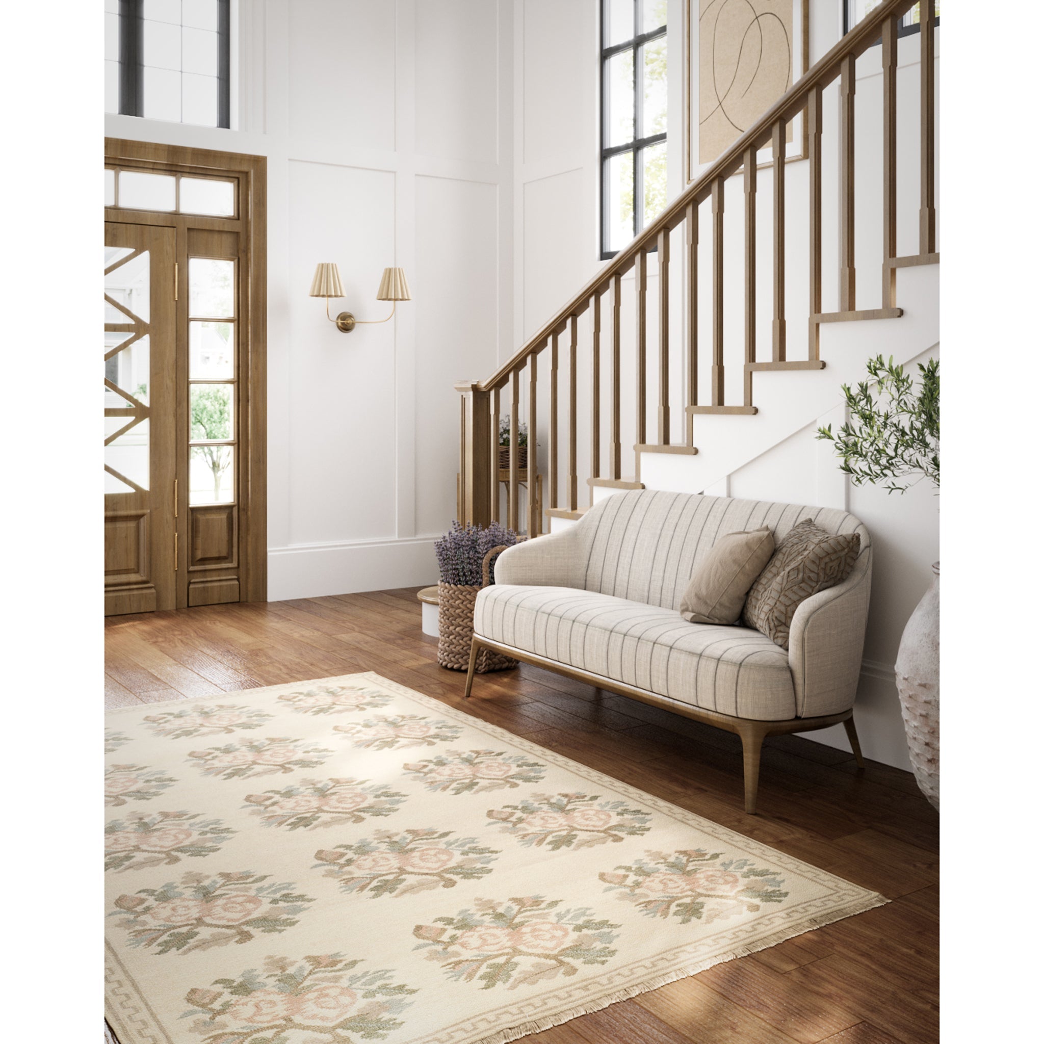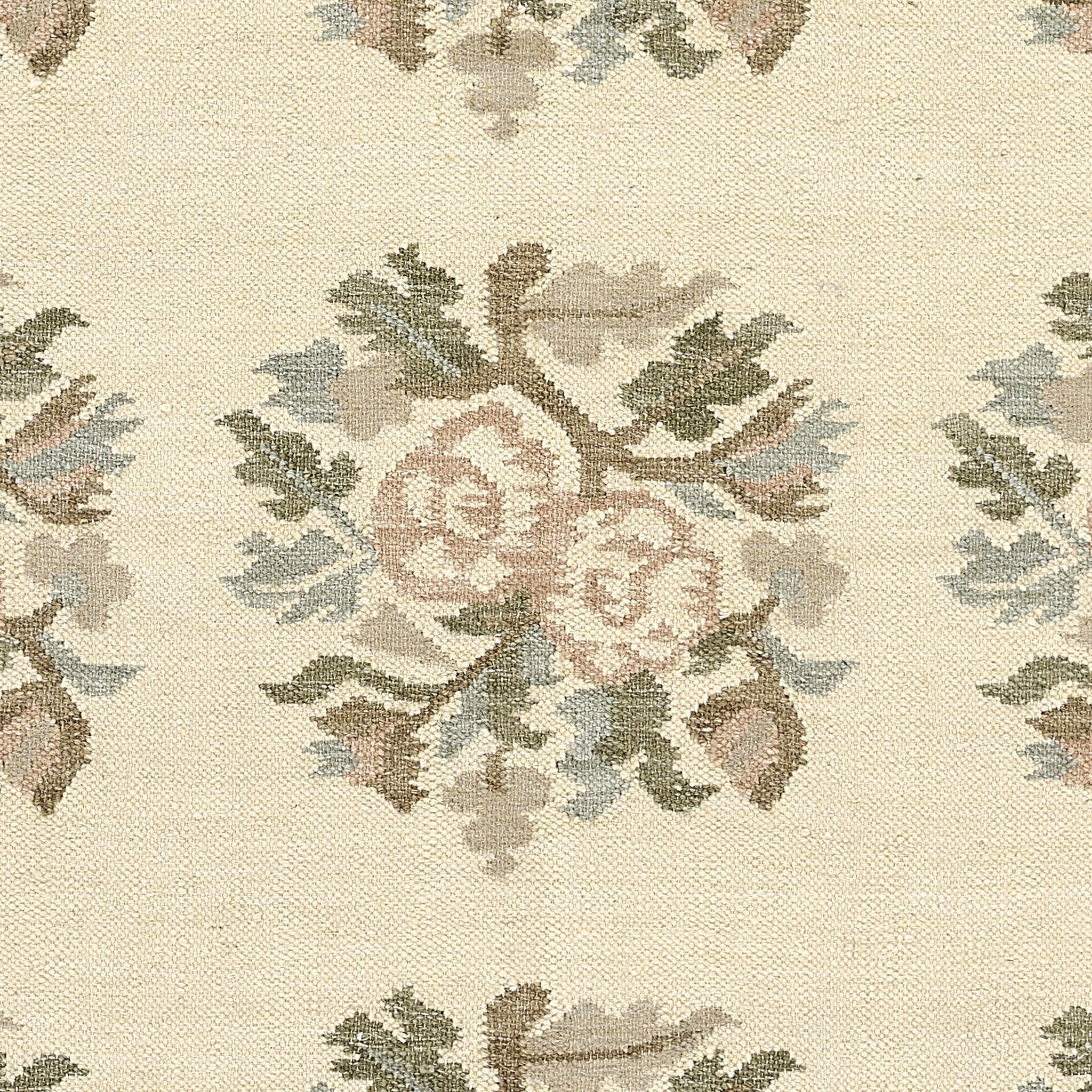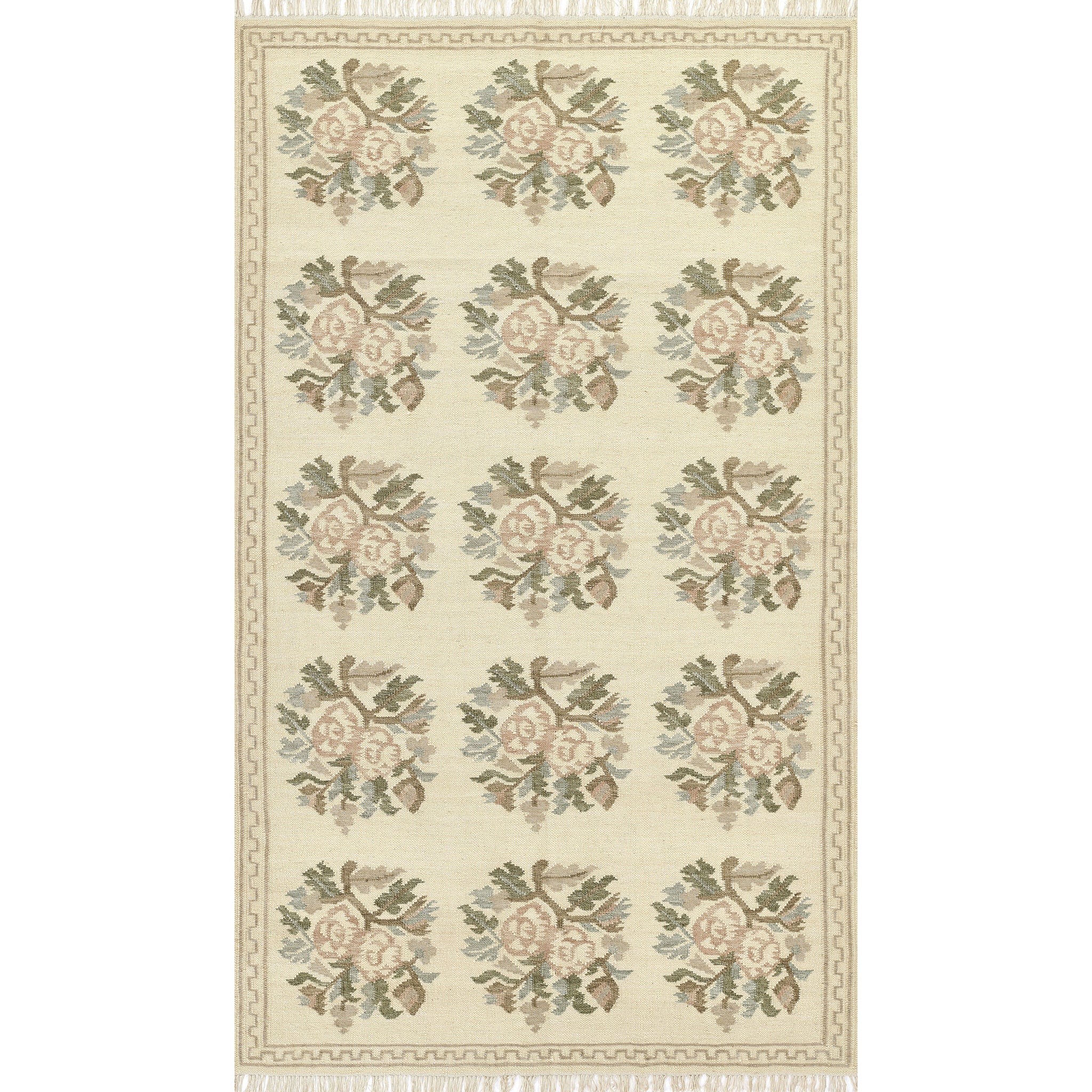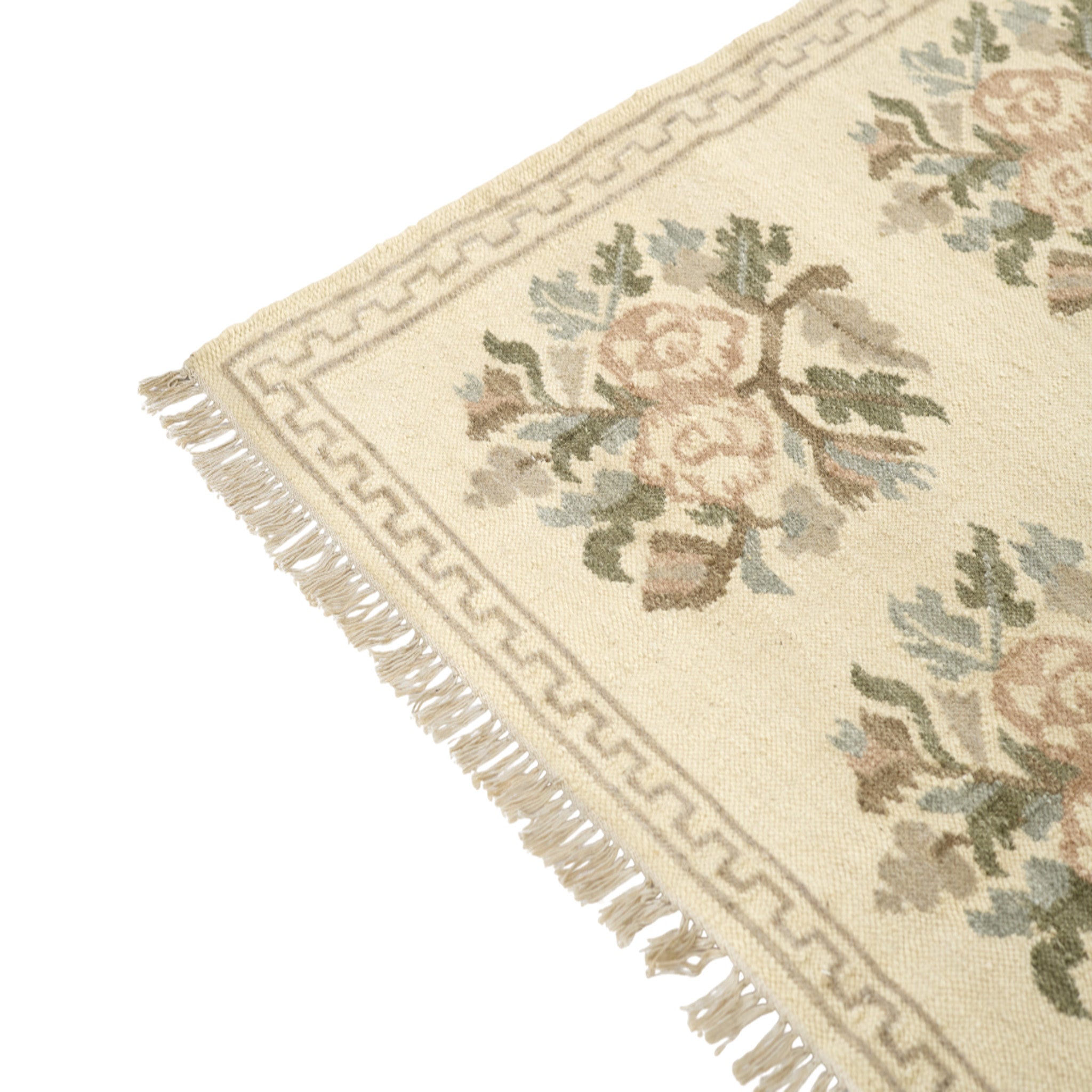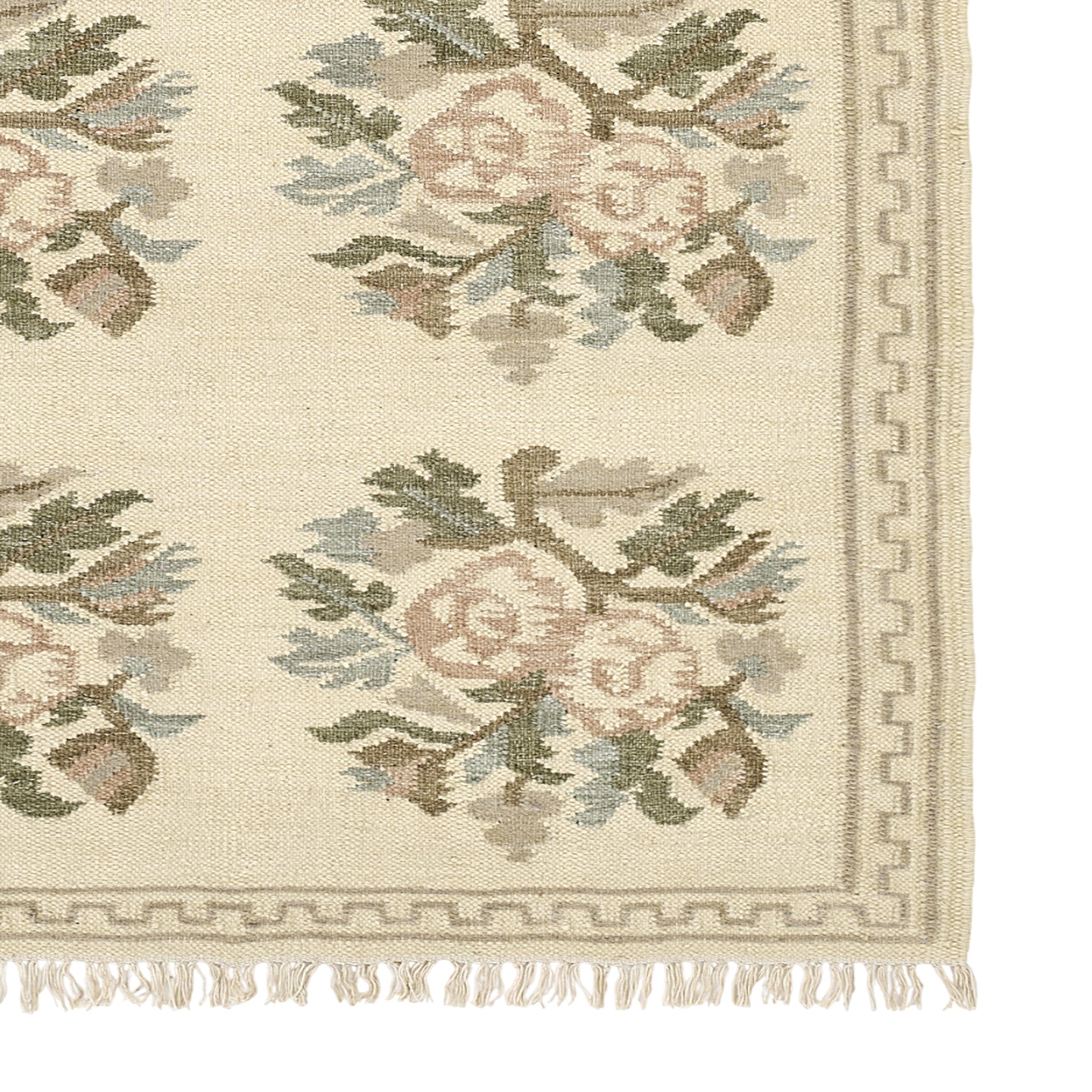 Graceful and nostalgic, this light and airy rug captures the essence of vintage femininity. Inspired by traditional Bessarabian textiles, its bouquet-style rose motifs bloom softly across a stone blue background, accented by the classic blush tones of the rose. The hand-woven wool construction adds a layer of artisanal texture, while the fringed edges and classic border lend an elegant, collected feel. Whether anchoring a romantic bedroom or adding warmth to a refined sitting room, this rug offers timeless sophistication with a gentle, cottagecore sensibility.