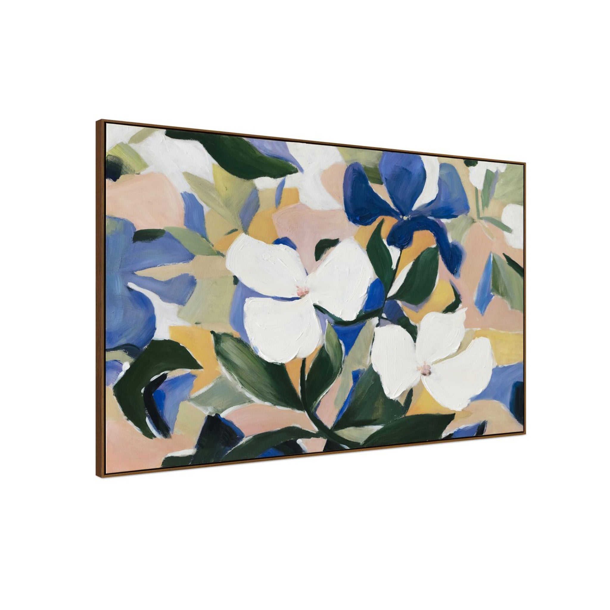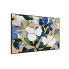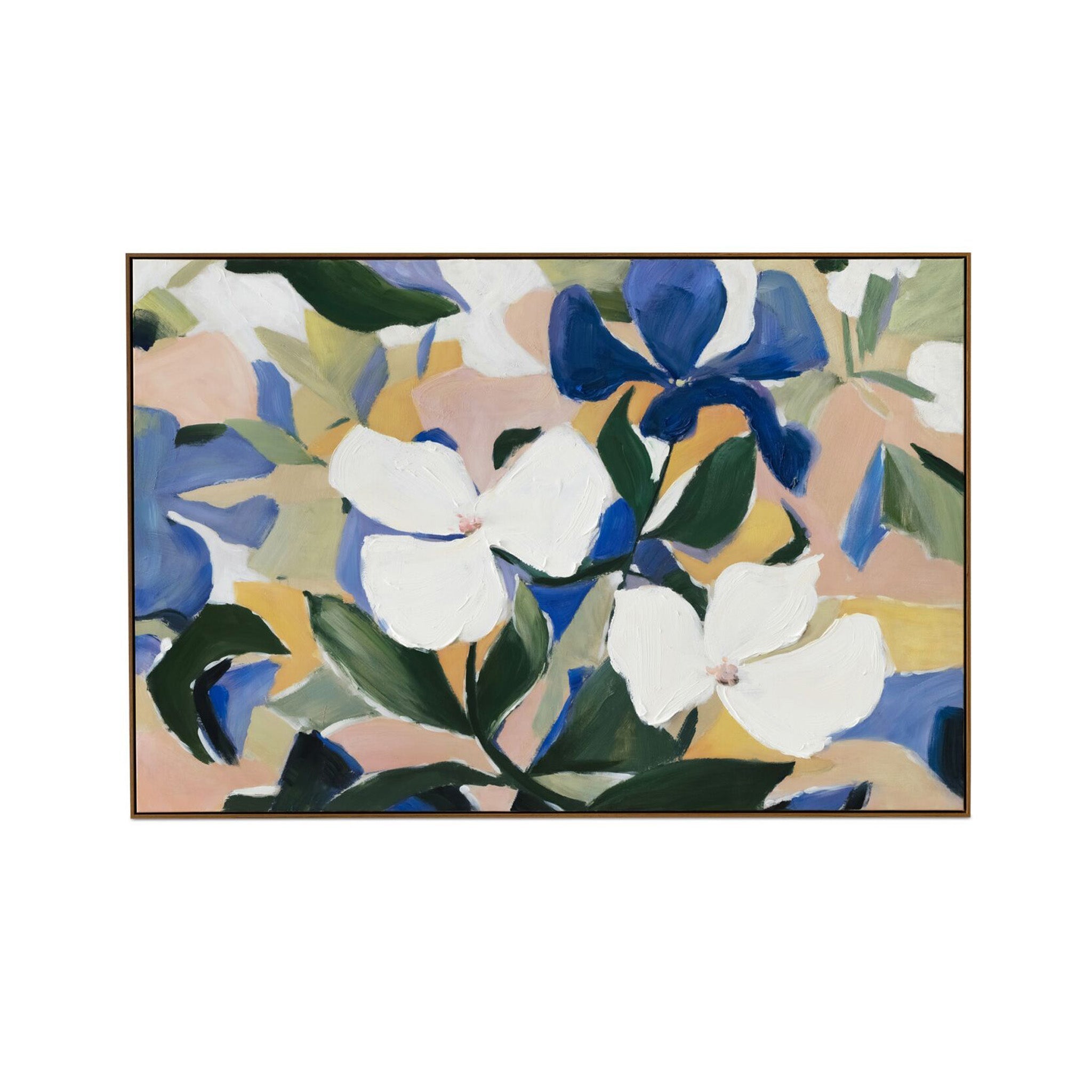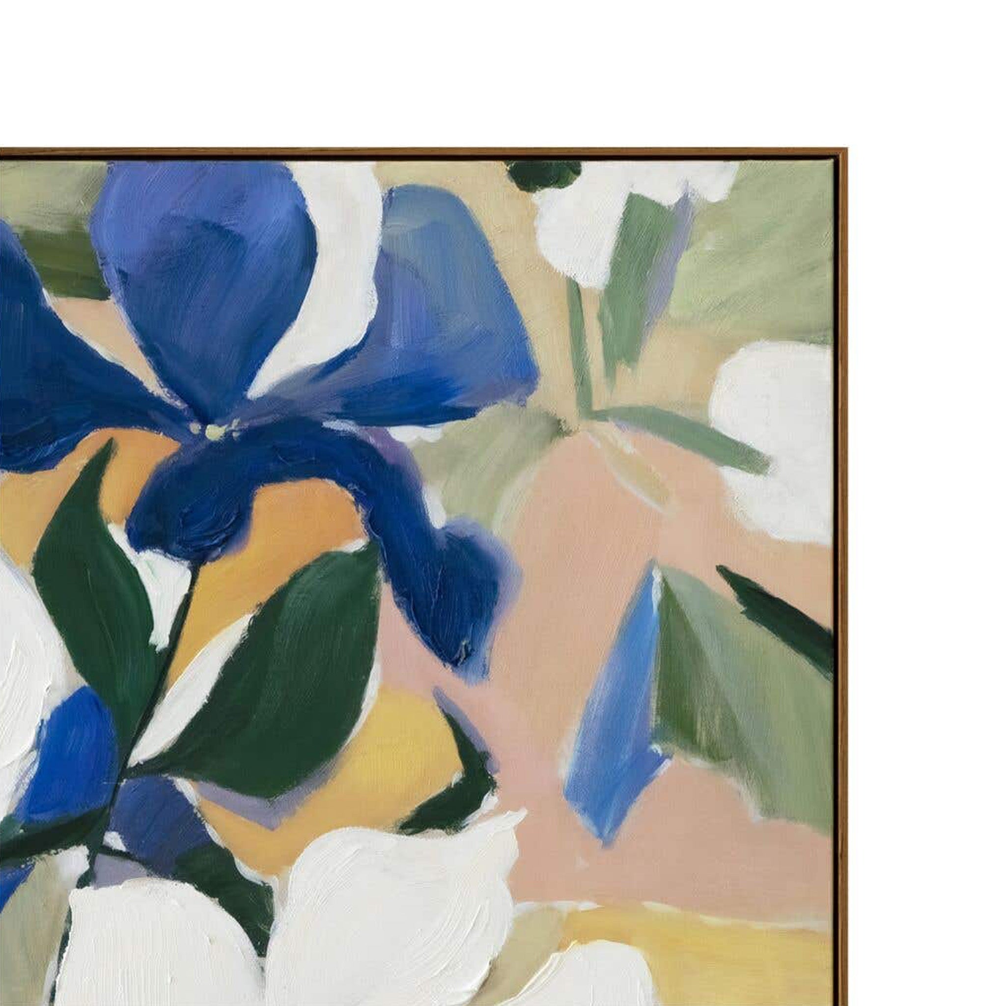 When petals meet pastel. Essence softens the floral story with airy brushwork, flowing shapes, and a palette that leans warm, light, and a little bit whimsical. Its abstract blooms shift across a pastel background in vibrant, organic motion that's more emotion than still life. A solid wood frame adds natural grounding, keeping the whole piece feeling fresh and elevated. Bold yet gentle, it brings just enough bloom to brighten a space.