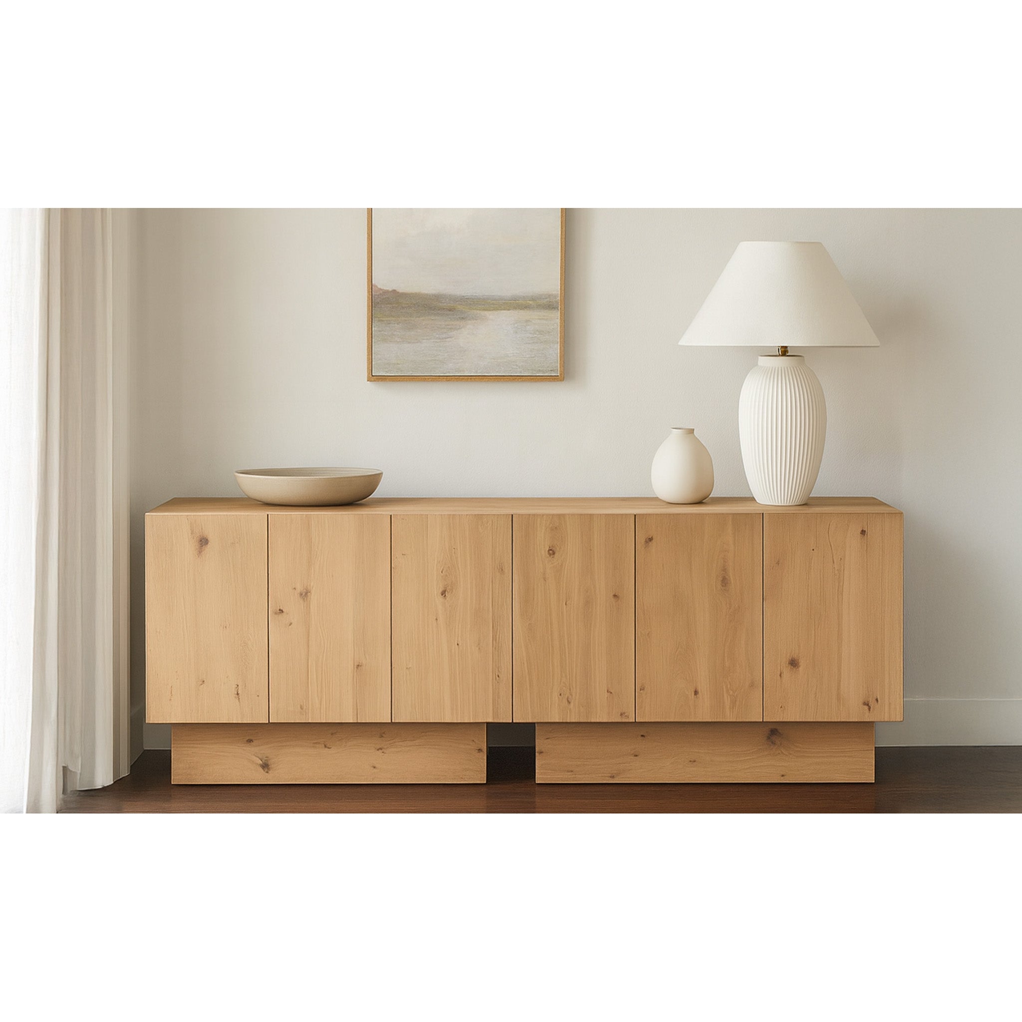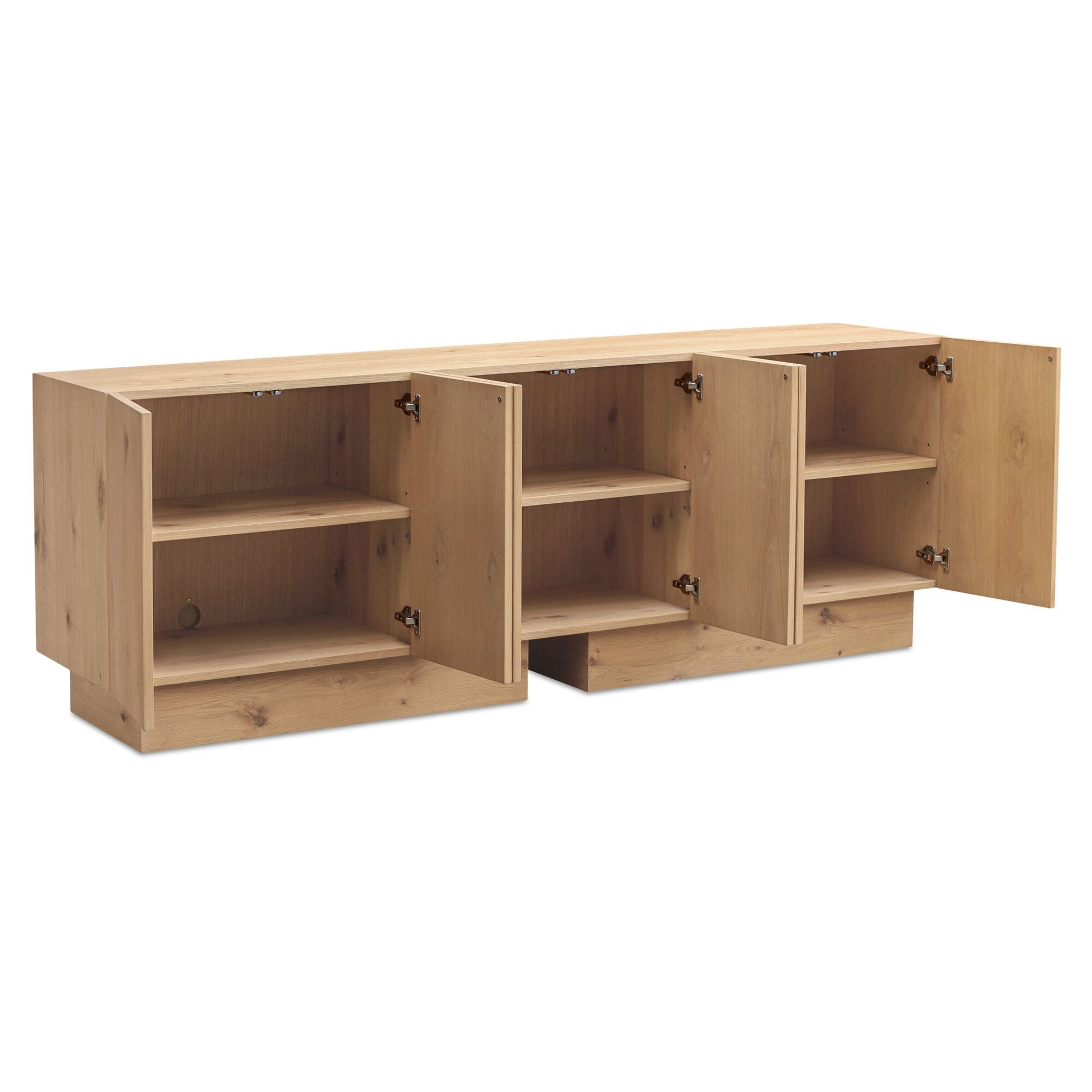 Block party. Shawn keeps it simple. Its clean, minimal silhouette is grounded by a bold, blocky base that add a sculptural edge. The thick oak construction shows off a rustic grain that brings warmth and texture in all the right ways. Solid build, serious storage.