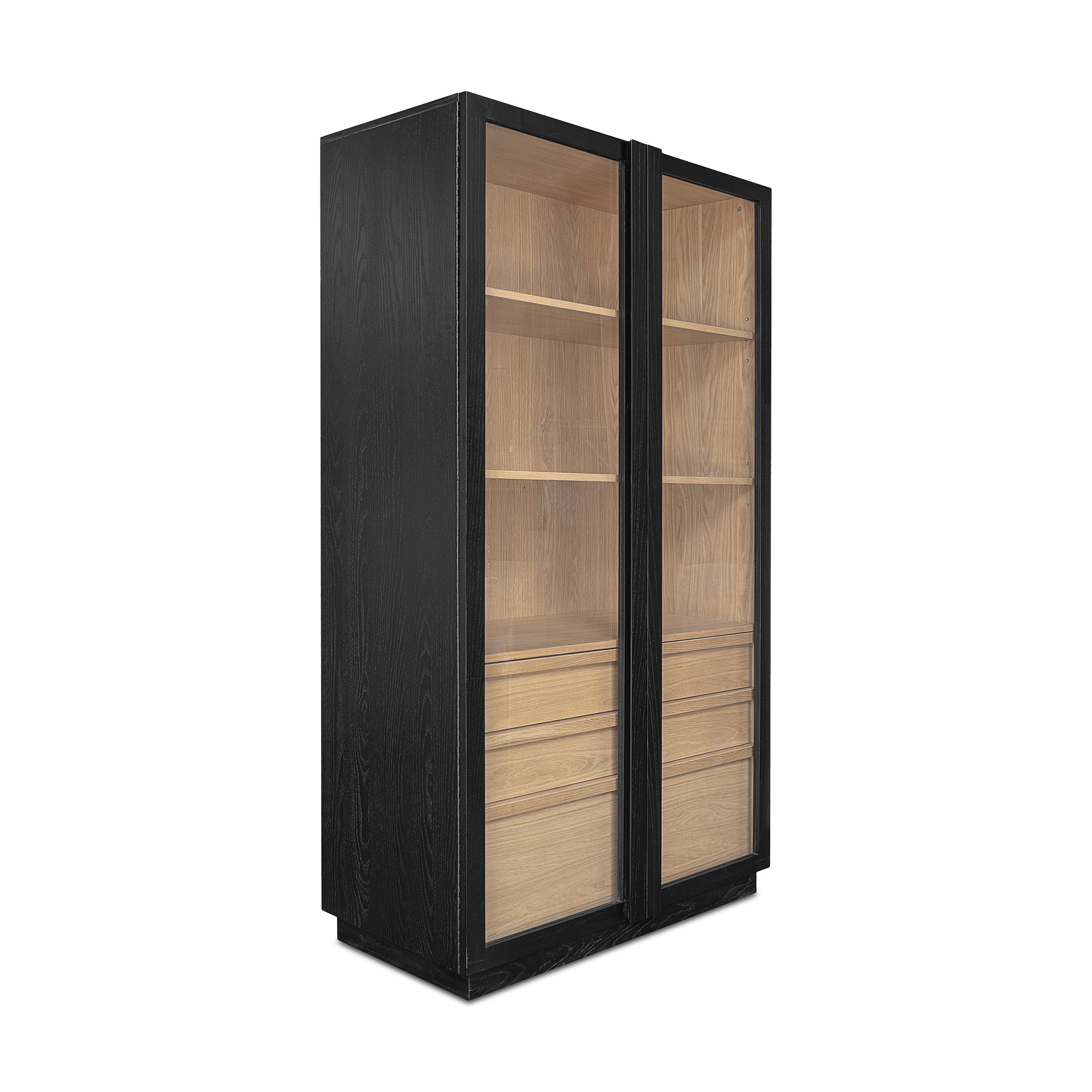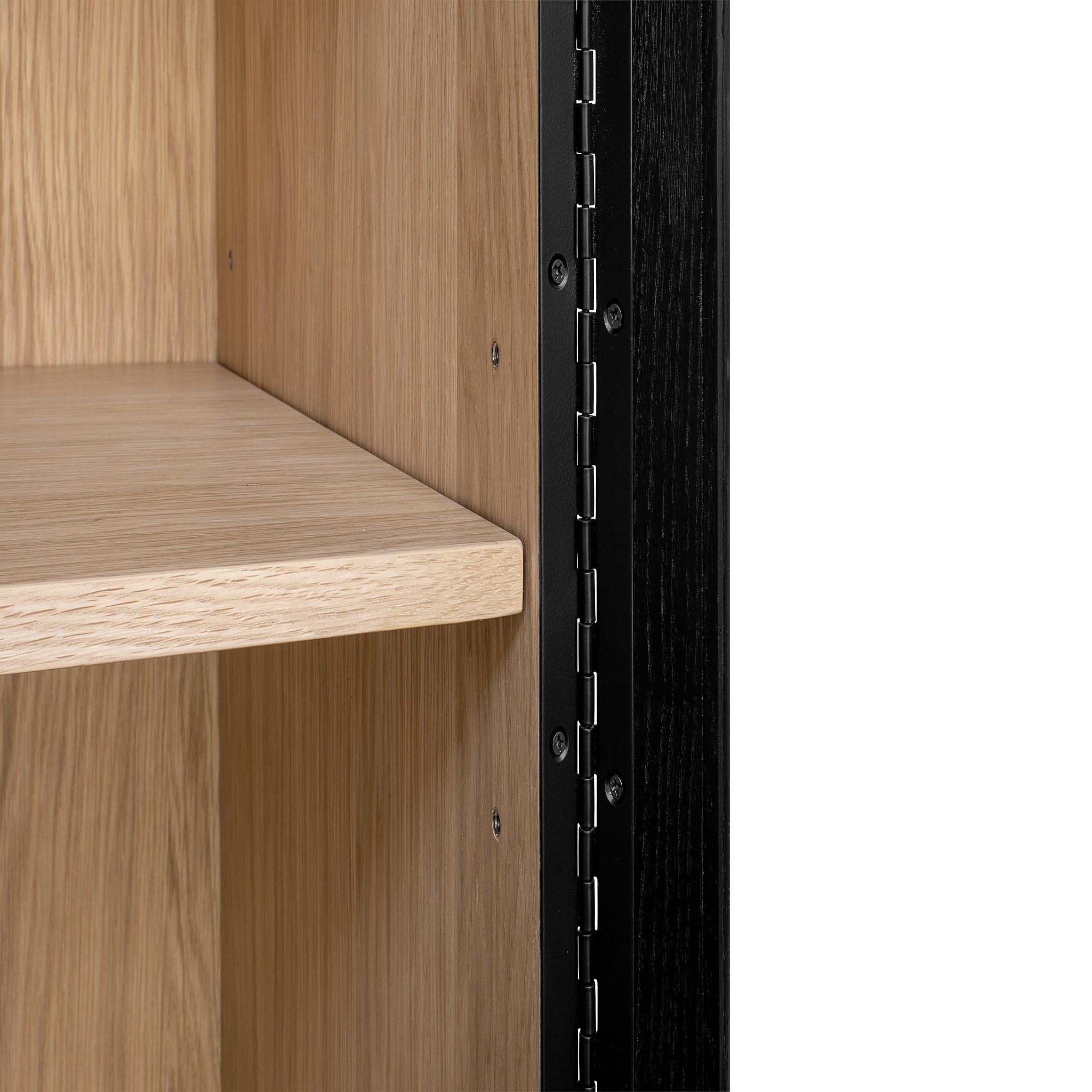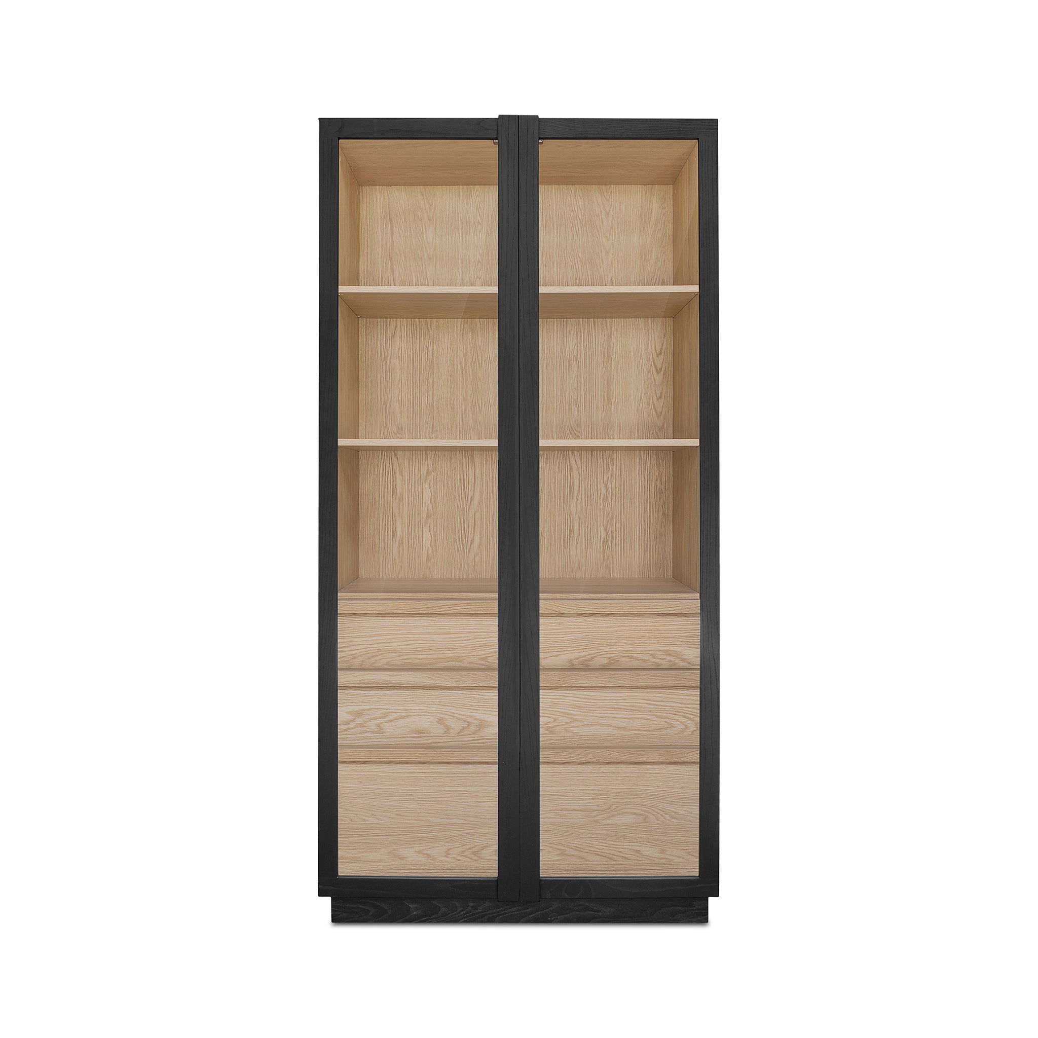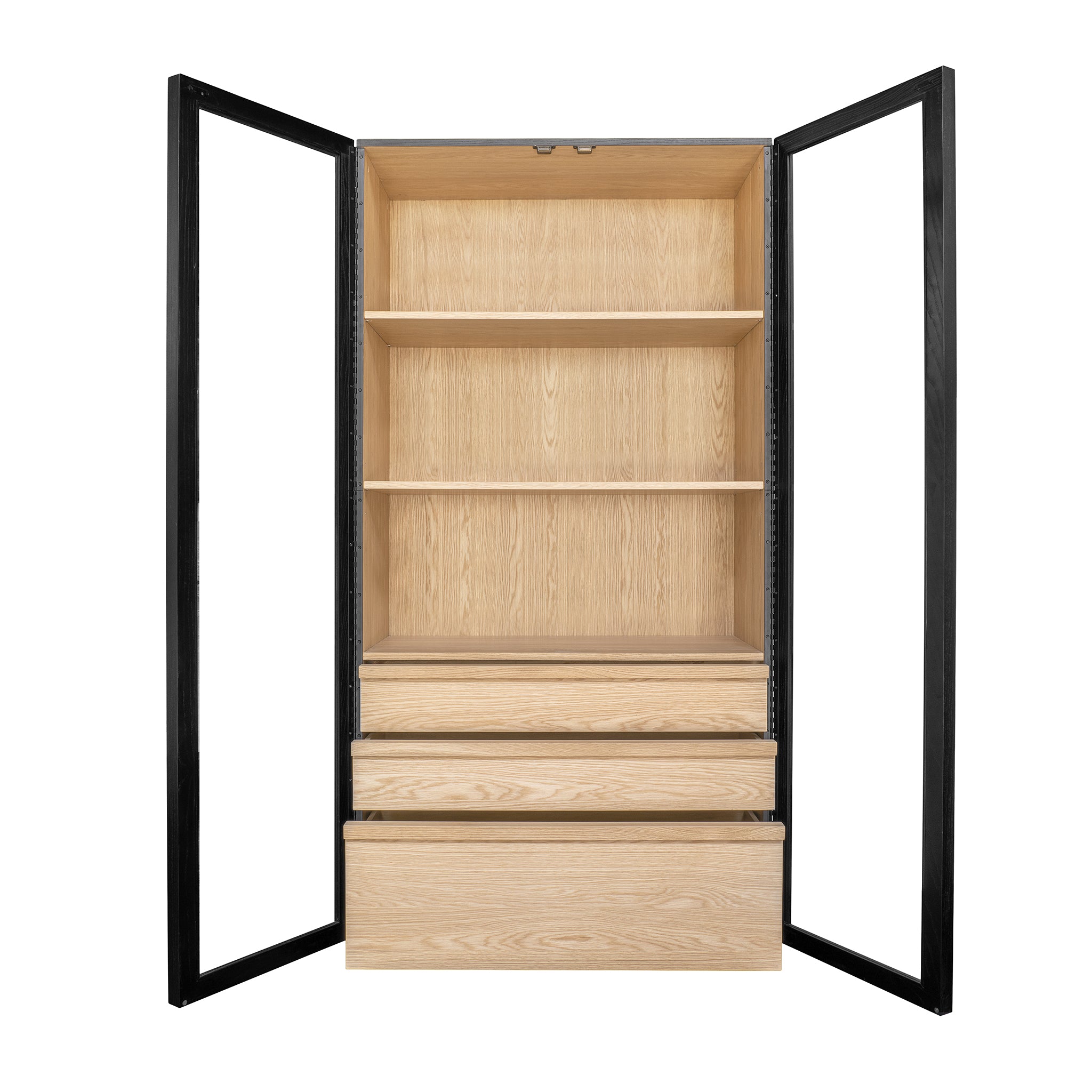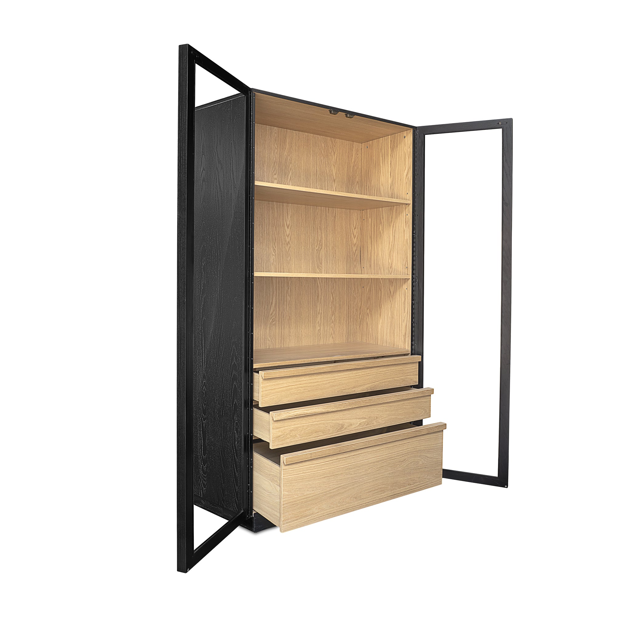 Inspirée par l'élégance épurée des poignées French Cleat, la vitrine Luka présente un design bicolore captivant avec un cadre extérieur noir élégant et un intérieur naturel. Les portes en verre trempé offrent une élégante protection, tandis que les trois tiroirs intérieurs permettent de ranger soigneusement les petits objets. Avec son design moderne et polyvalent, cette pièce allie rangement pratique et présentation élégante.